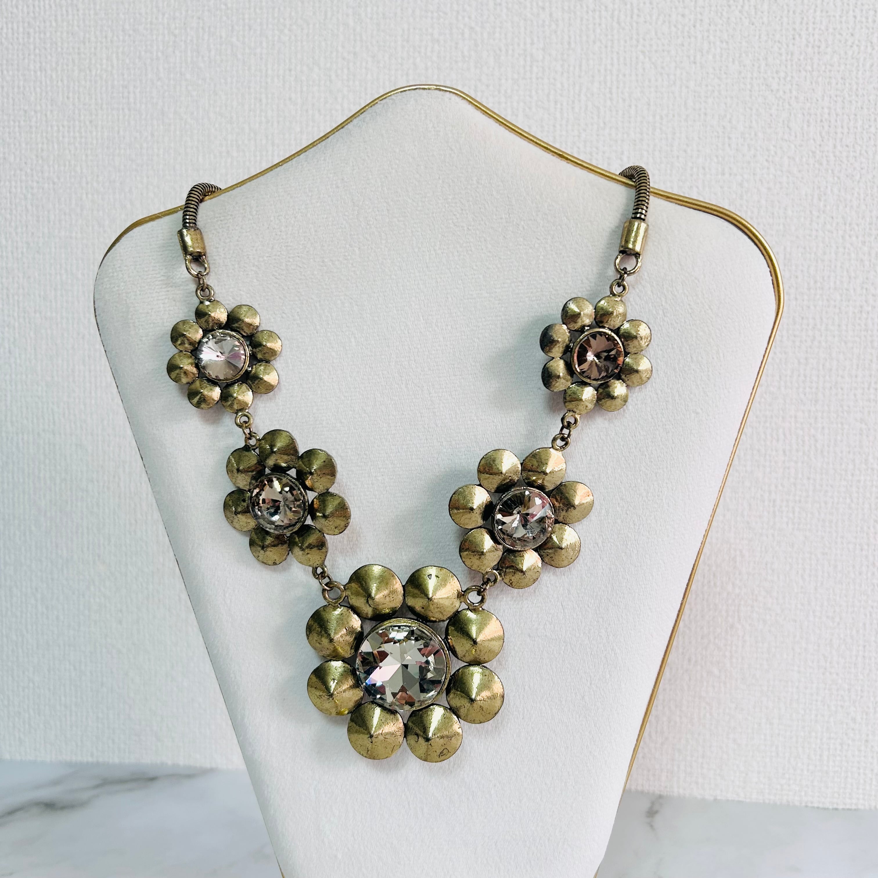 アンティーク調のゴールドメタルに、カットの美しい大粒のクリスタルをあしらったフラワーモチーフネックレスです。
