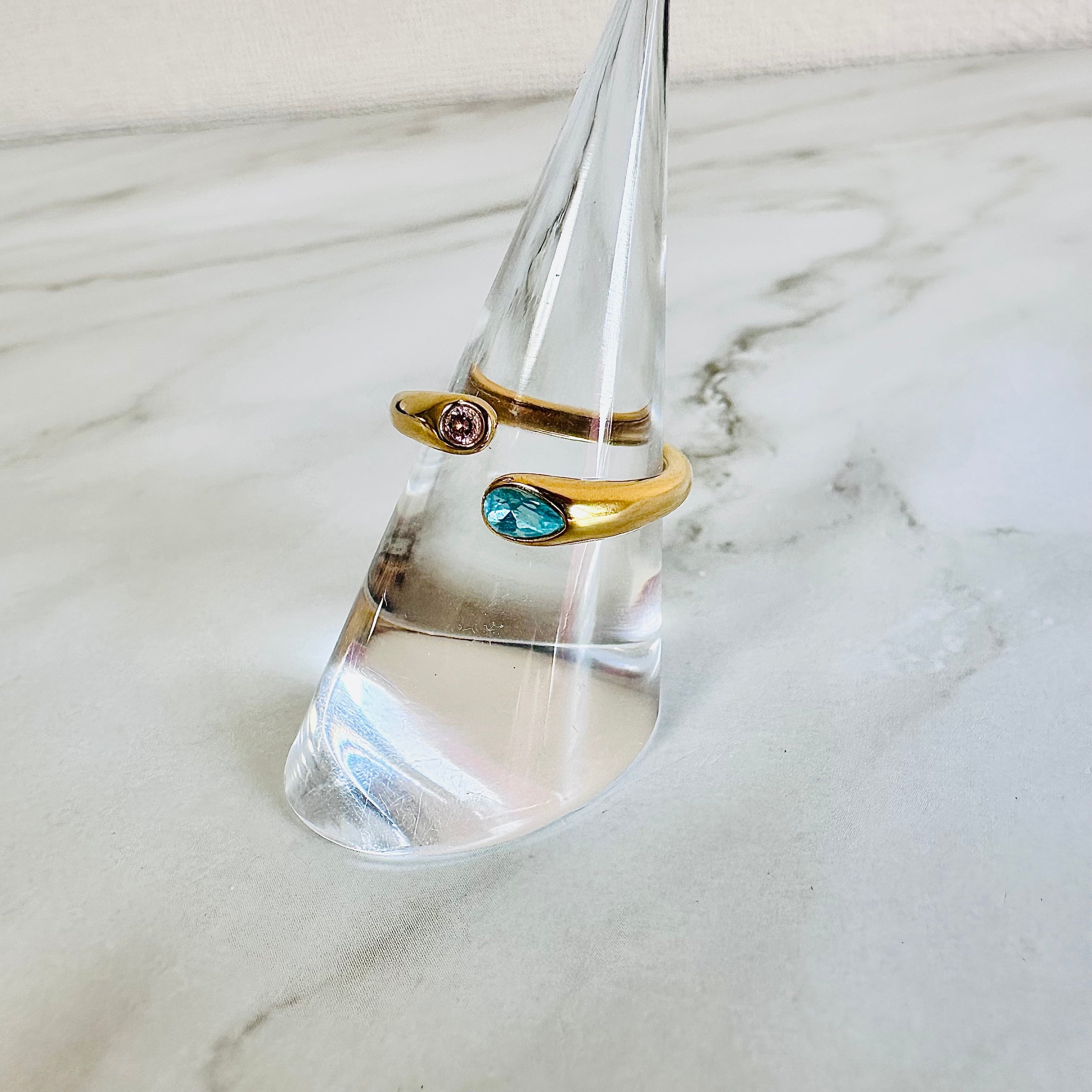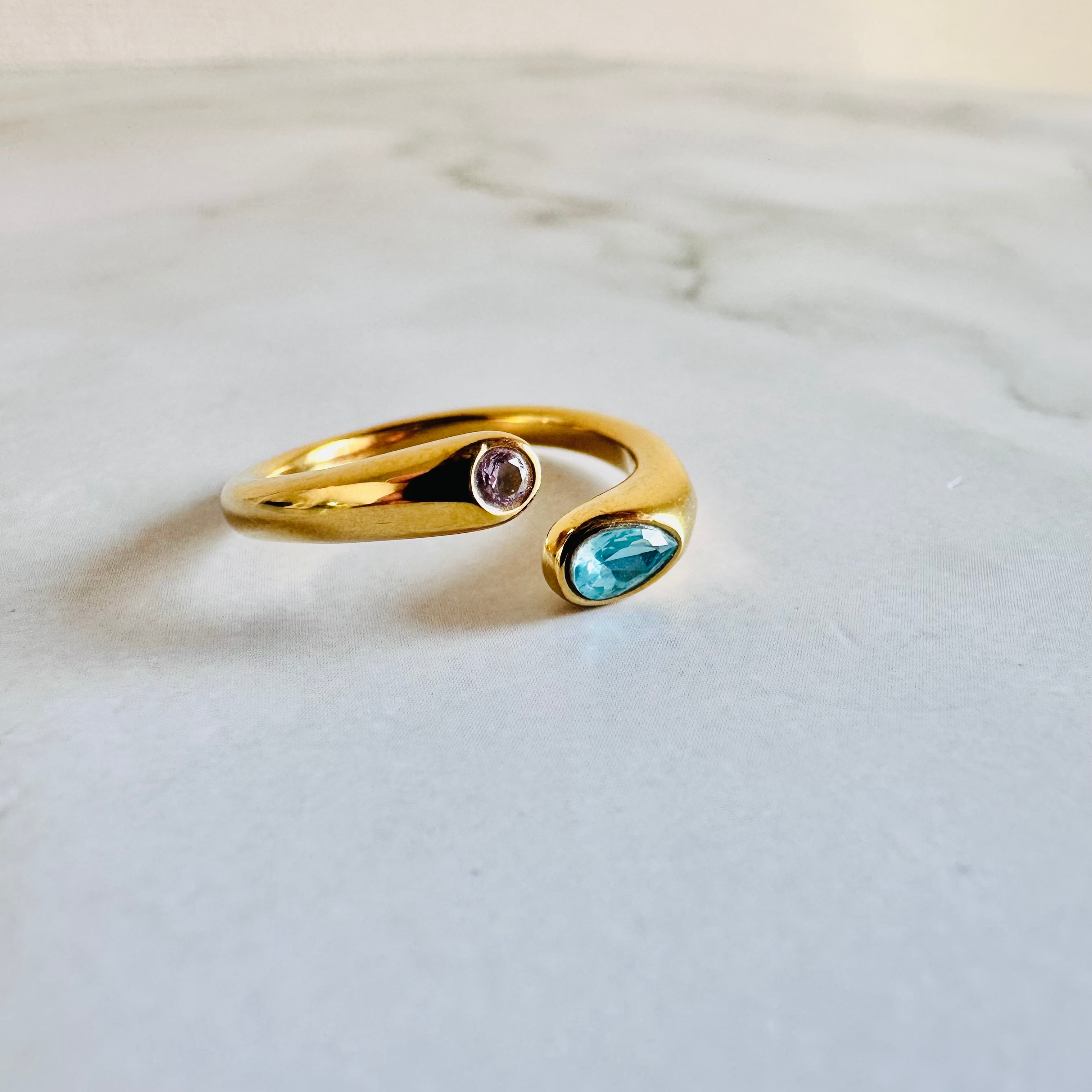 18金コーティングを施した艶やかなアームに、ジルコニアのカラークリスタルをあしらったリングです。