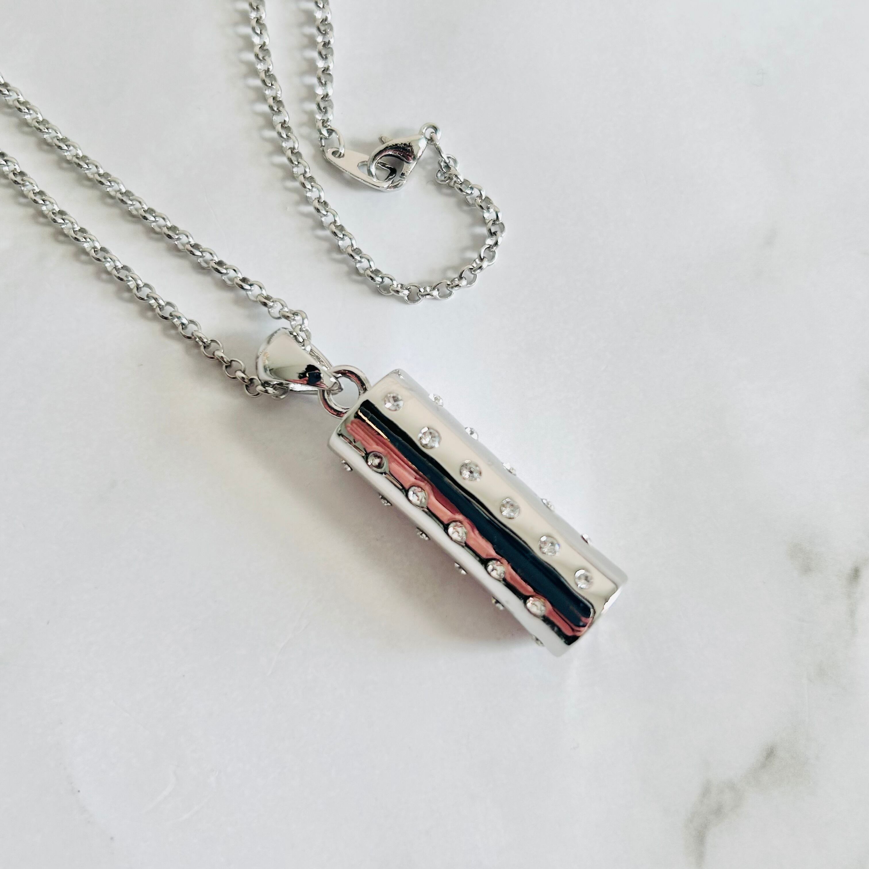 すっきりとした縦長のバータイプモチーフに、繊細なクリスタルが整然と並び、光を受けるたびに凛とした輝きを放ちます。