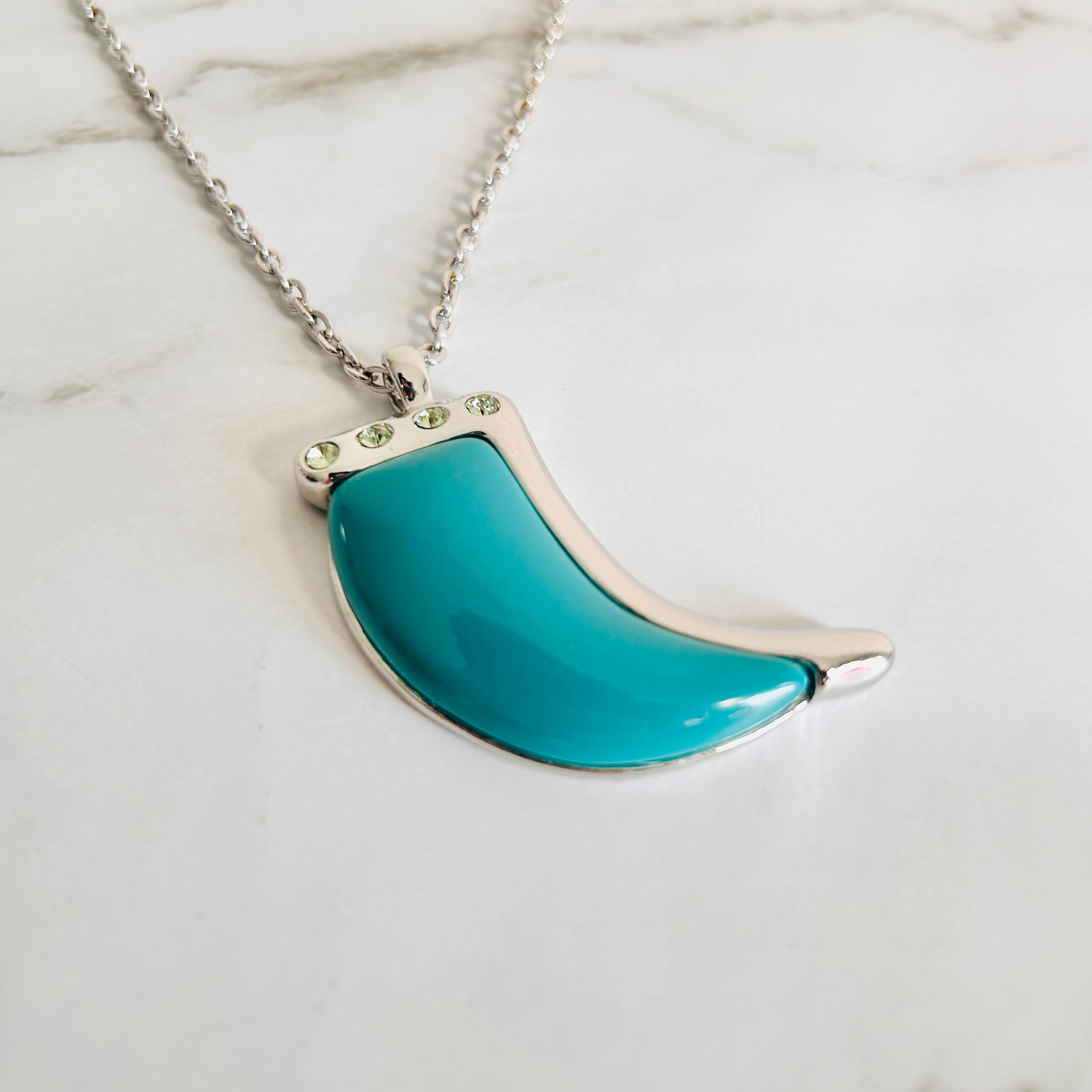 鮮やかなターコイズブルーが目を惹く、おしゃれなモチーフが印象的なロングネックレスです。