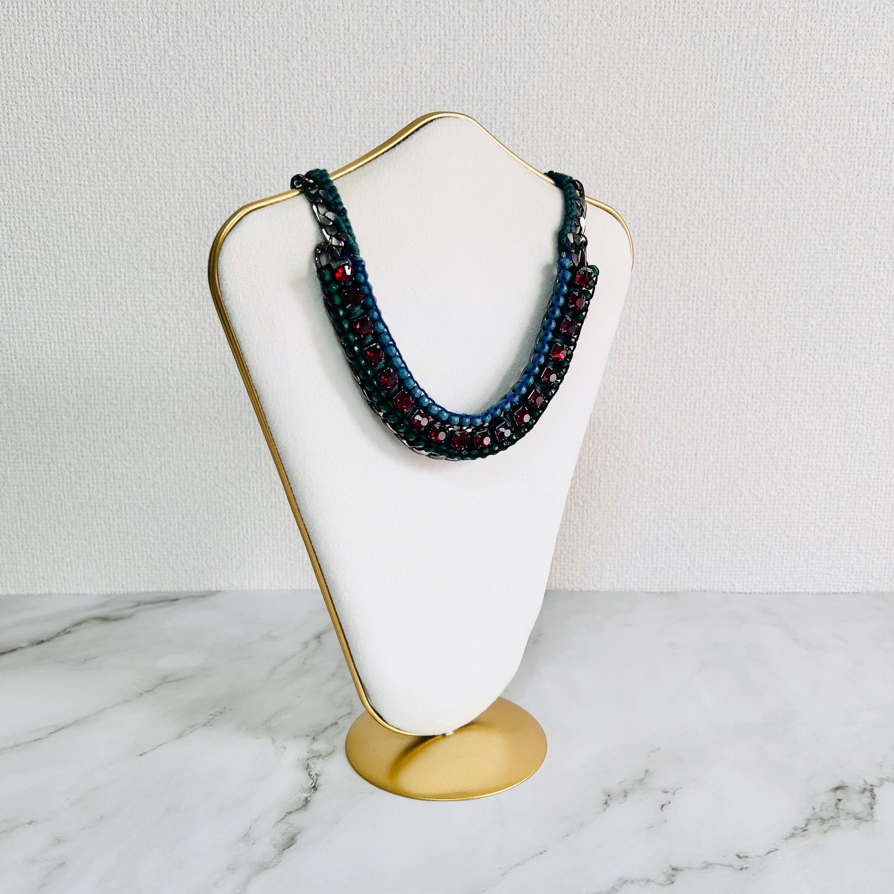 深みのあるグリーンをベースに、美しいレッドクリスタルをリズミカルにあしらった印象的なネックレスです。