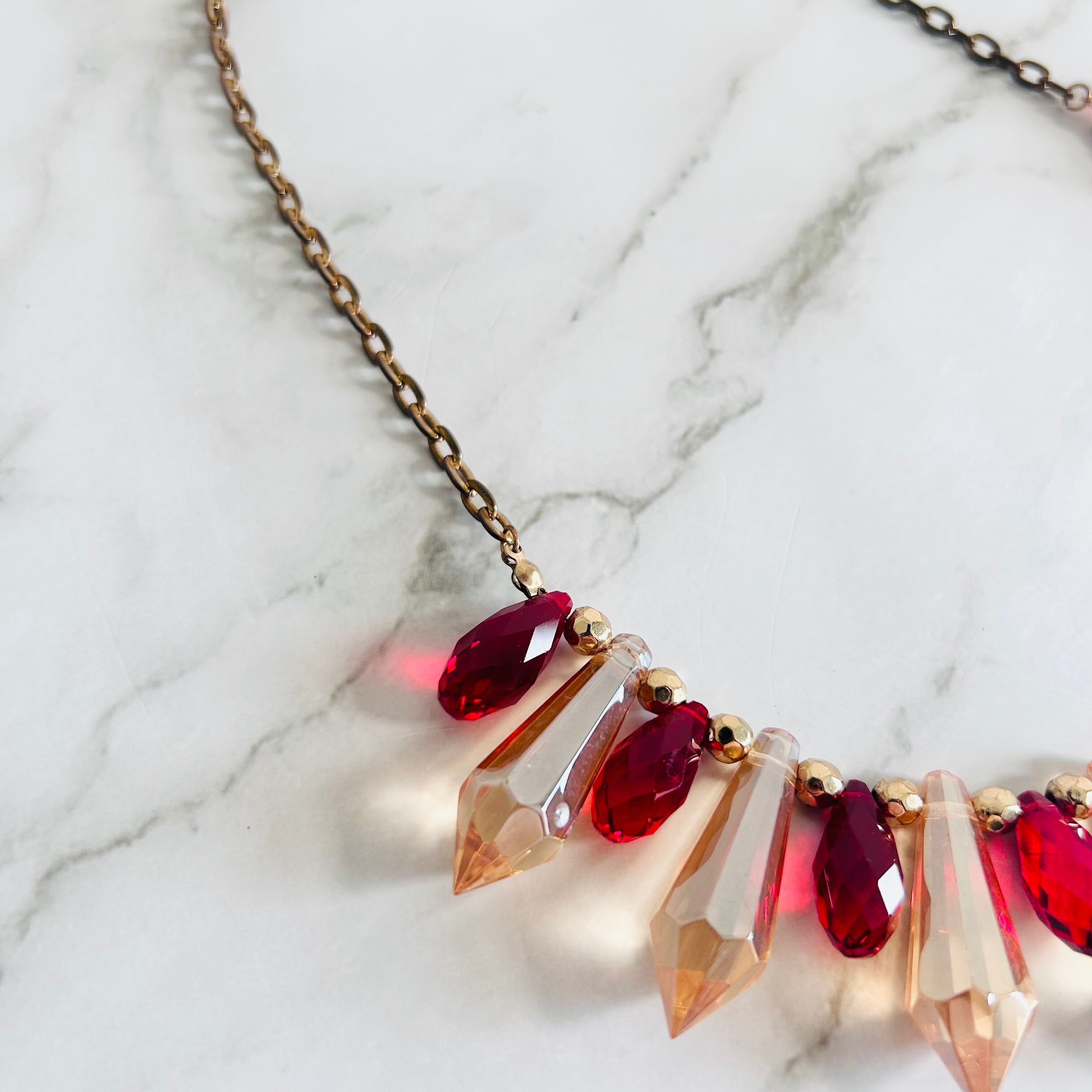 透明感のあるシャンパンカラーのクリスタルに、深みのあるレッドのドロップカットを組み合わせた、ドラマティックな配色。
