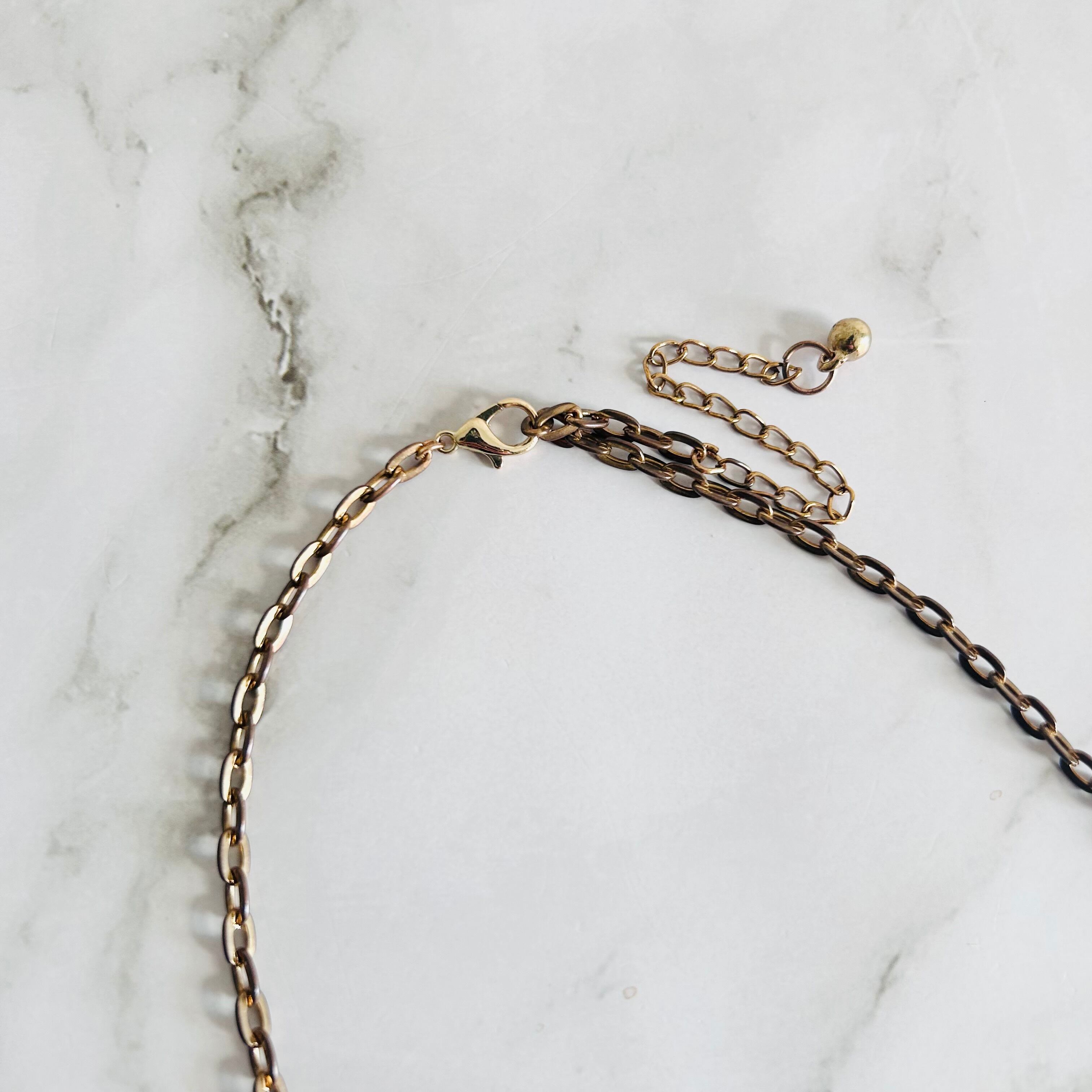 アンティークゴールドトーンのチェーンとパーツが全体に温かみを添え、華やかでありながらどこか上品な印象に。