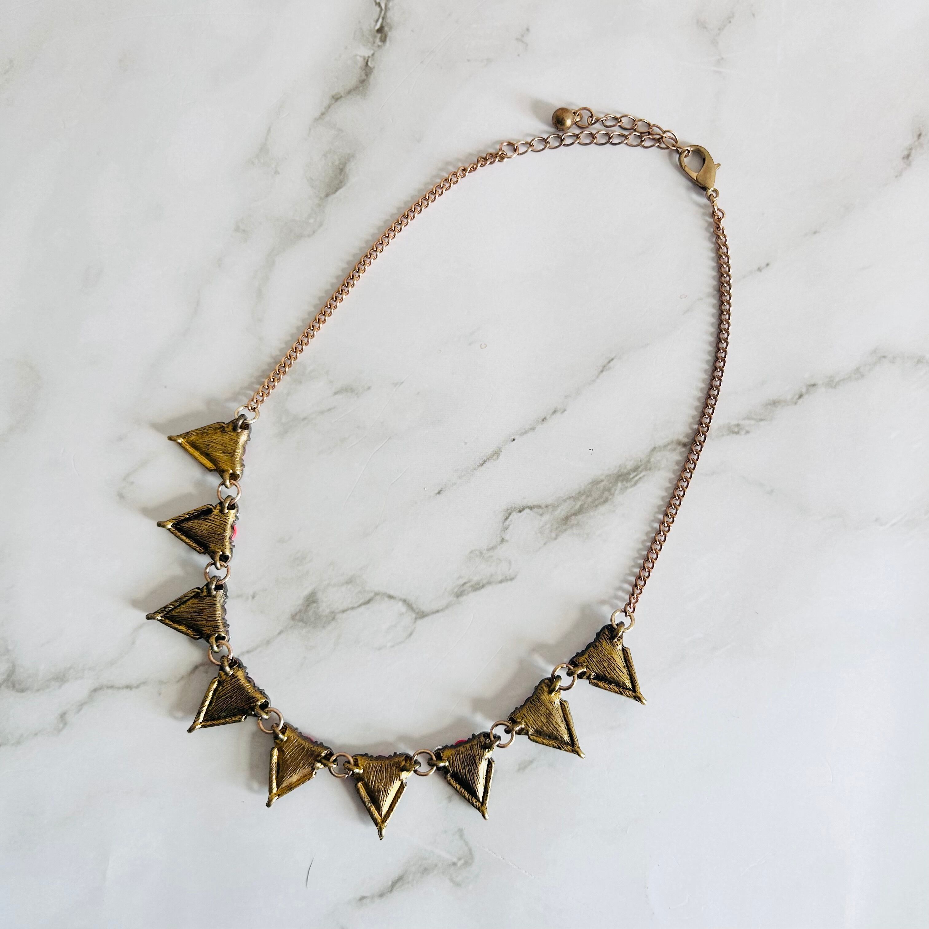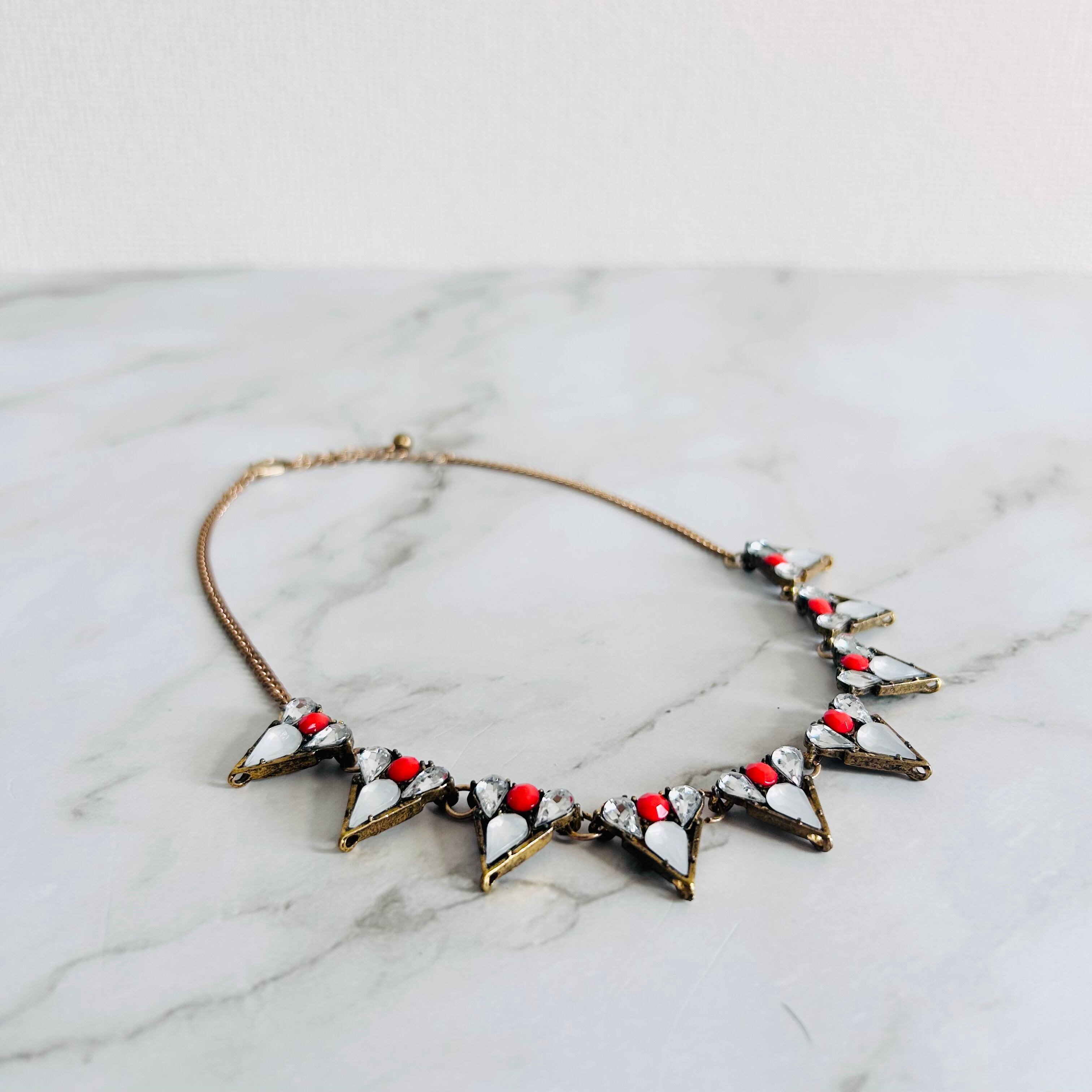 アンティーク調のゴールドチェーンに、透明感のあるクリア、やわらかな乳白色のホワイト、そしてオレンジビジューを組み合わせた華やかなネックレスです。