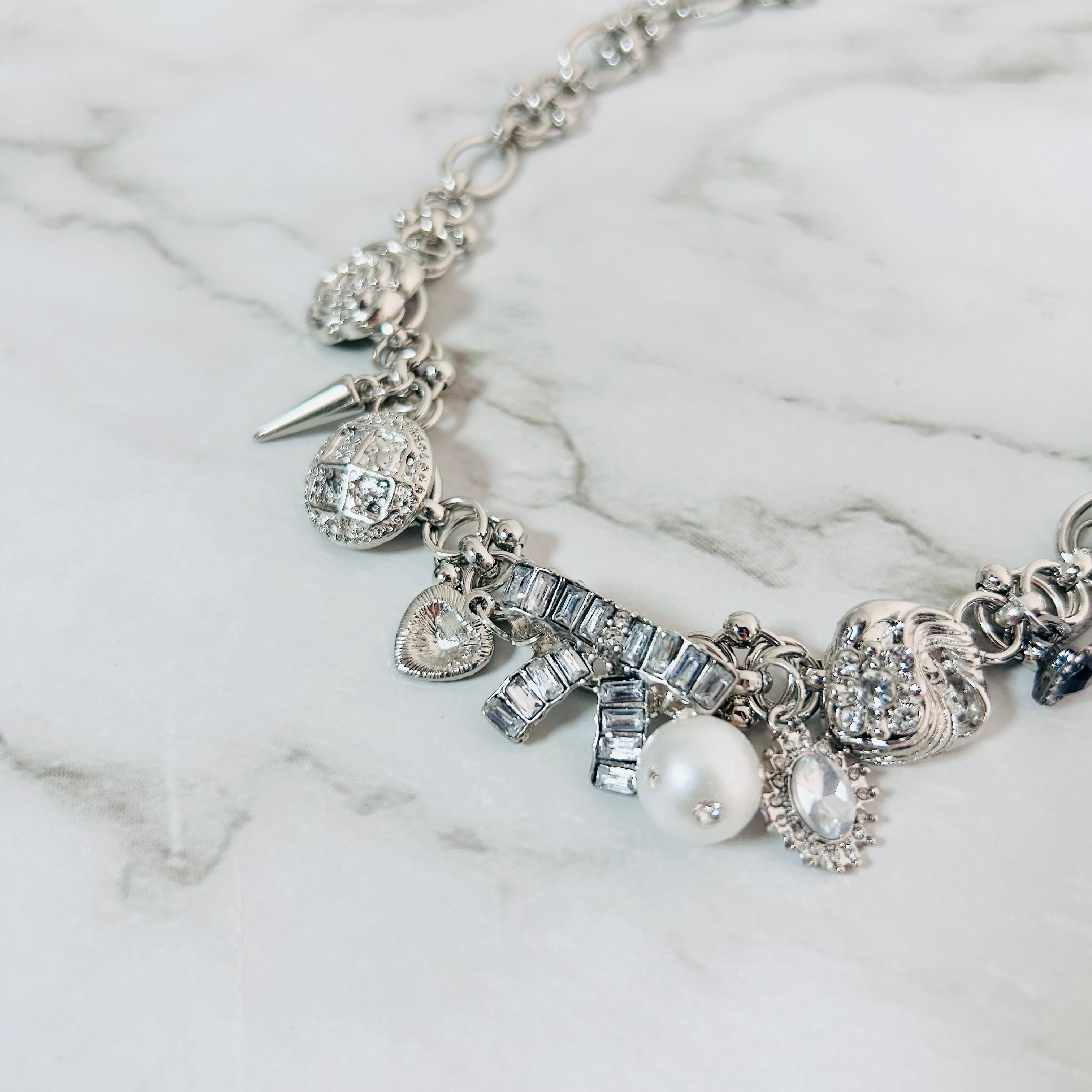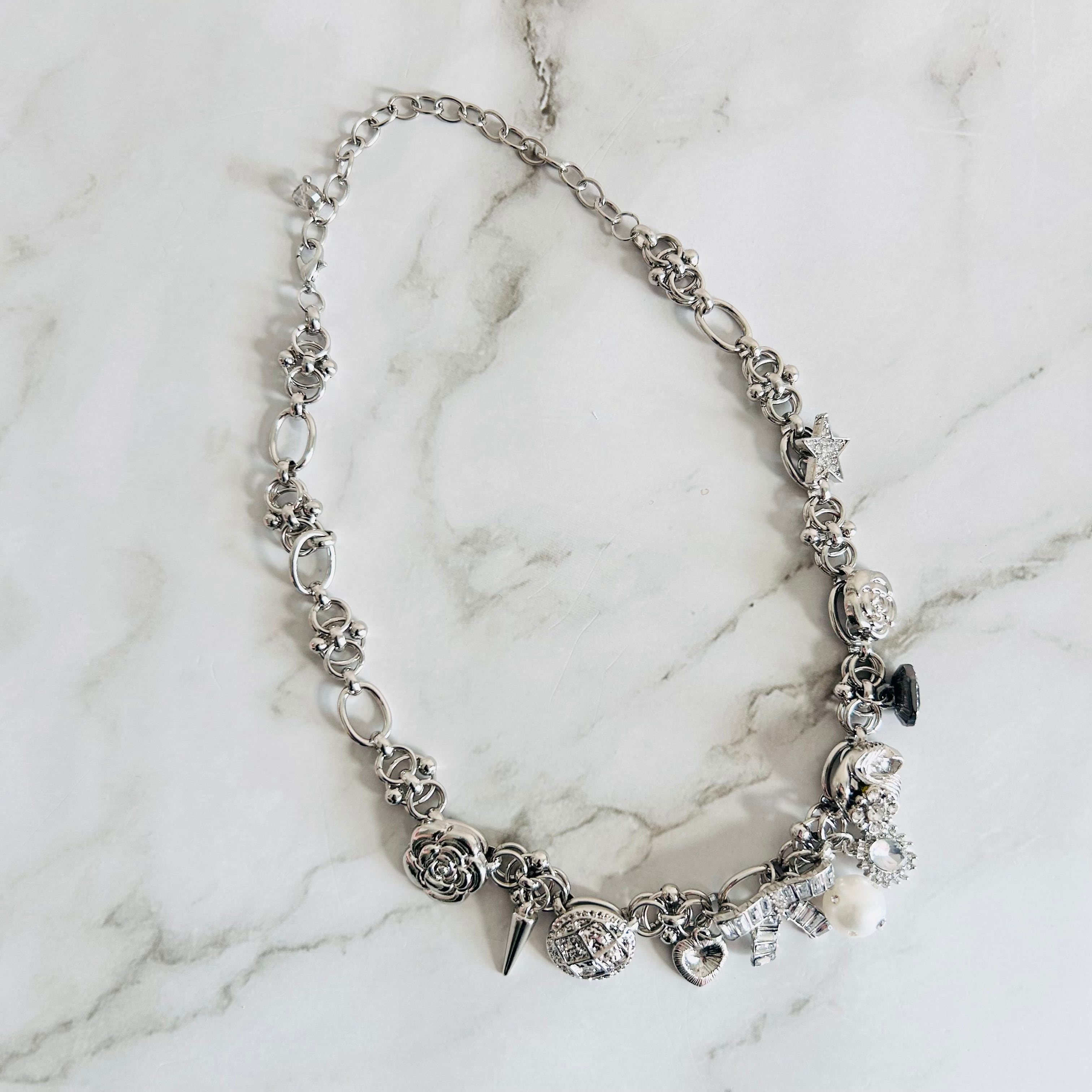 さまざまなチャームが連なる、印象的なシルバーネックレスです。
