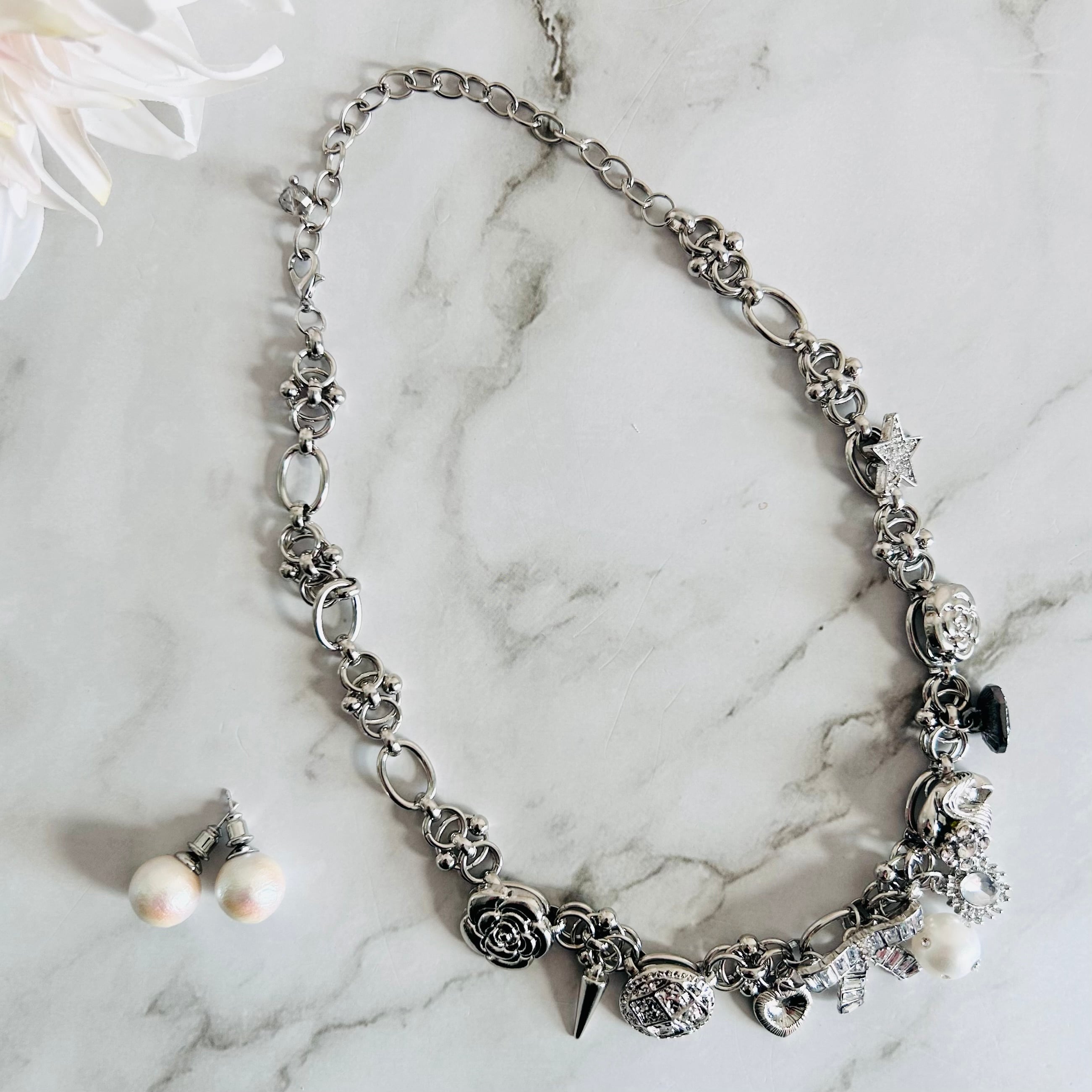 程よい存在感のあるシルバーチェーンに、星やハート、フラワーモチーフ、コイン、スパイクなど、表情の異なるチャームを贅沢にあしらいました。