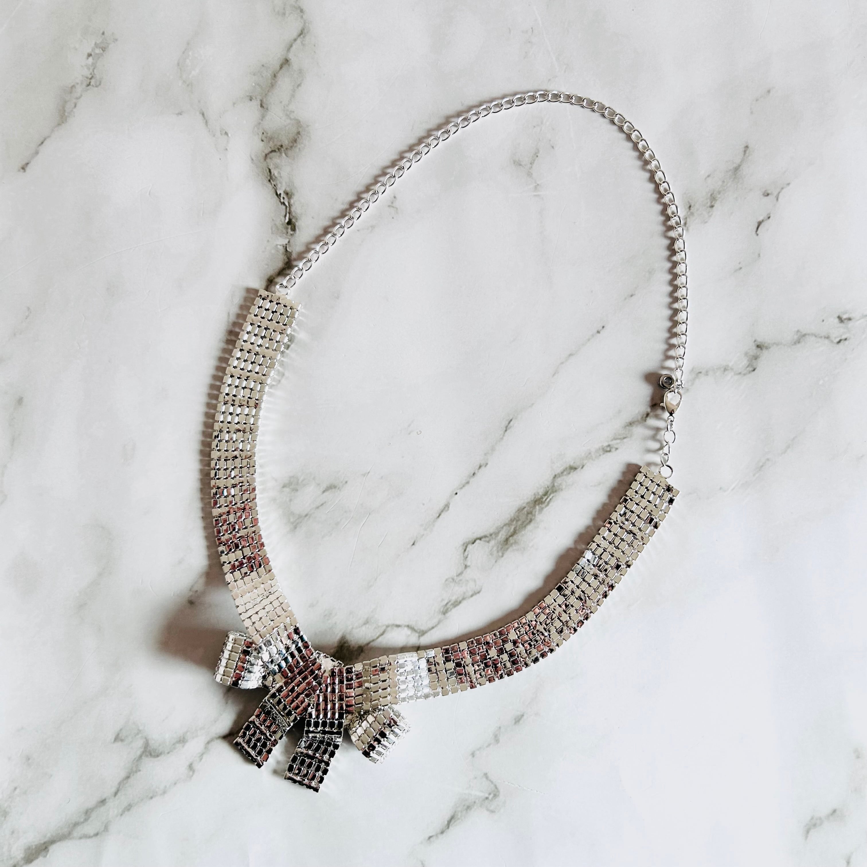 胸元に華やかな輝きを添える、リュクスなリボンネックレス。