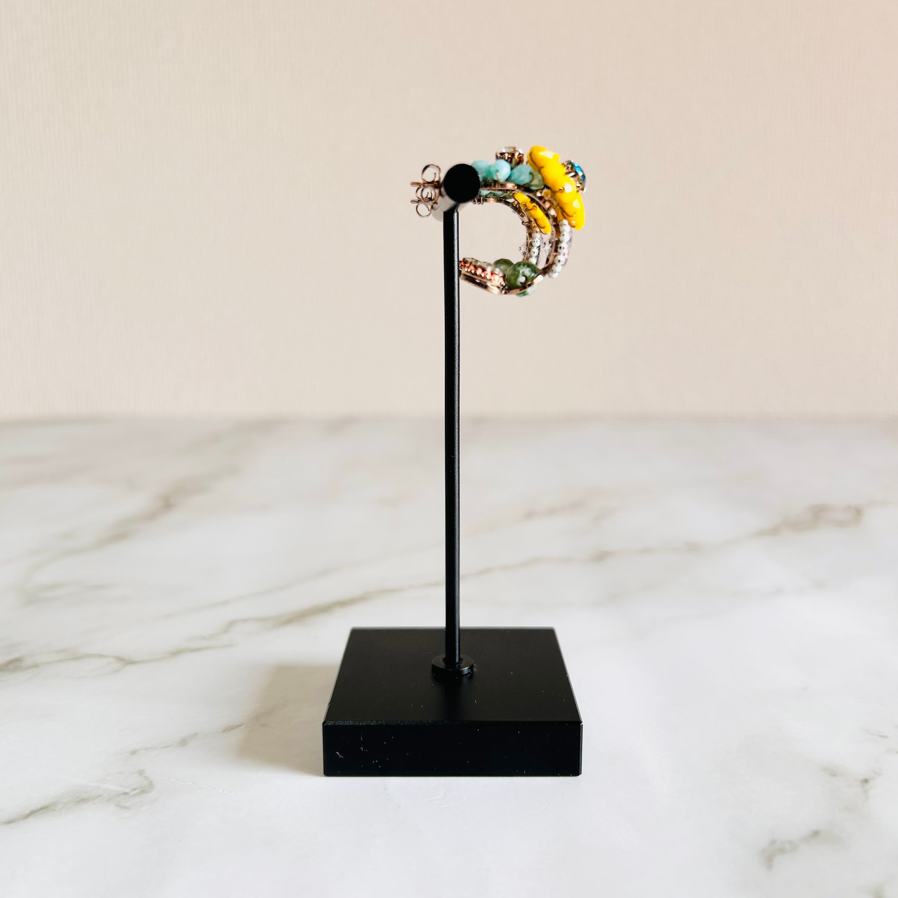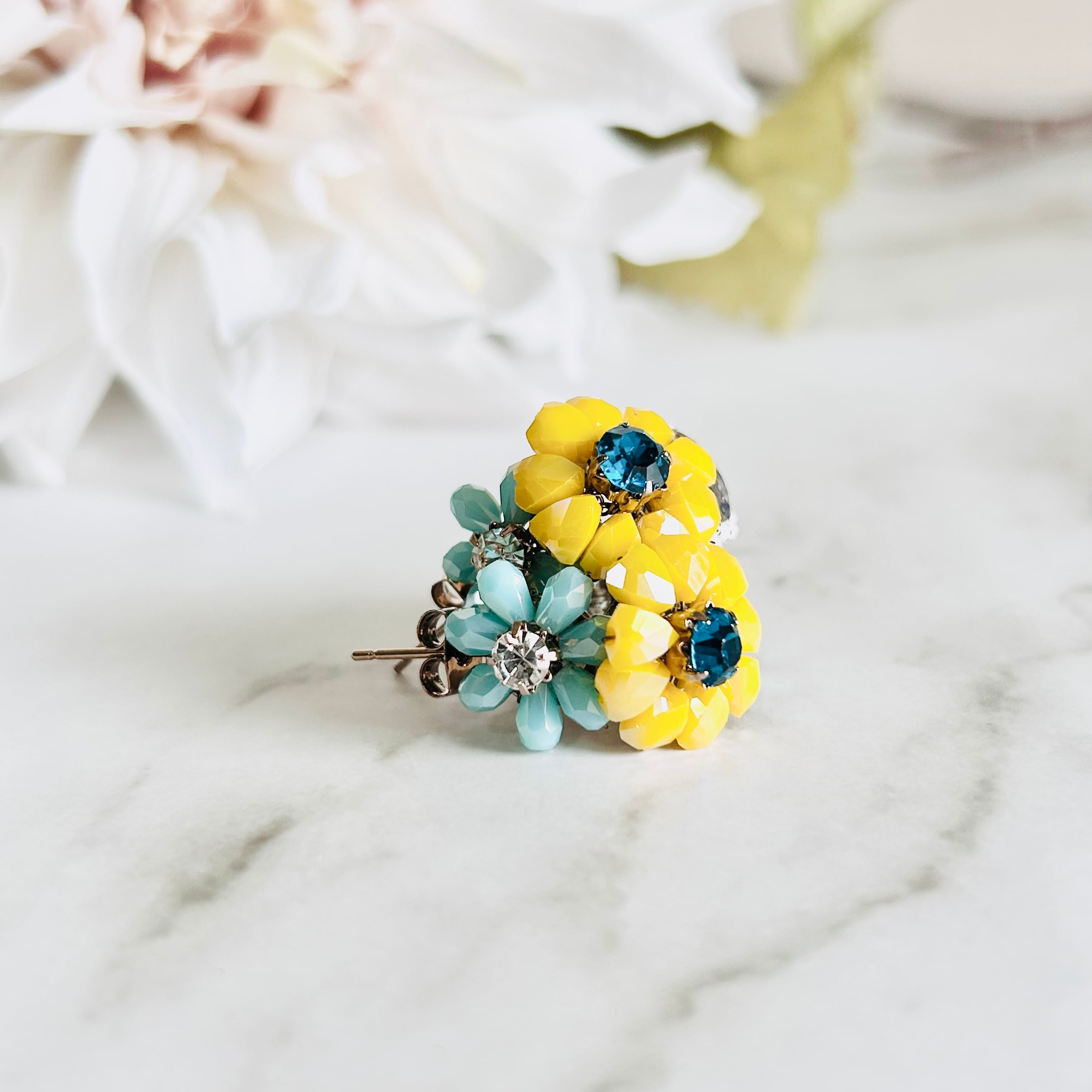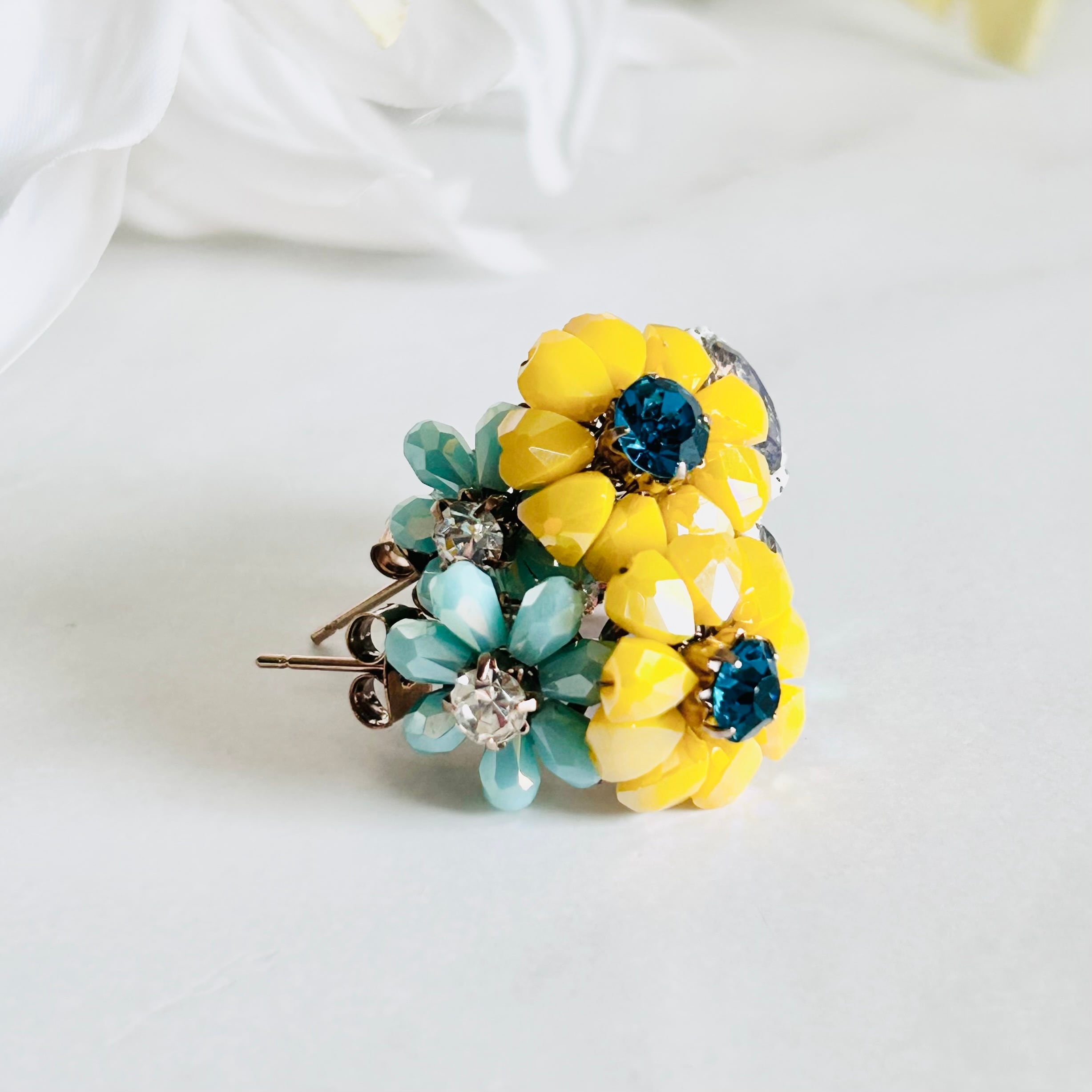フラワーモチーフのイエローのビジューに、オーロラ調に輝く透明感のあるストーンや深みのあるグリーンの天然石パーツを組み合わせることで、どの角度から見ても美しい立体感のある輝きを演出。