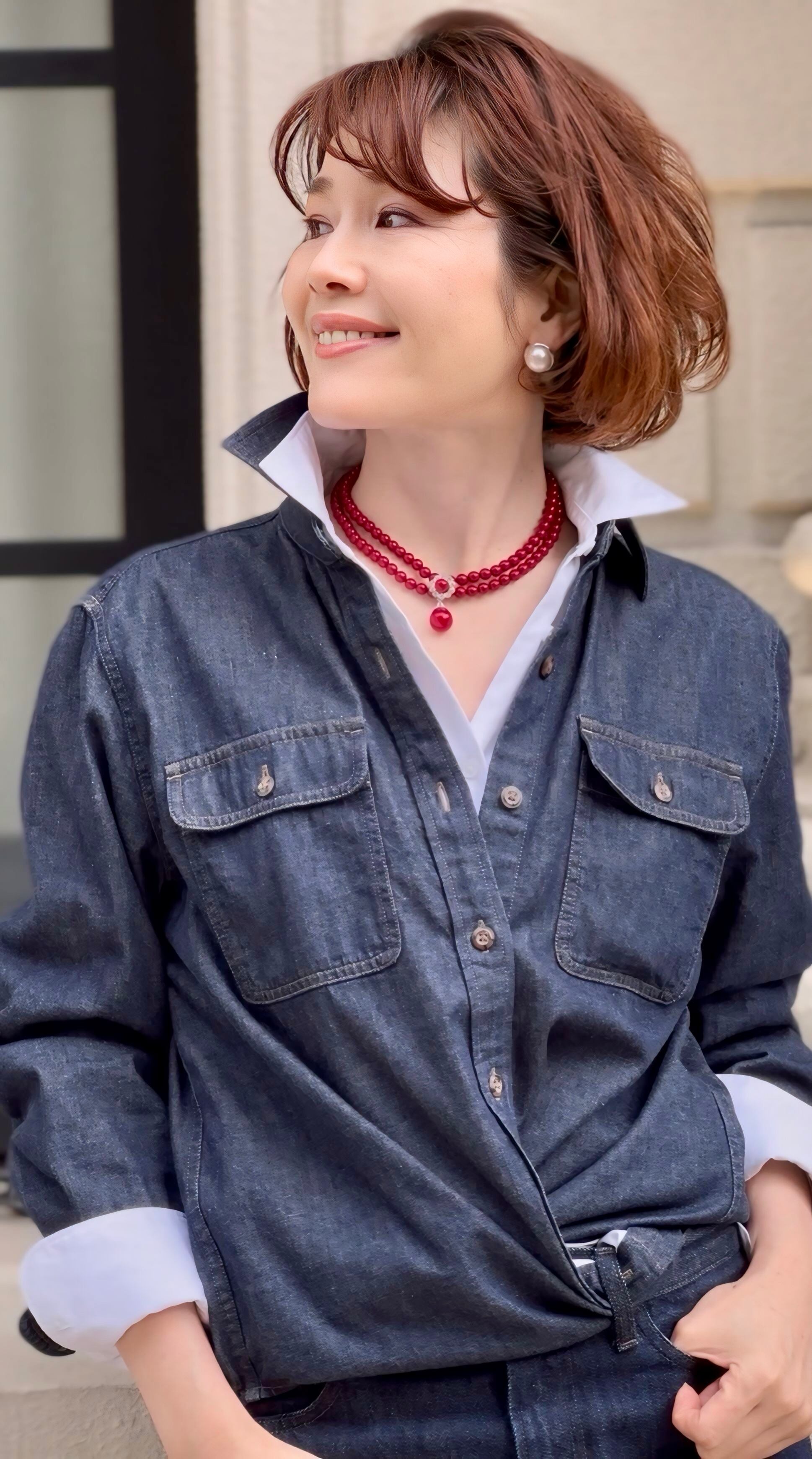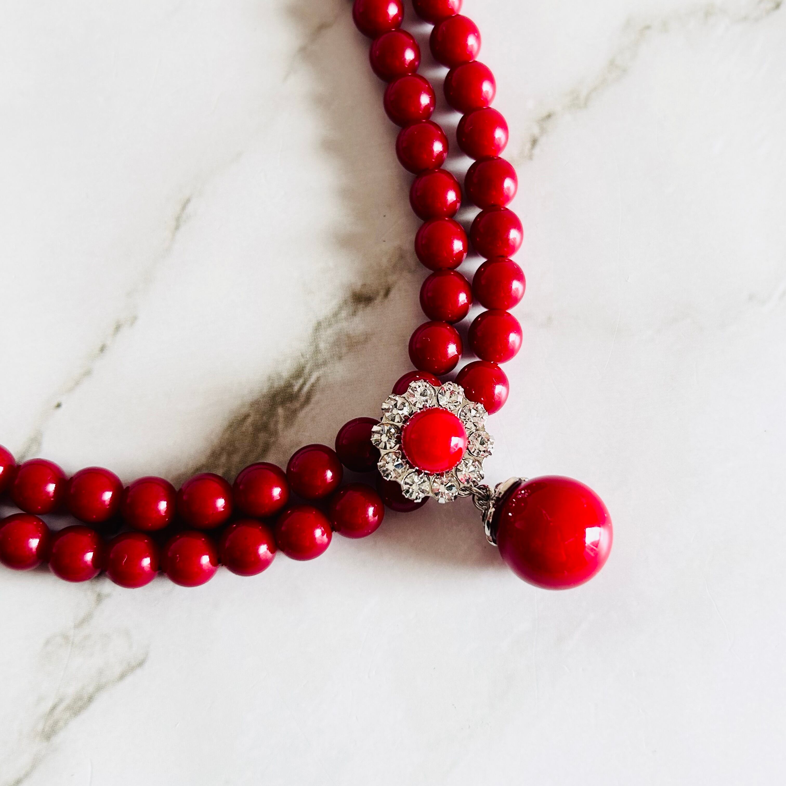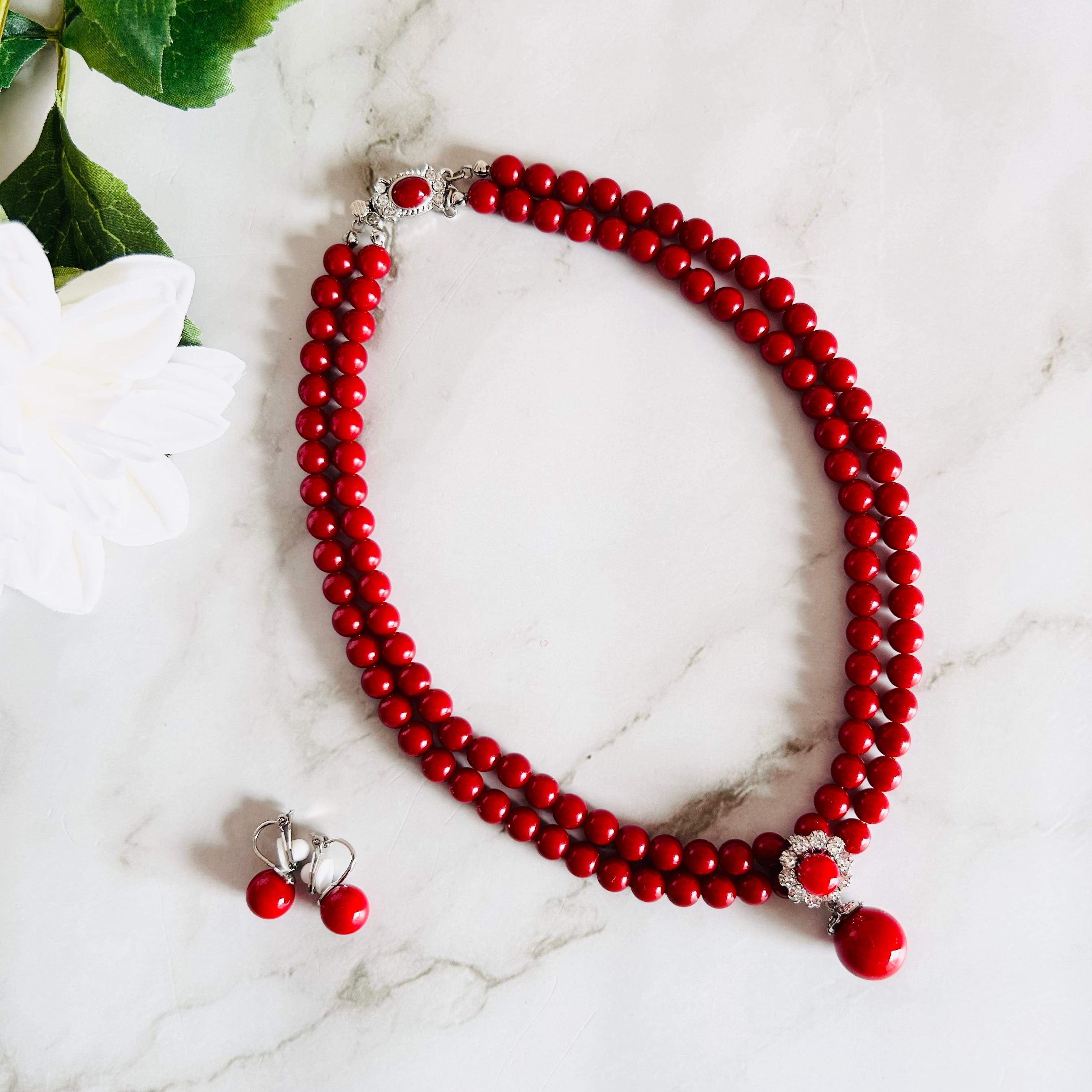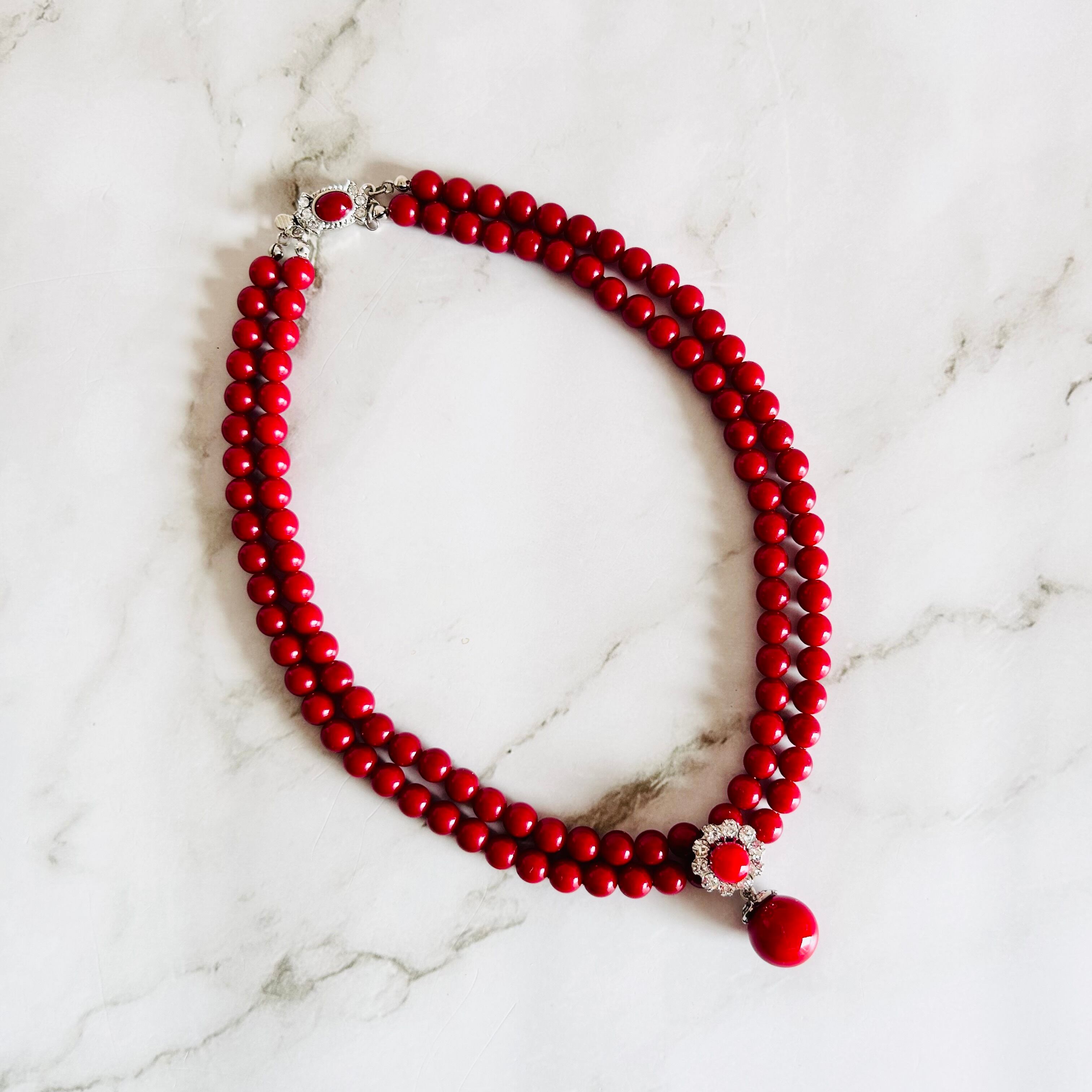 2連に並んだ艶やかな赤いビーズが胸元に華やぎを添え、装いをぱっと明るく引き立ててくれます。