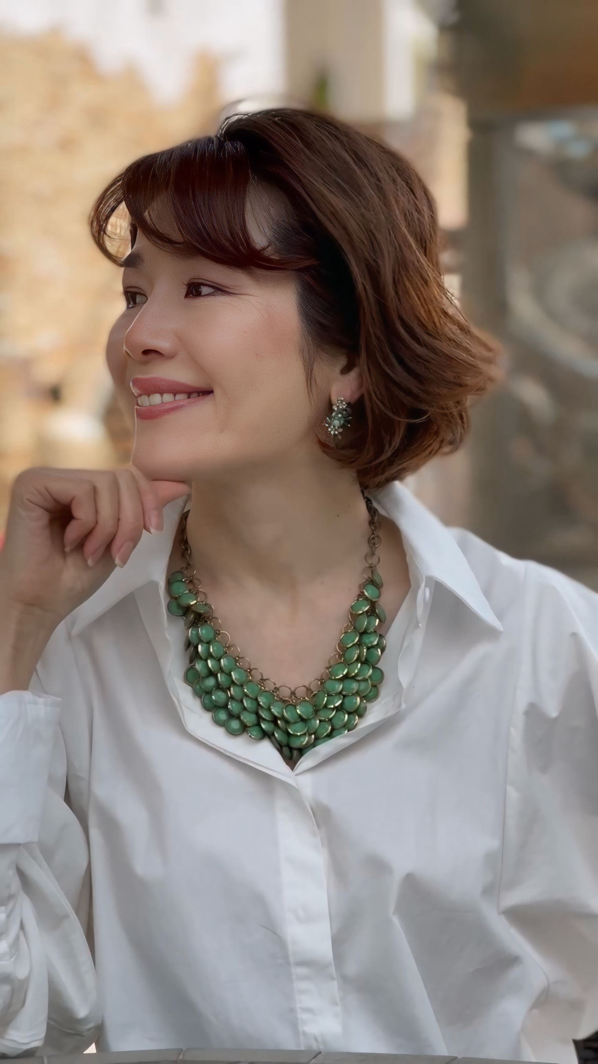 重なり合うグリーンの輝きが美しく映える、大人の装いを引き立てるネックレスです。