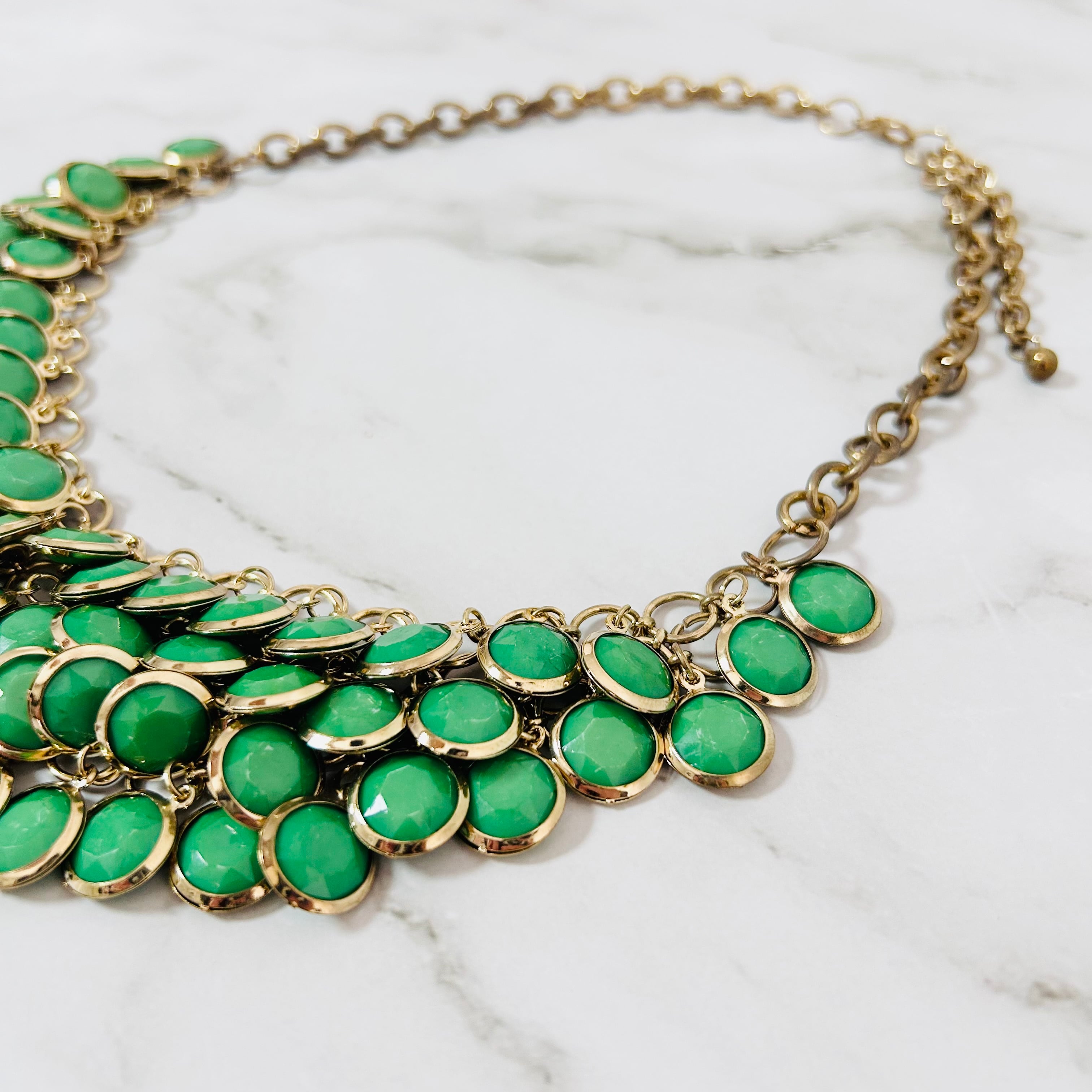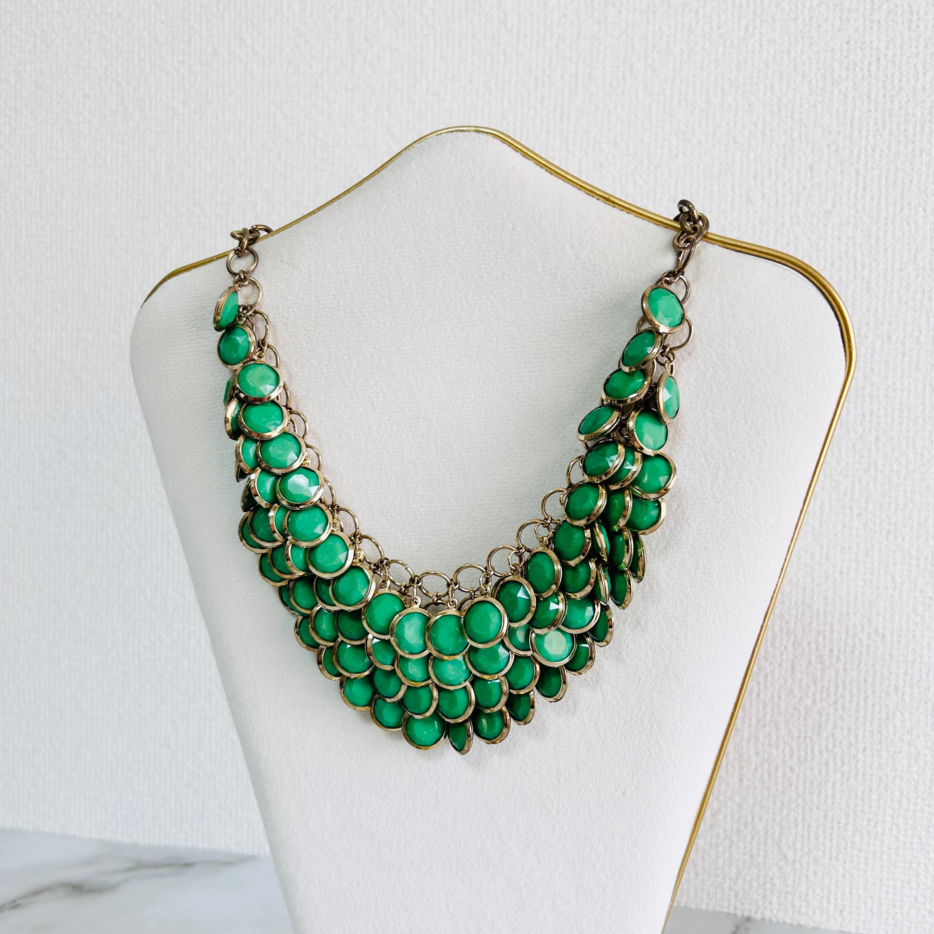艶やかなグリーンが幾重にも重なり、印象的な存在感を放つビジューネックレス。
