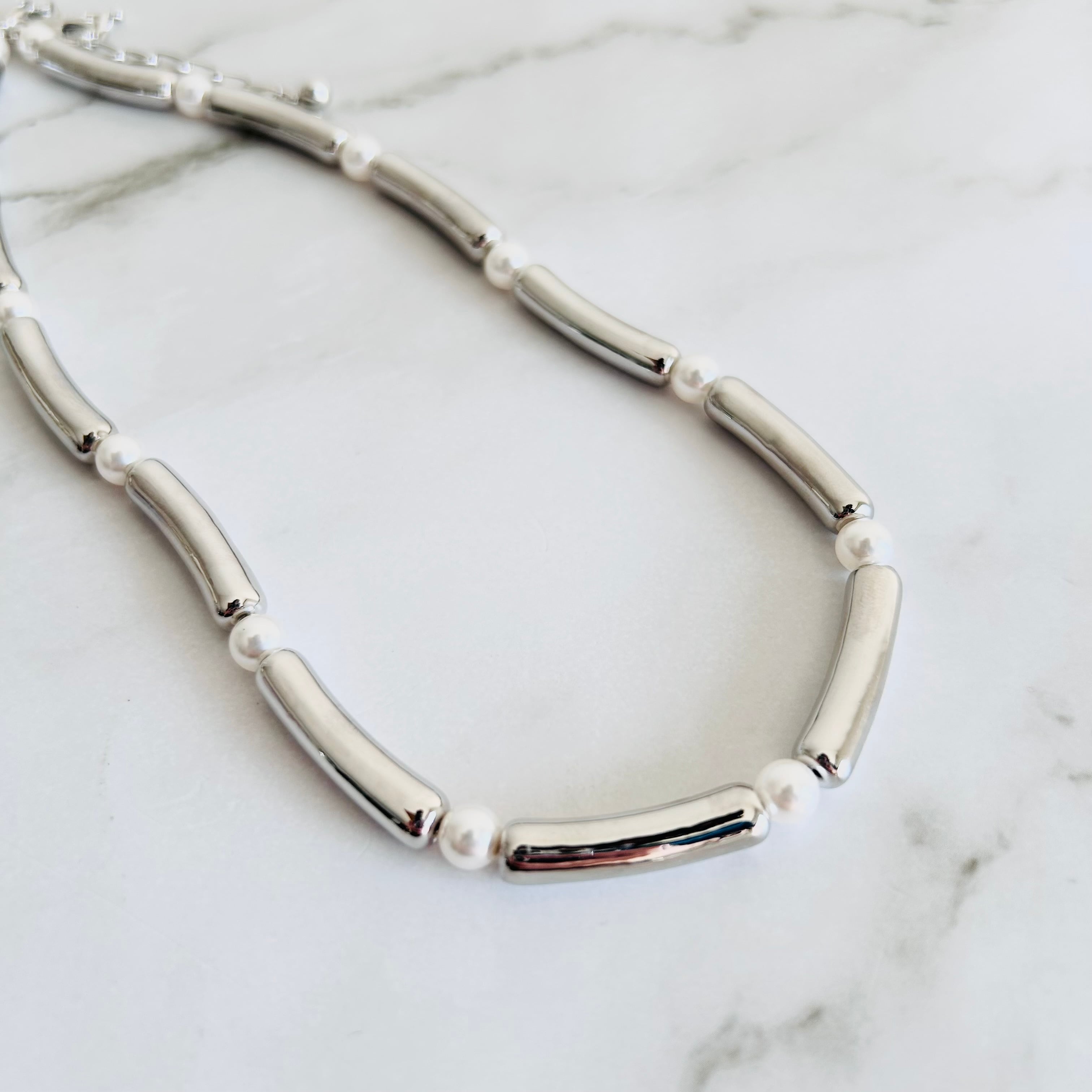 スワロフスキー社のパールと、錫(すず)素材のメタルパーツを組み合わせたミニマムなネックレス。