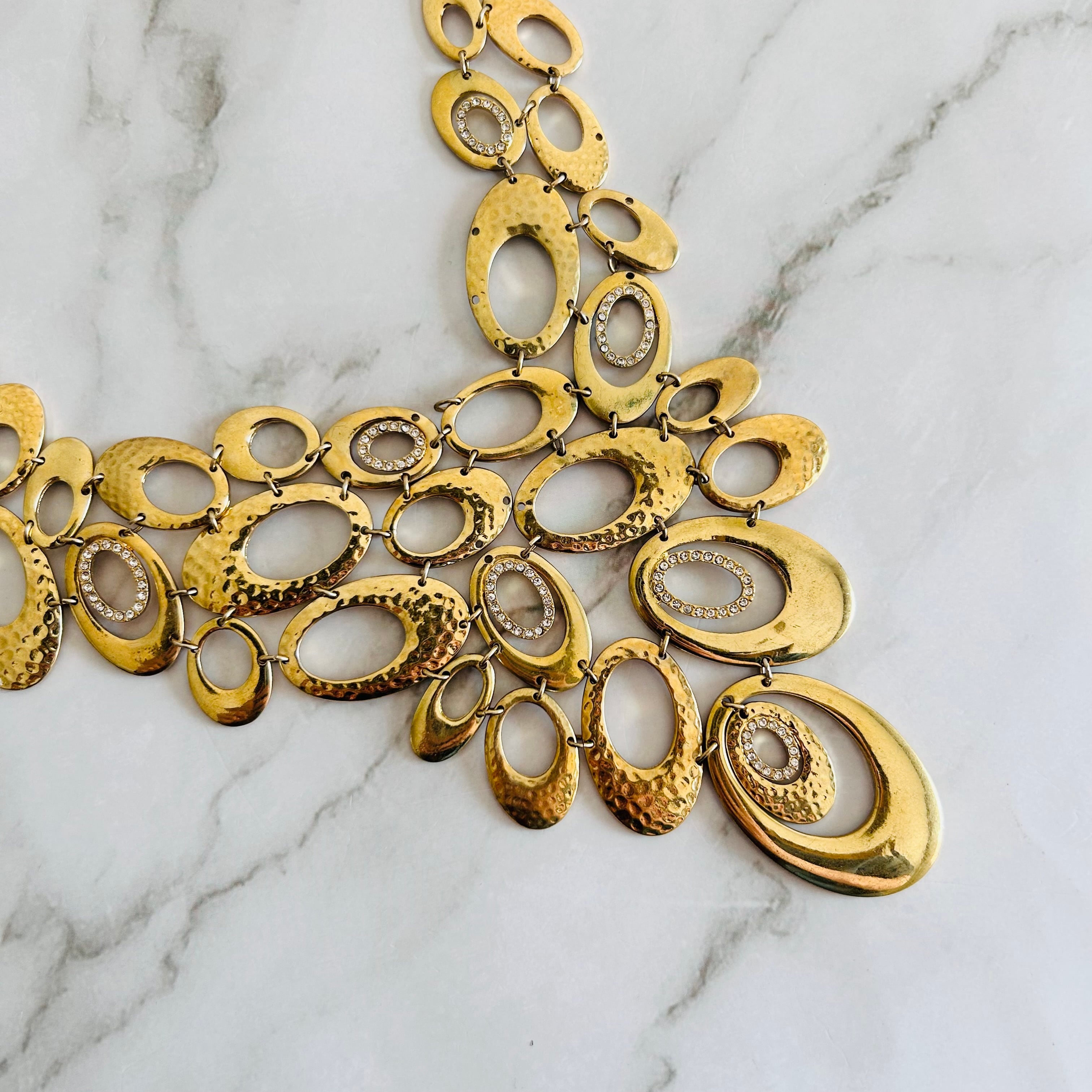 ランダムに連なるオーバル型のメタルパーツが印象的な、ゴールドネックレス。