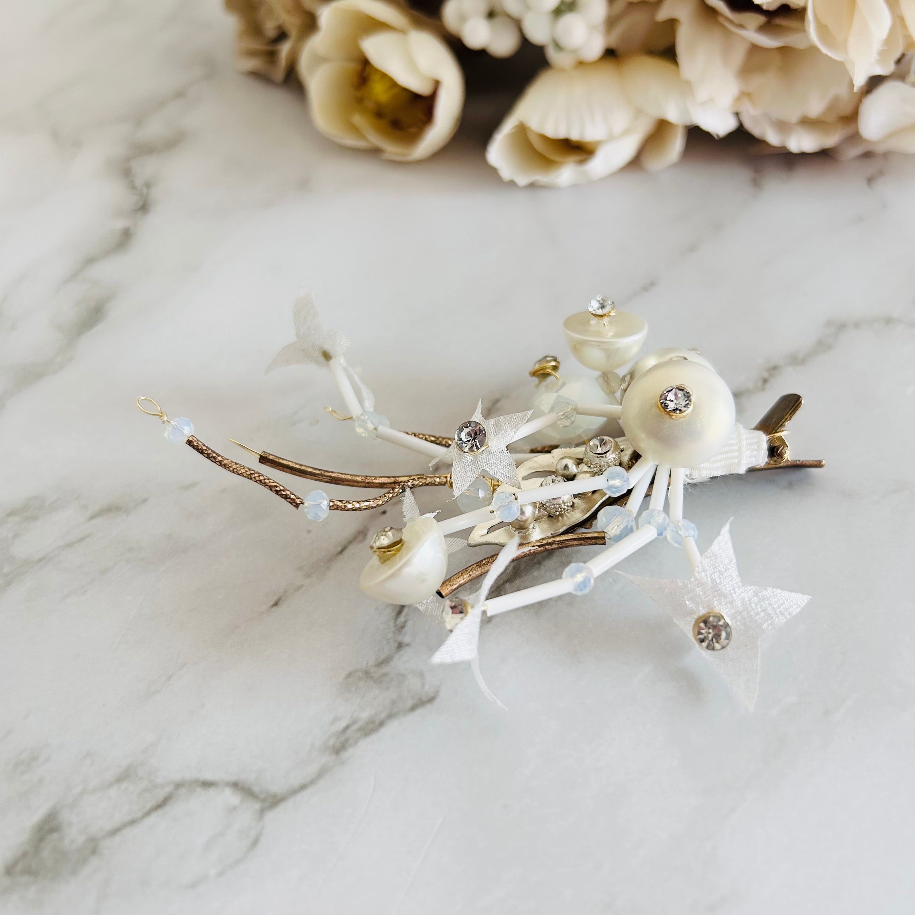 透明感のあるビジューや淡いオーロラカラーのビーズが絶妙に重なり合い、