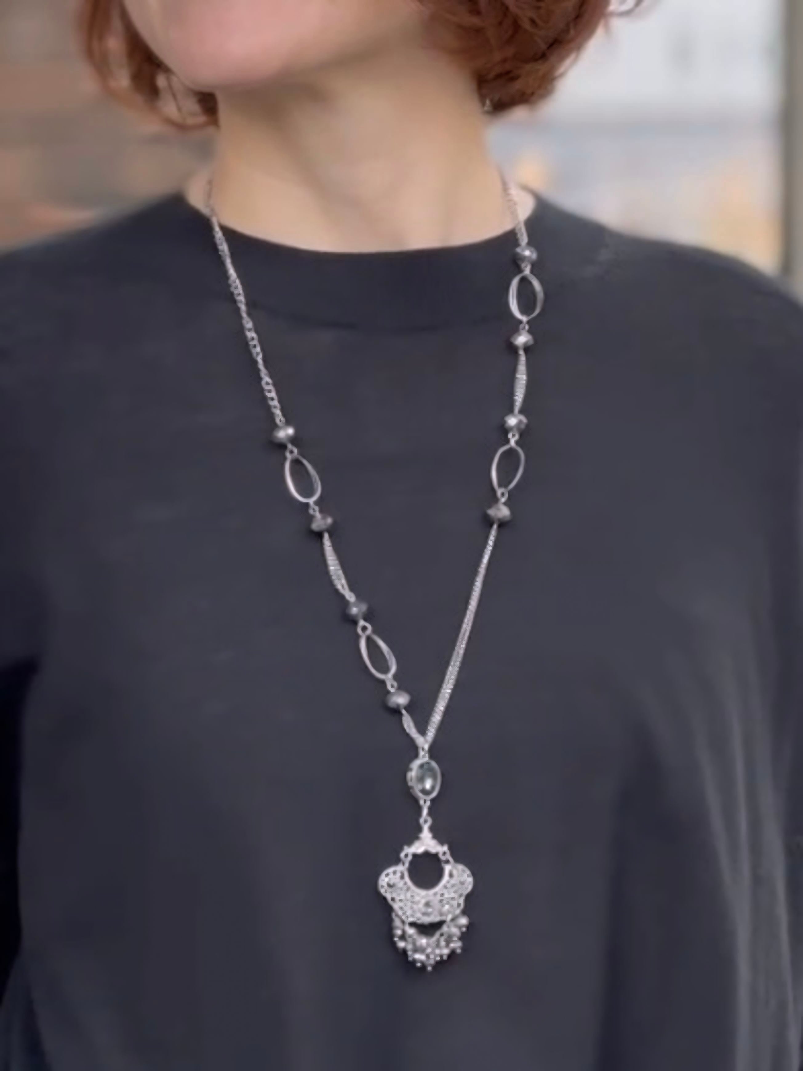 細やかなチェーンとメタルビーズ、オーバルパーツをリズミカルに連ねたロングネックレス。