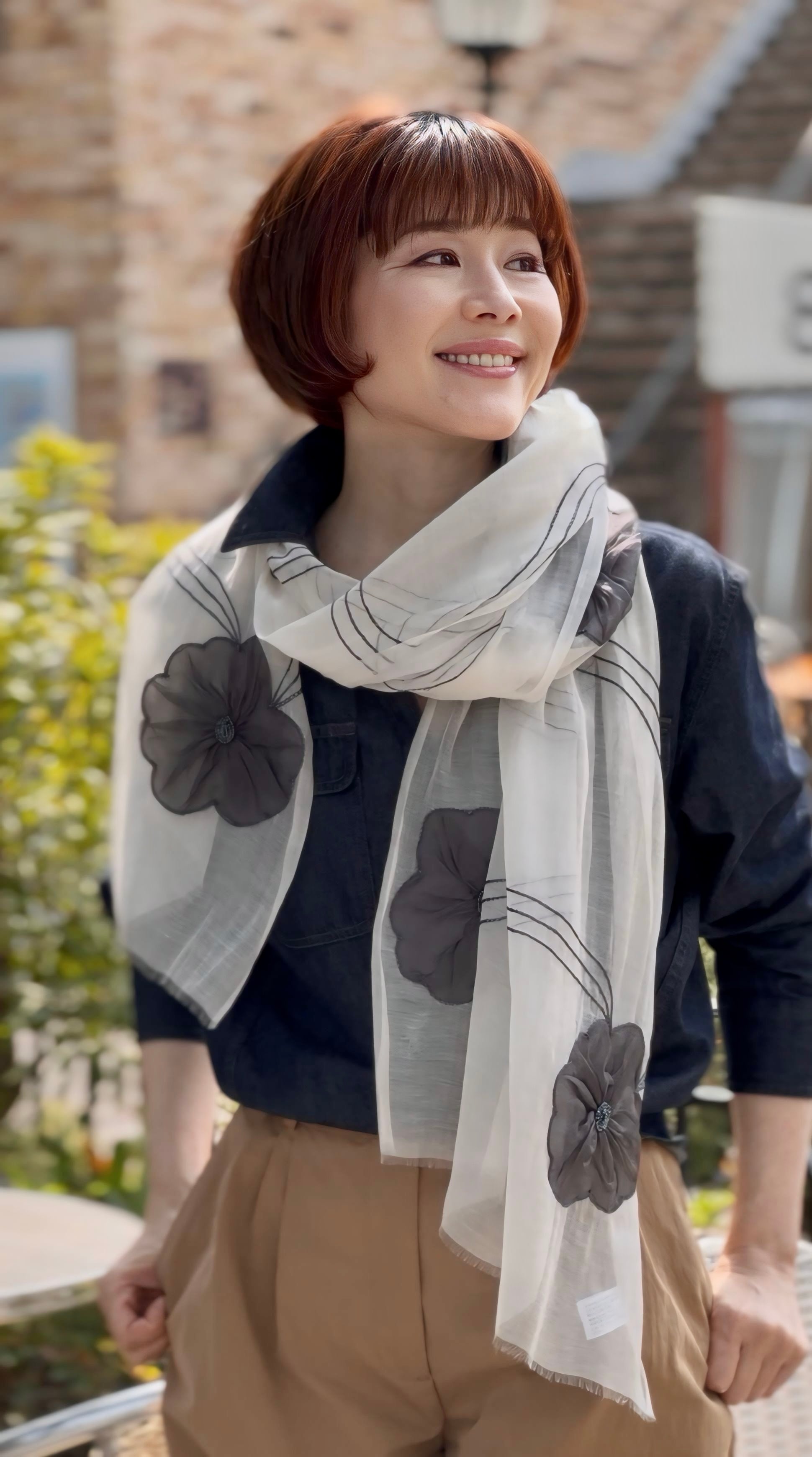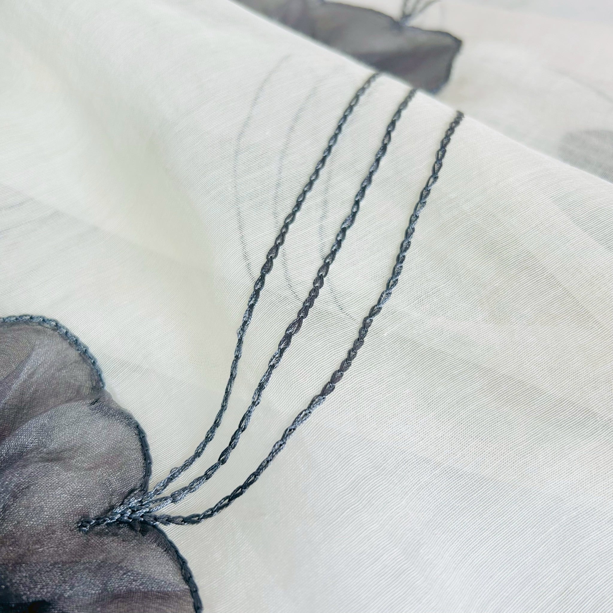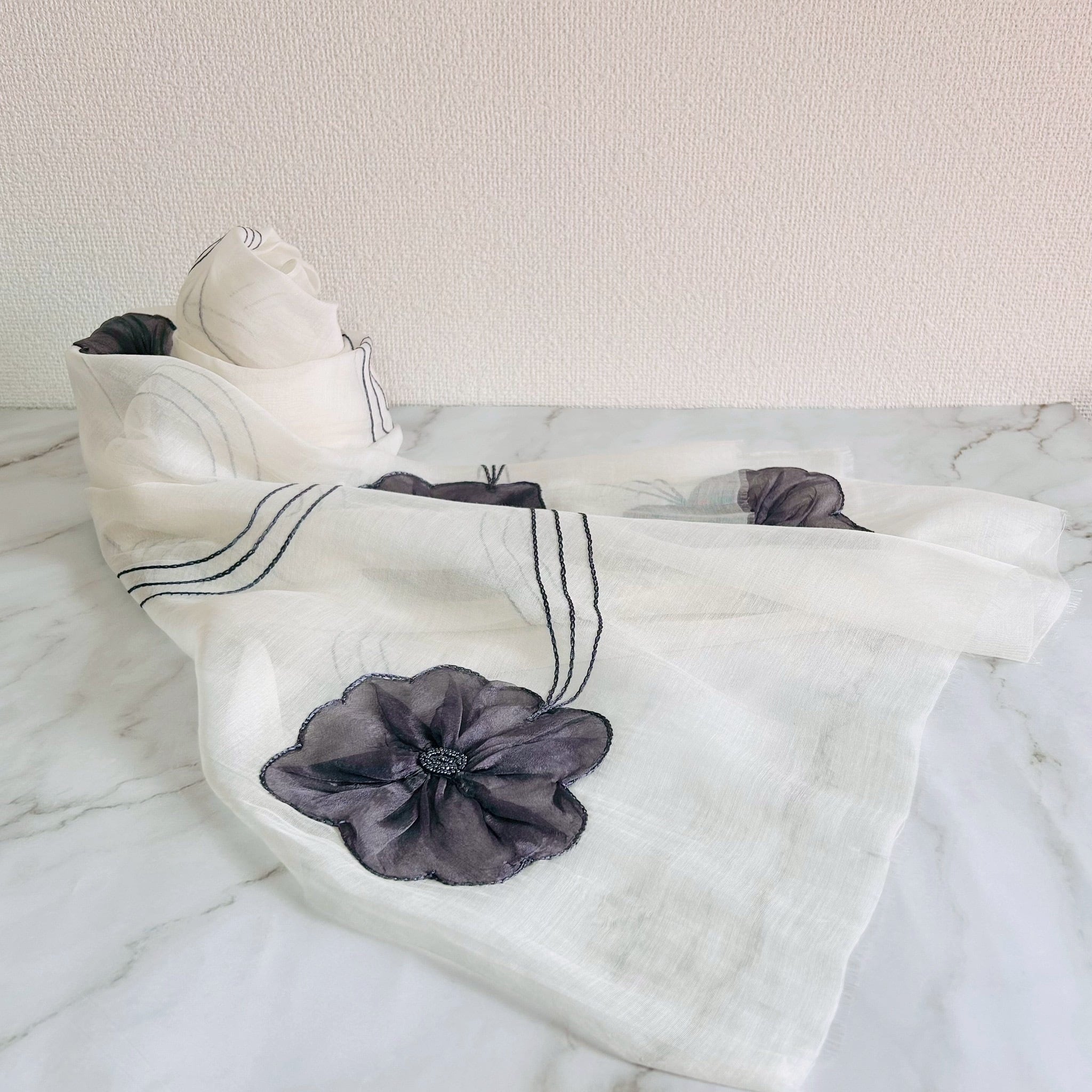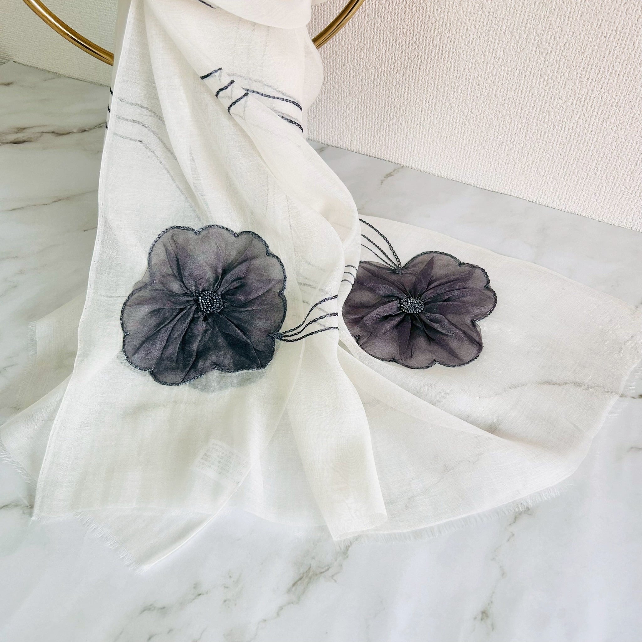 繊細な透け感とフラワーモチーフが美しい、コットンシルク素材のシアーストールです。