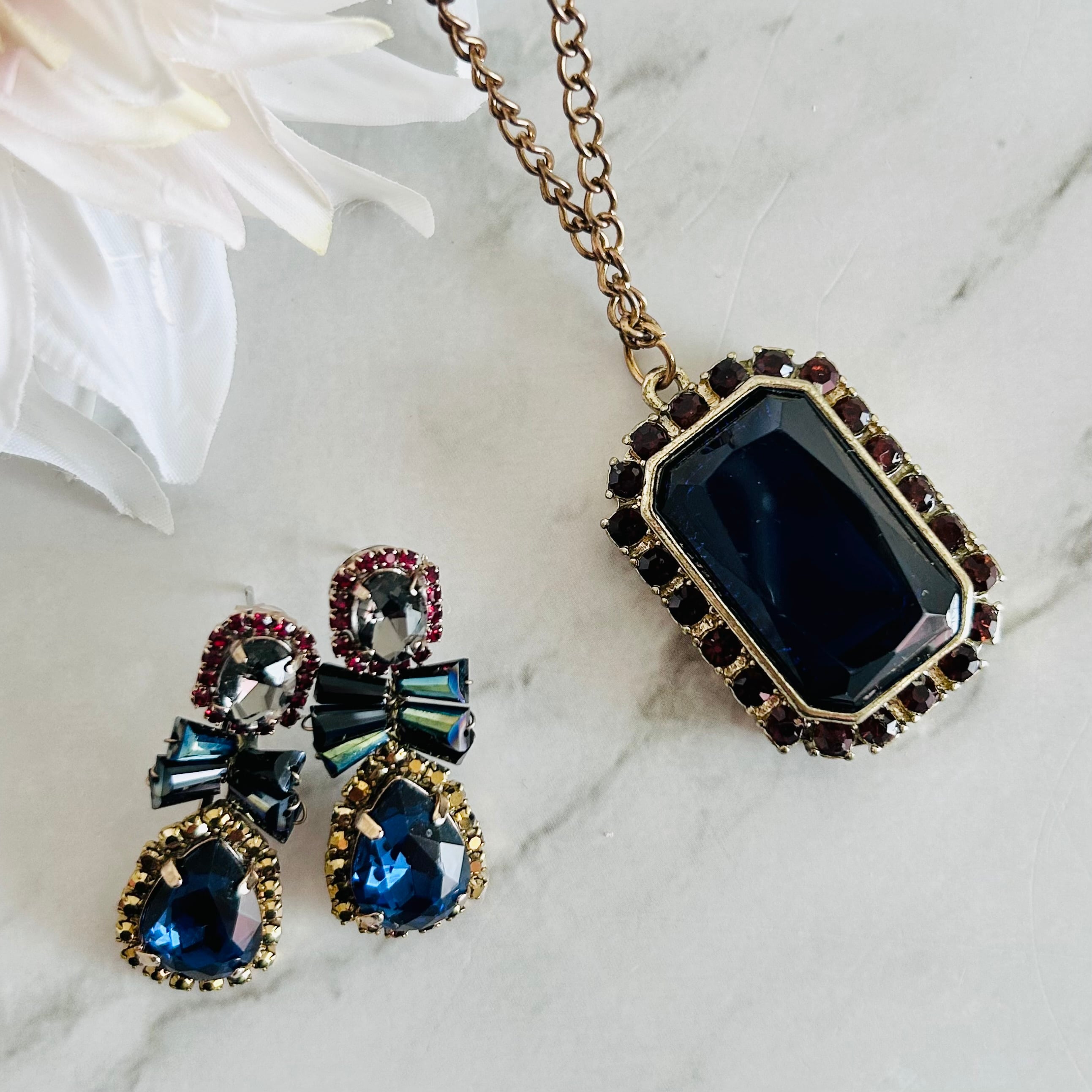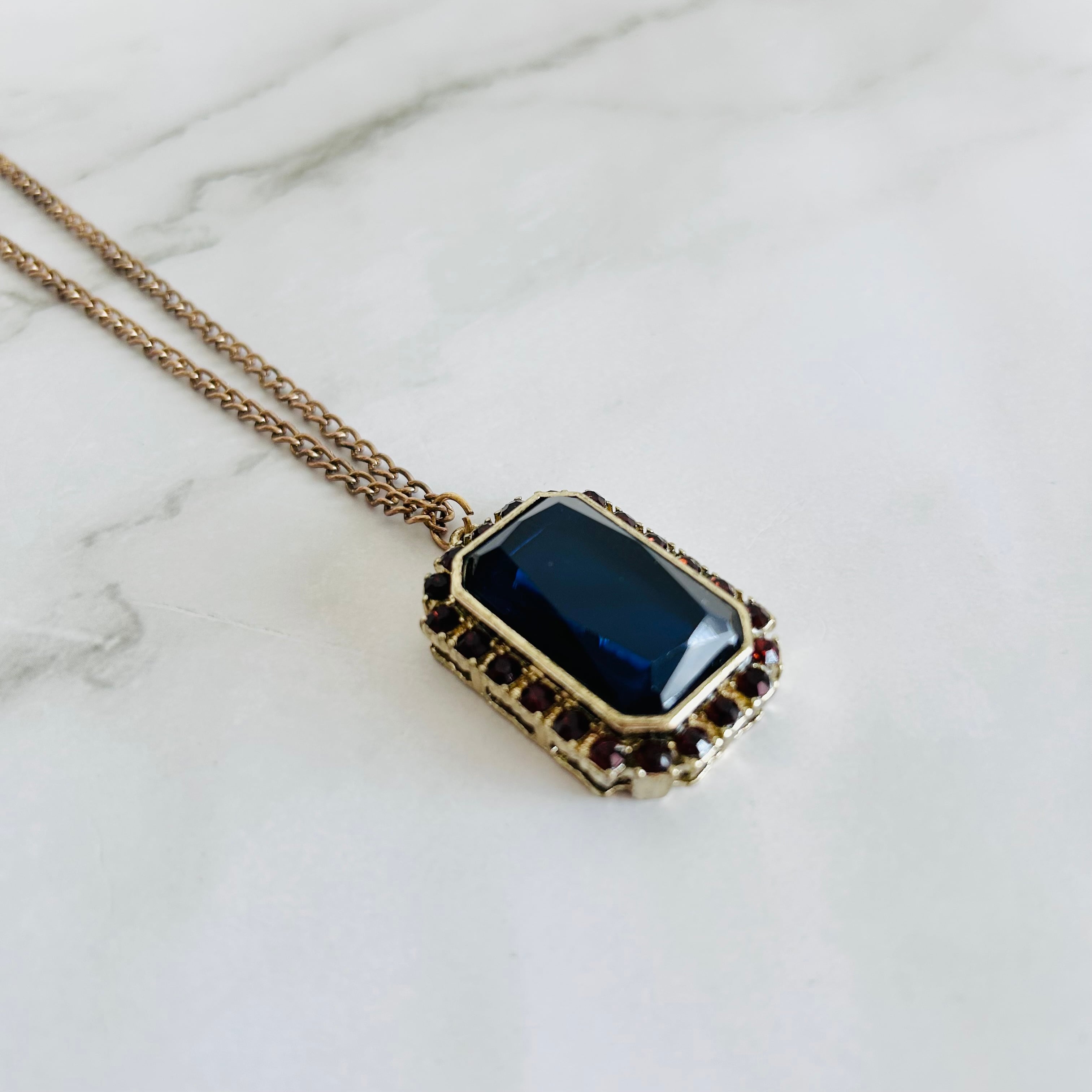 深みのあるネイビーのスクウェアパーツを中心に、アンバーカラーのクリスタルがぐるりと囲むように配されたネックレス。