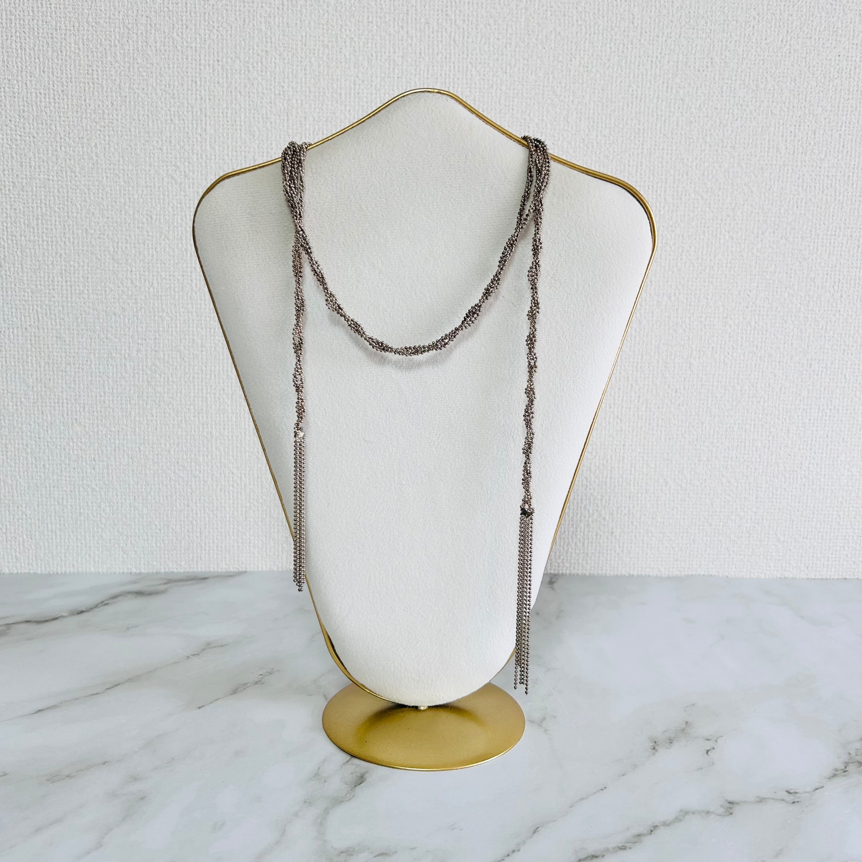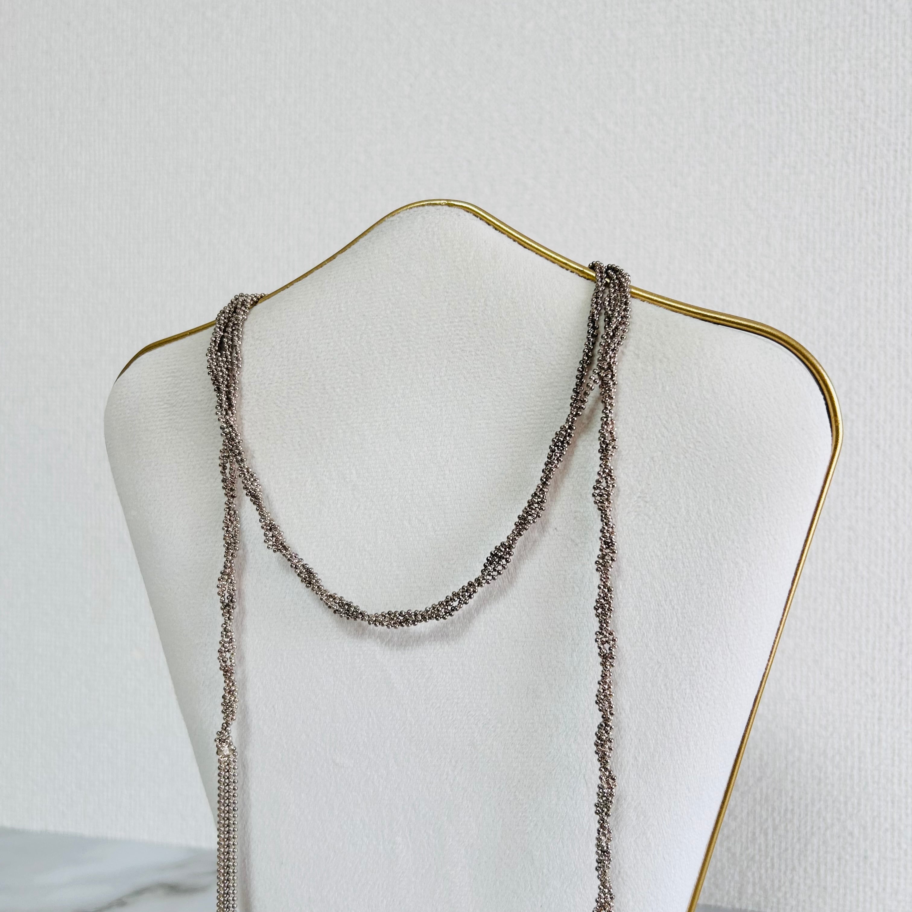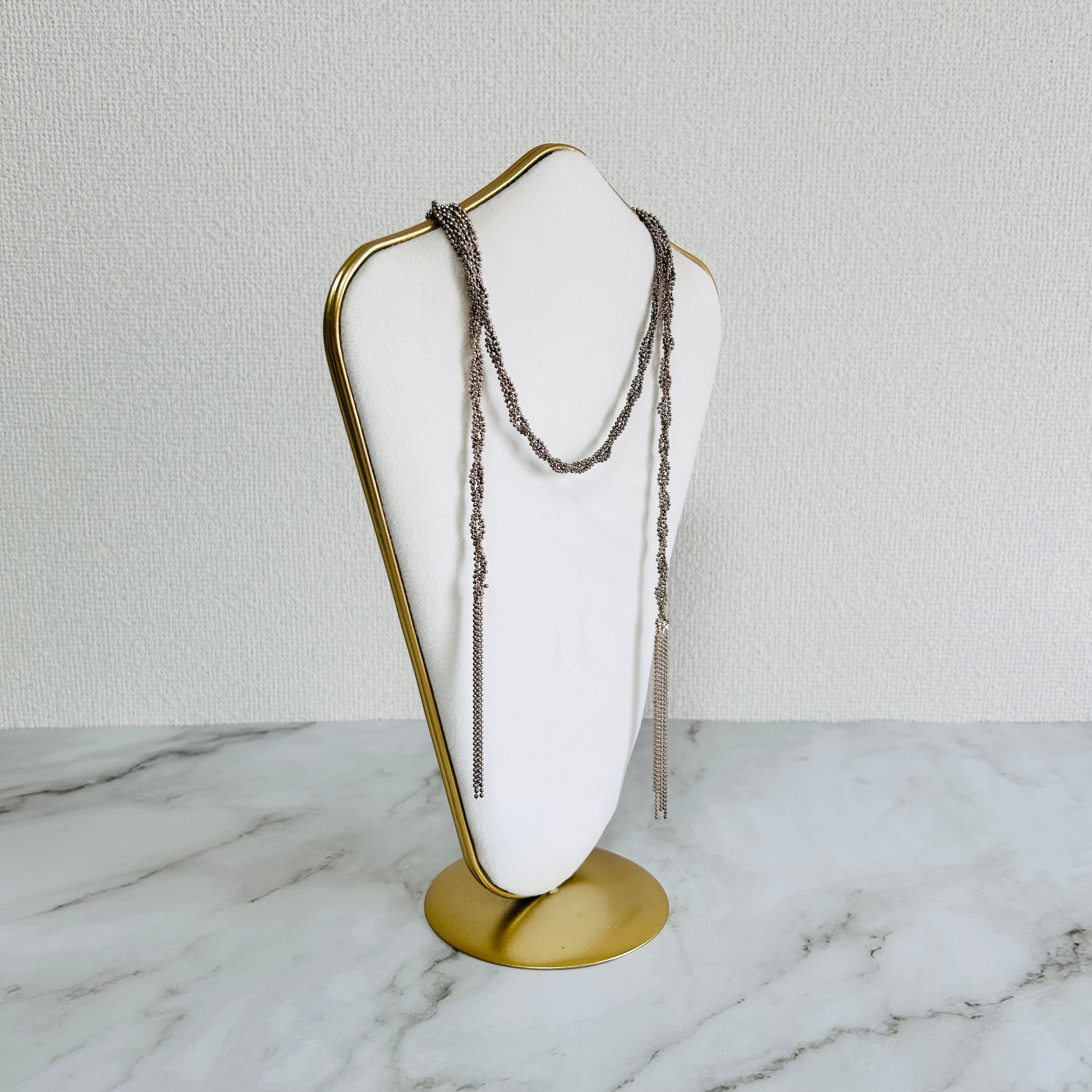 繊細なチェーンを幾重にも束ね、ねじって込むことで生まれたロングネックレス。