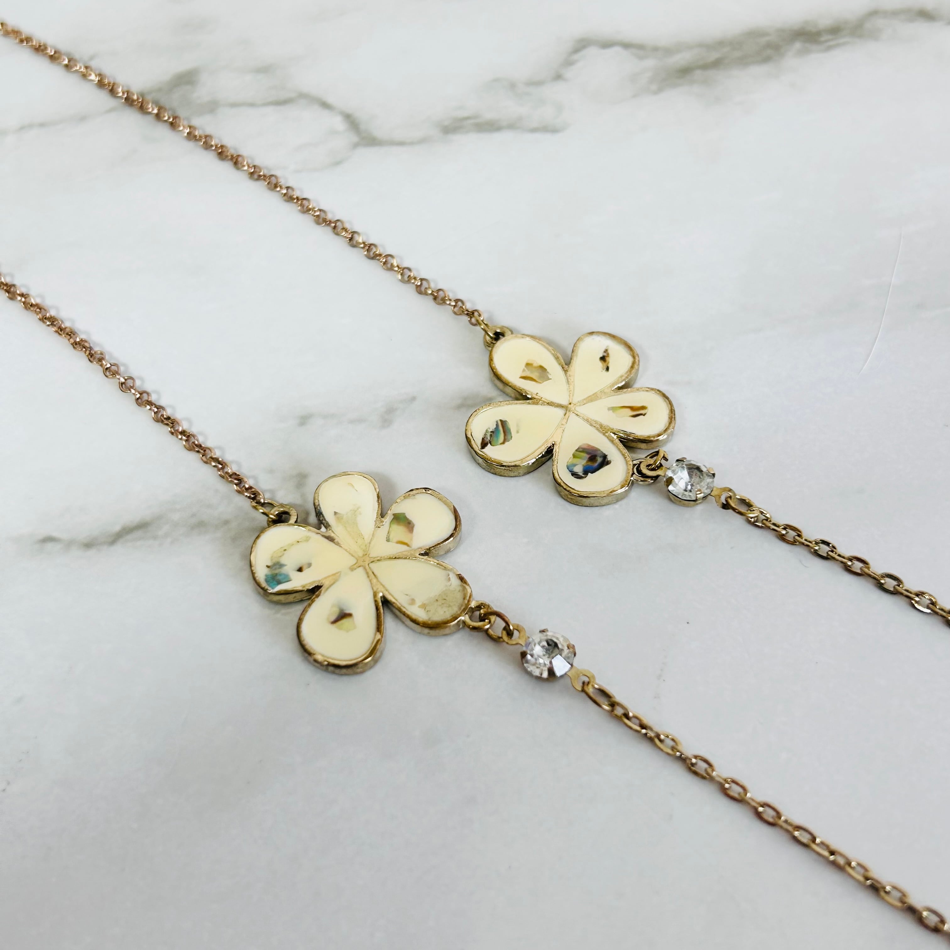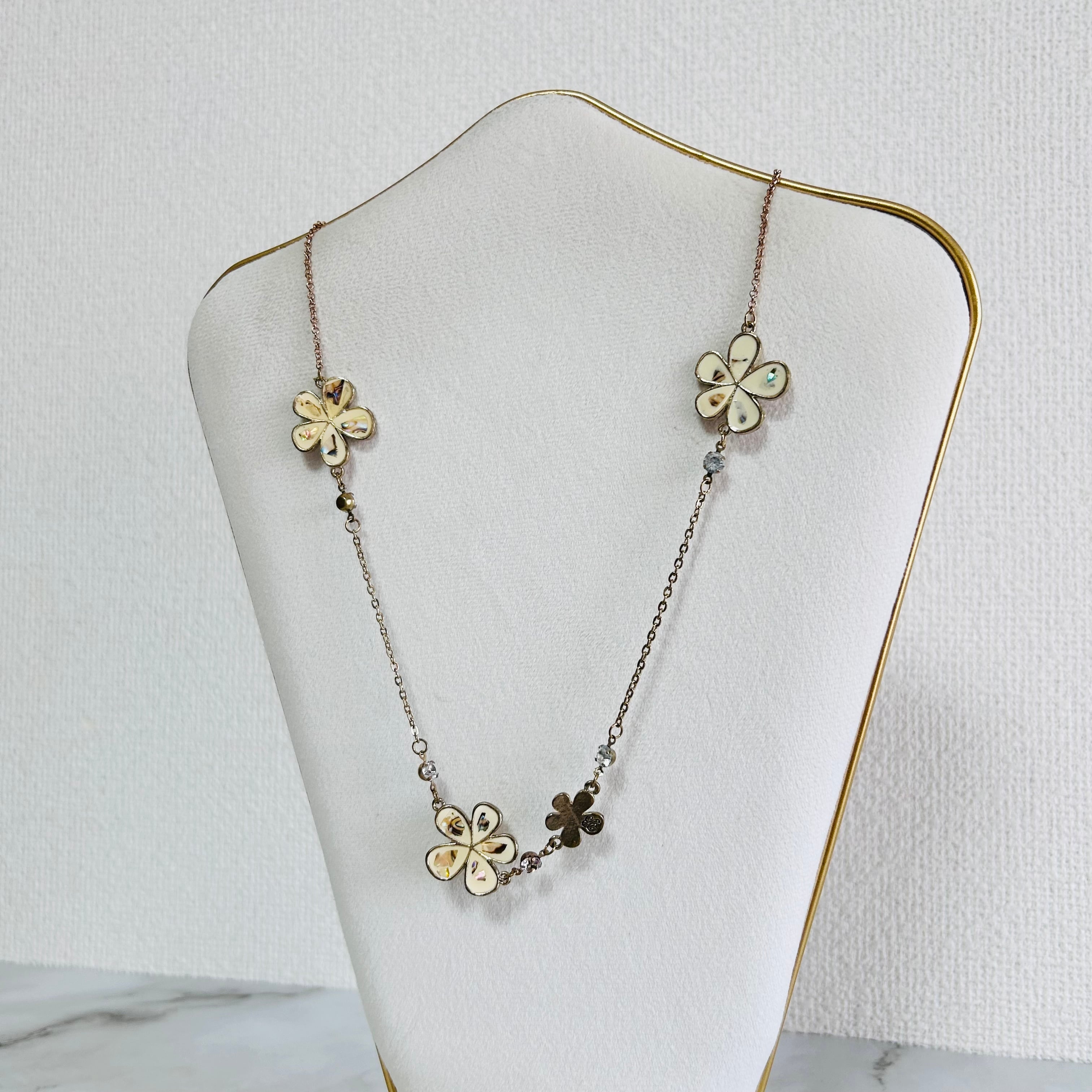 やわらかなバニラカラーのフラワーモチーフに、ほんのりとシェルのような光沢を感じさせるネックレス。