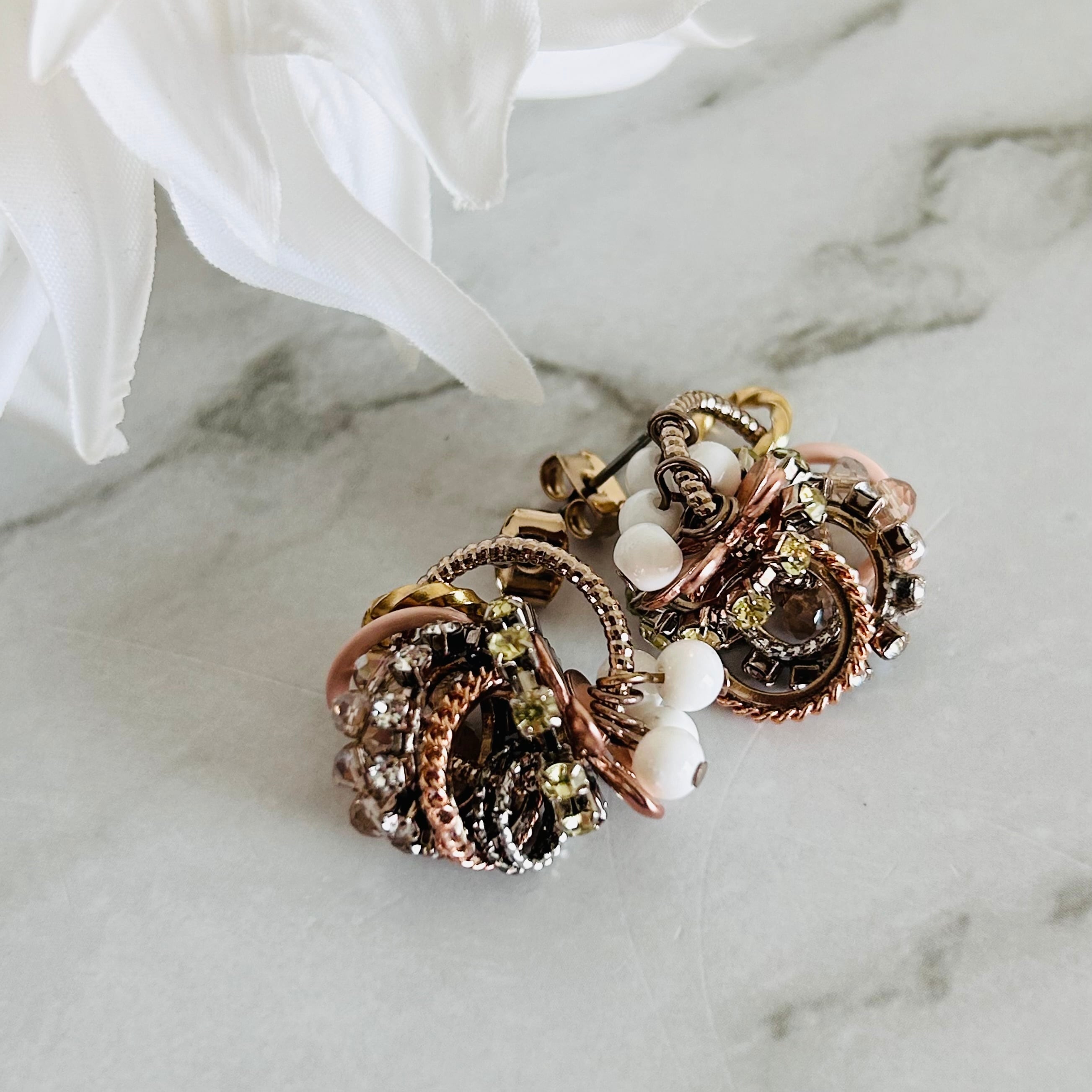 異なるパーツを幾重にも重ねた、立体感あふれるピアス。