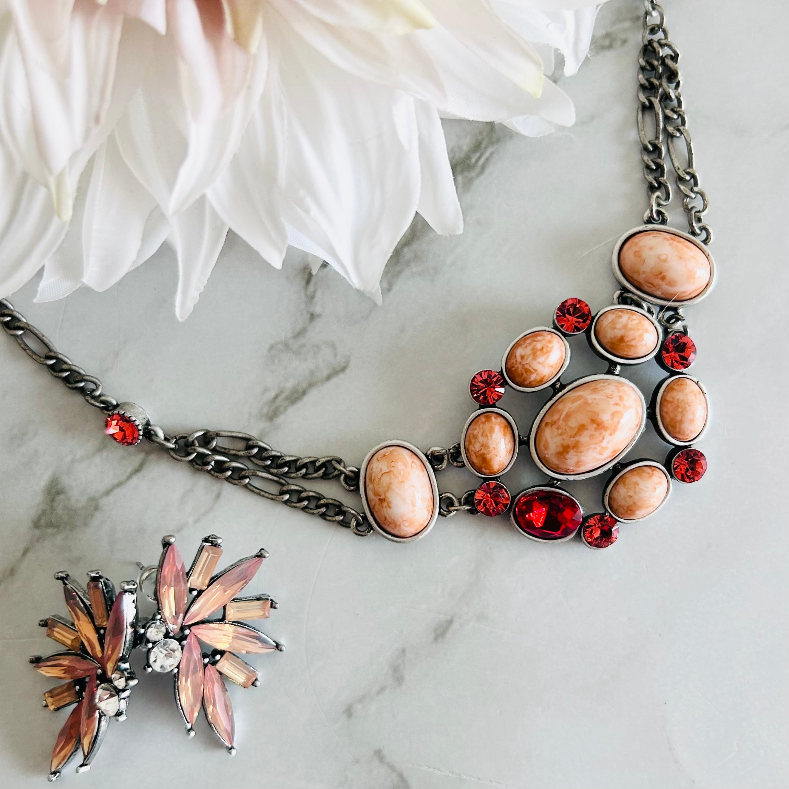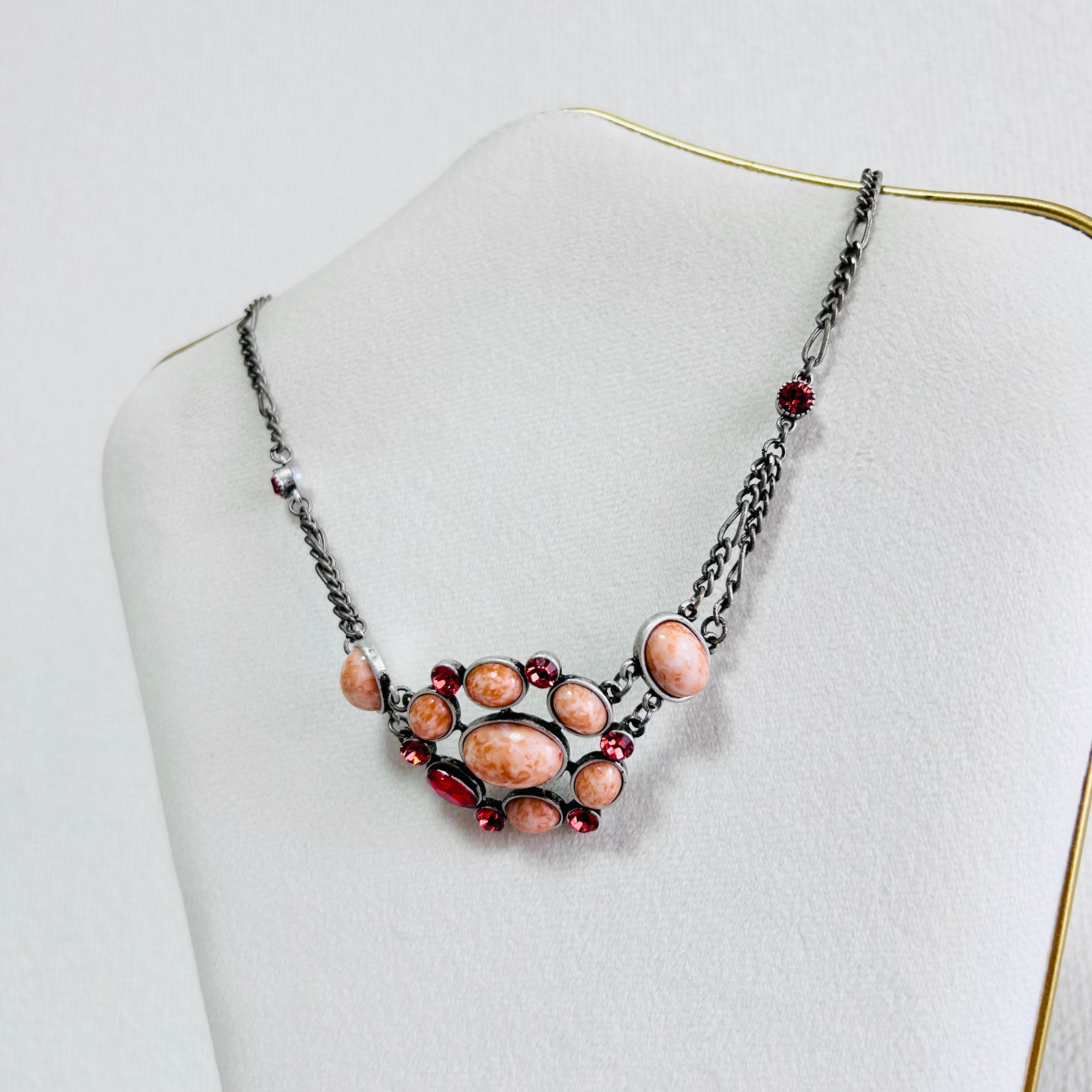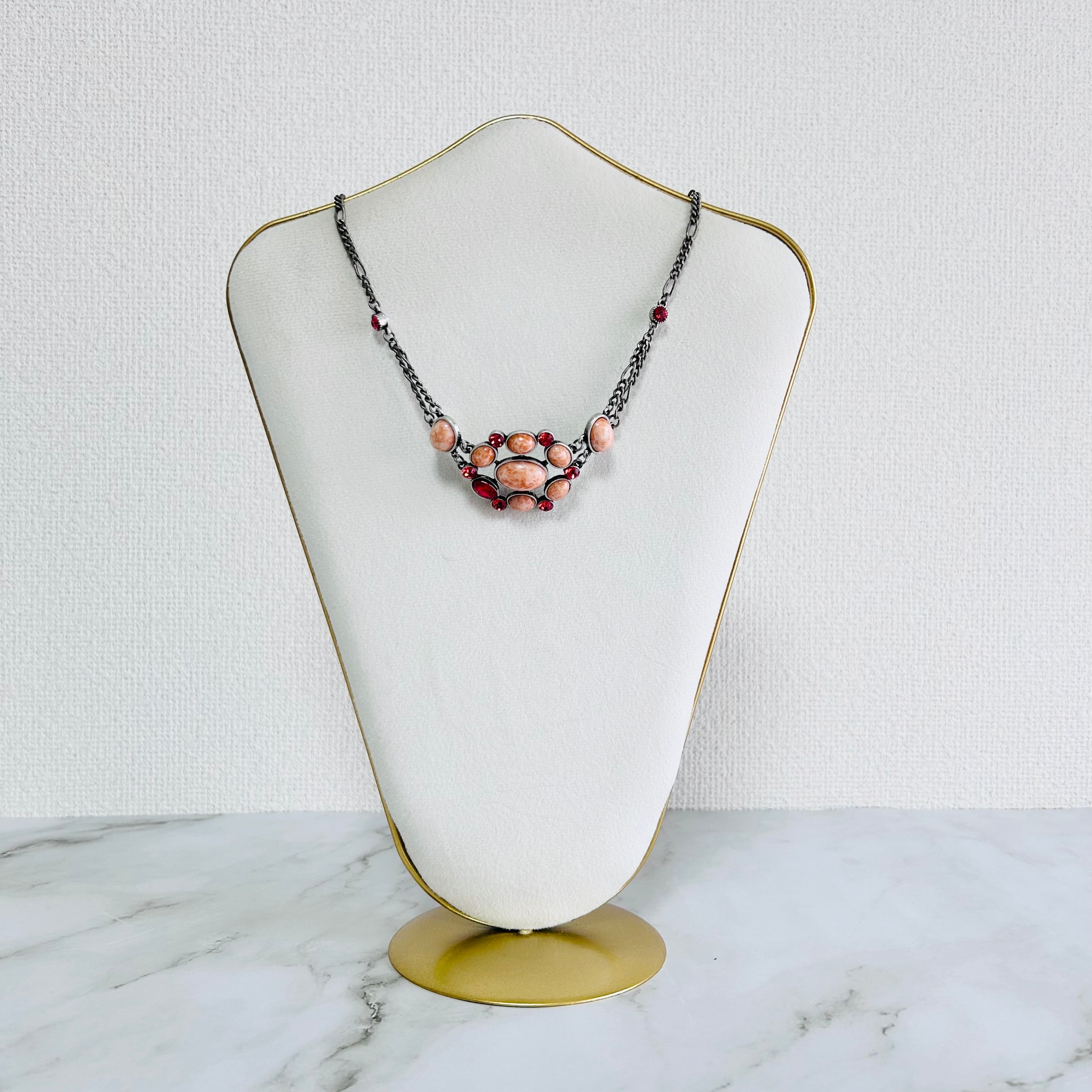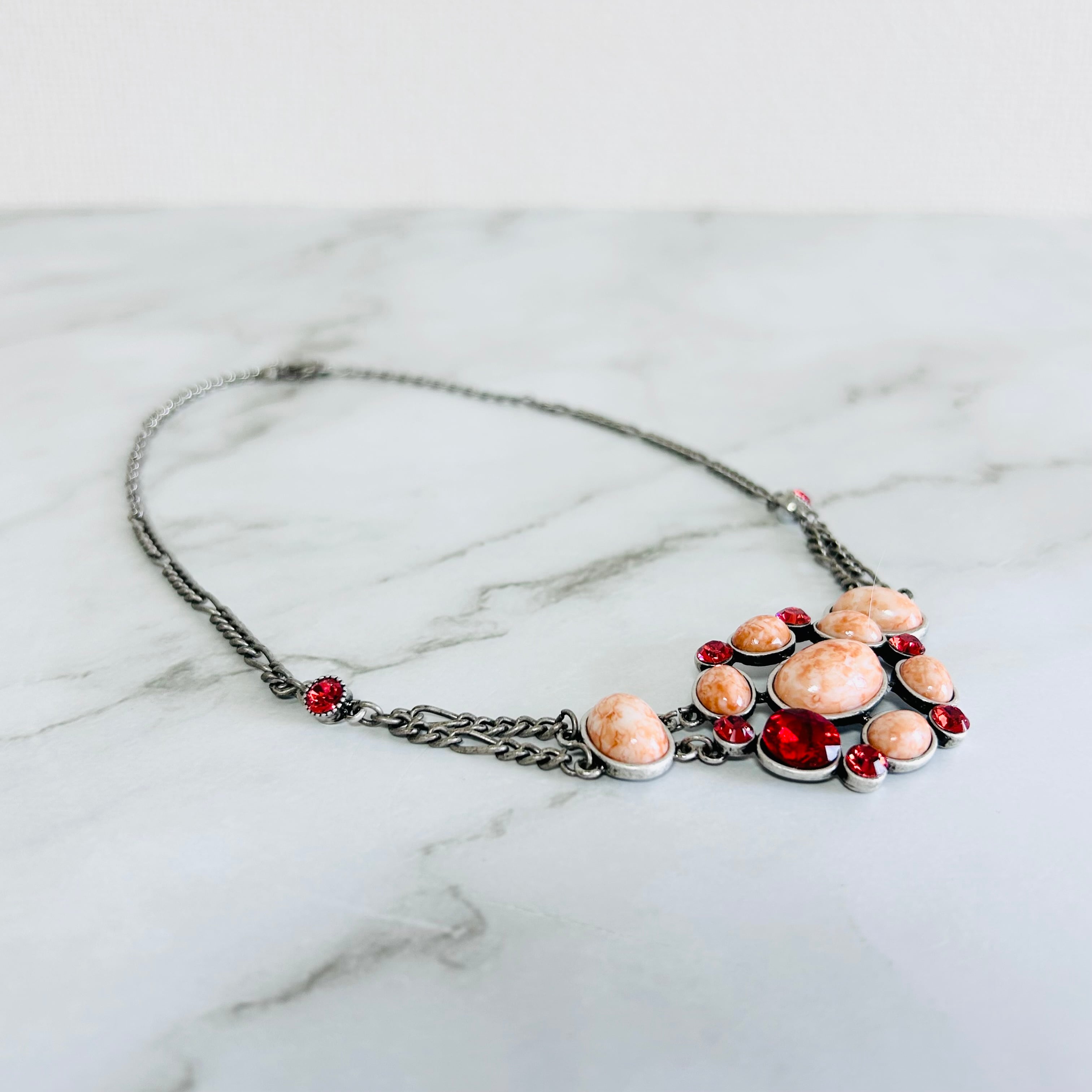 マーブル模様が美しいコーラルオレンジのパーツに、レッドのクリスタルビジューをあしらったネックレス。