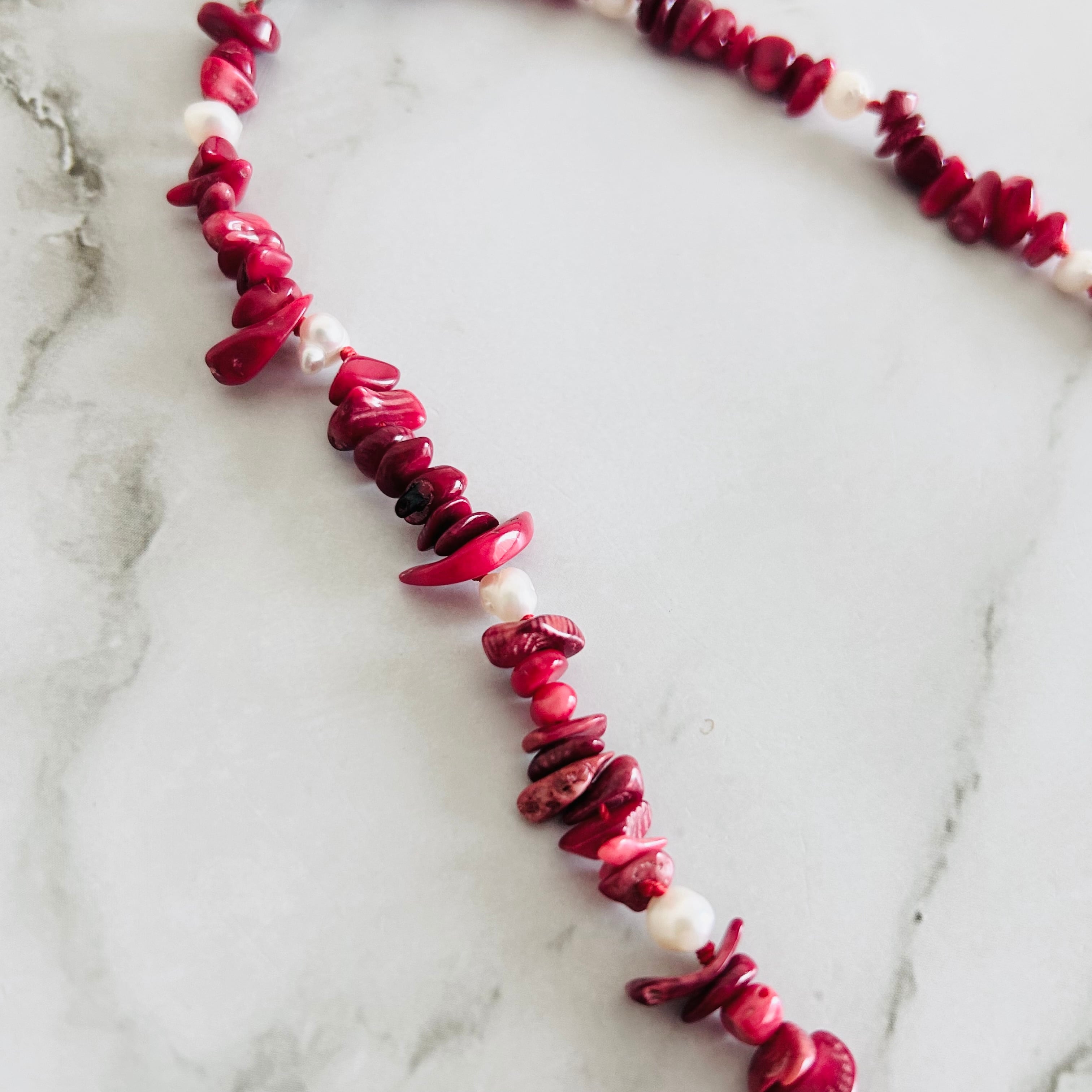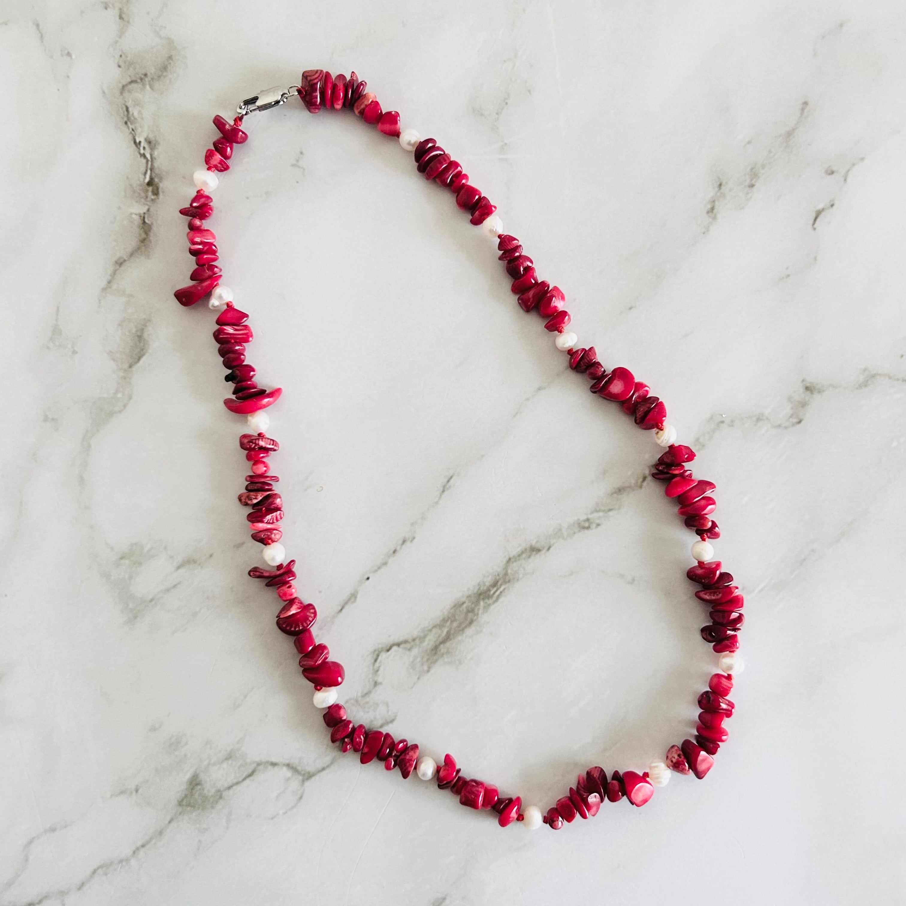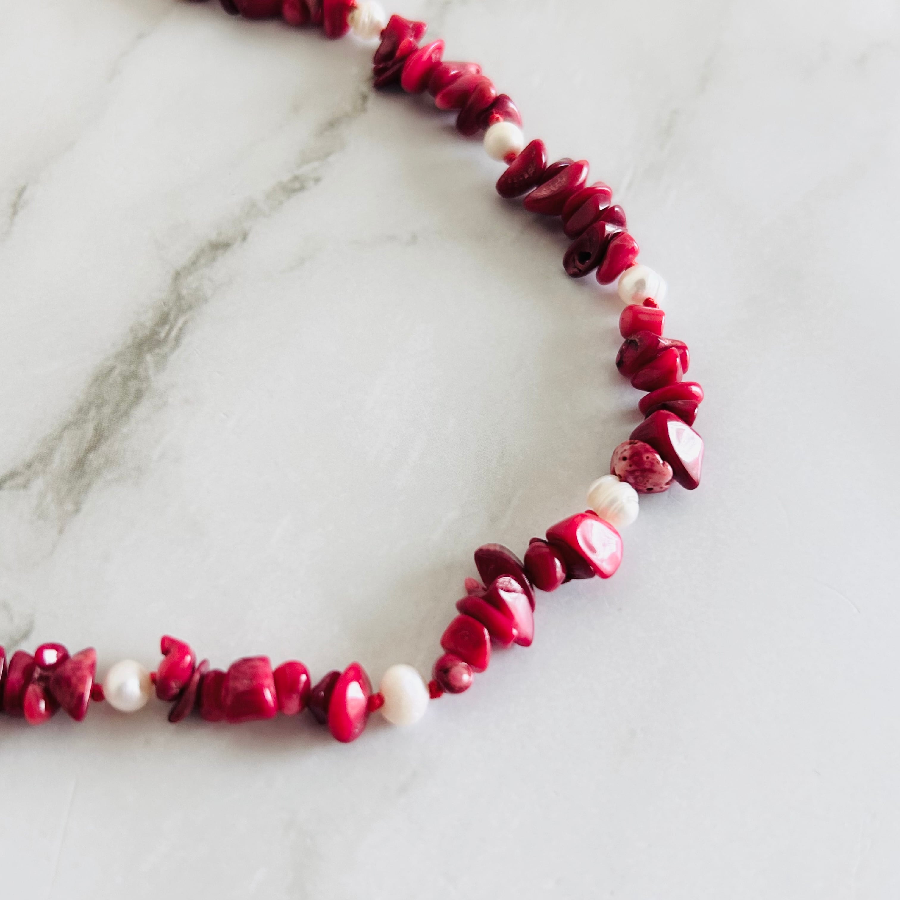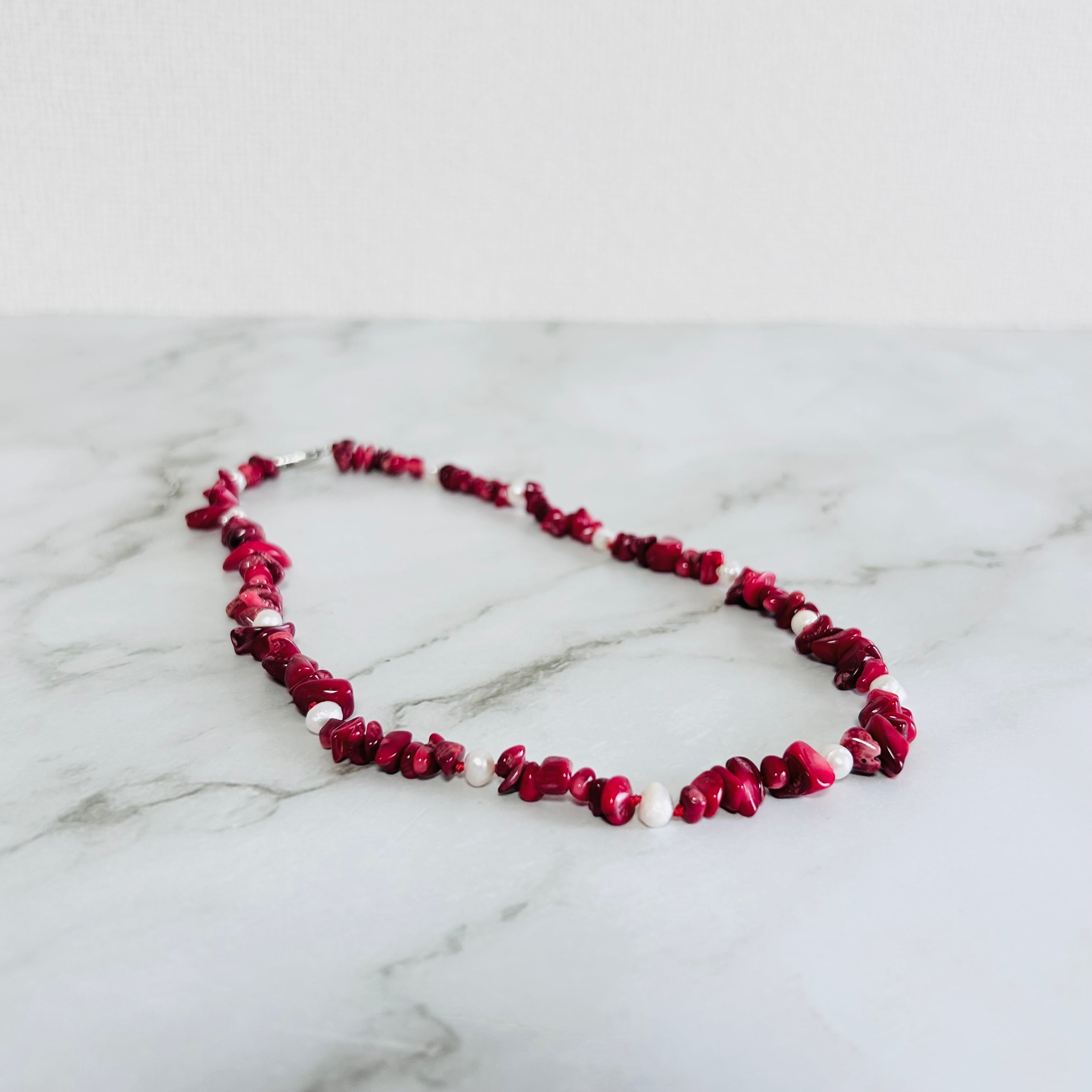 深みのあるレッドのストーンと、やわらかな艶を持つ天然淡水パールを組み合わせたネックレス。