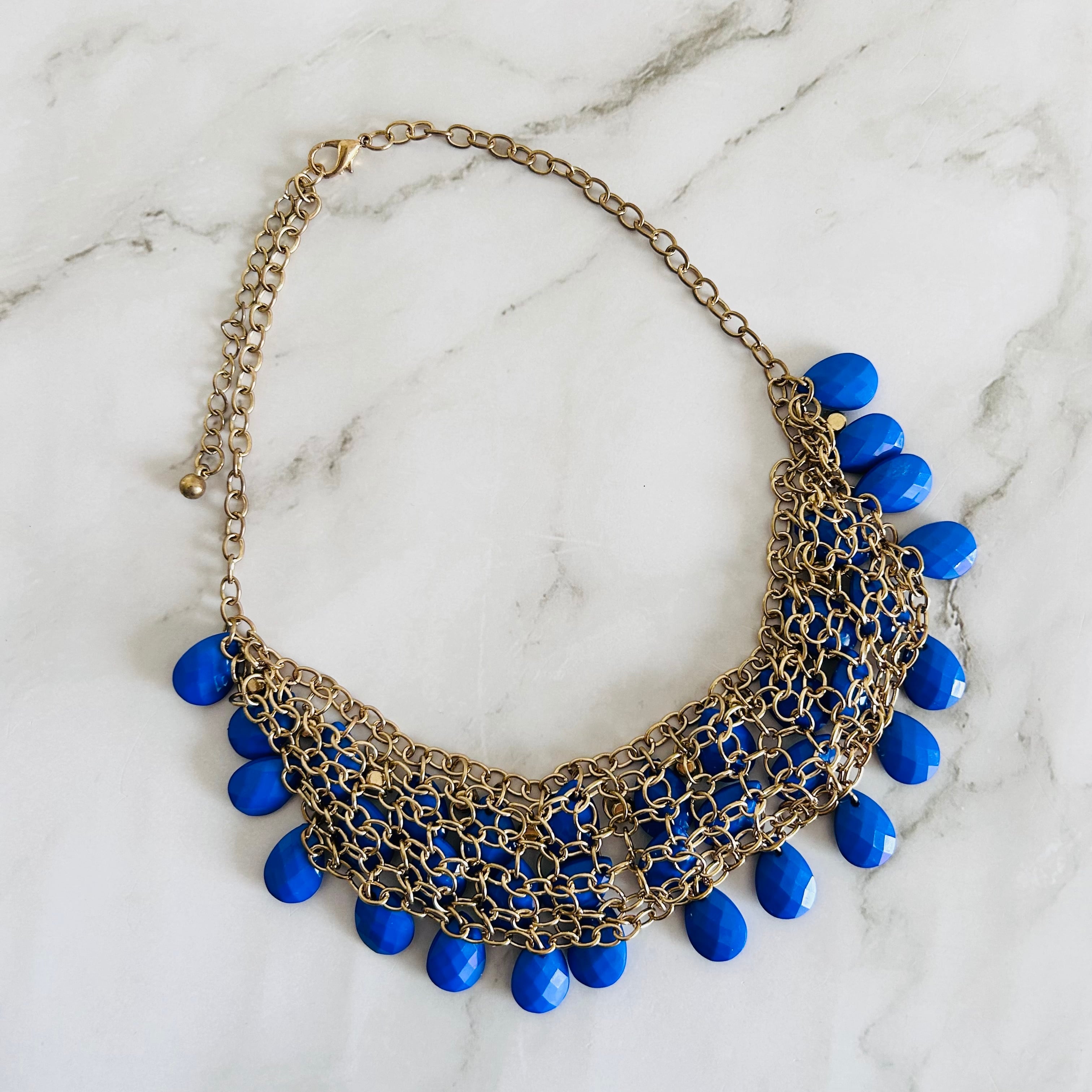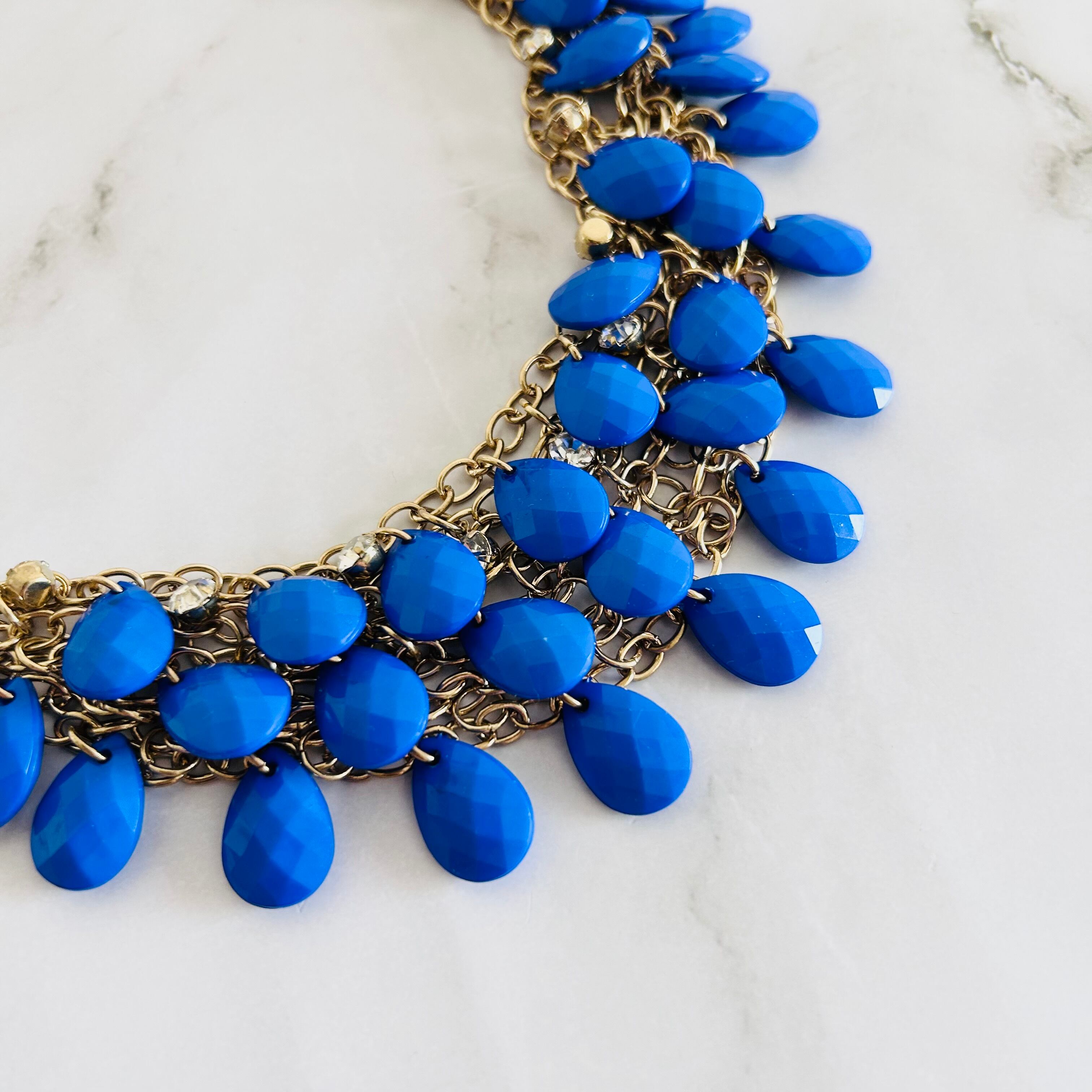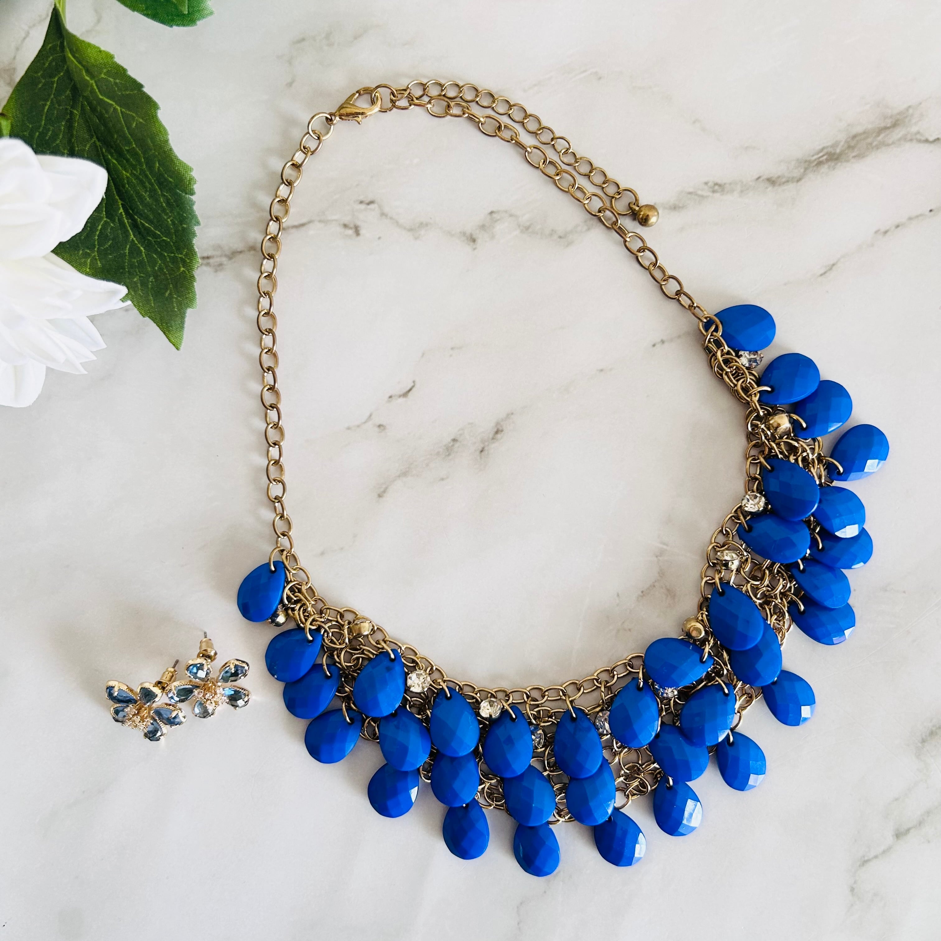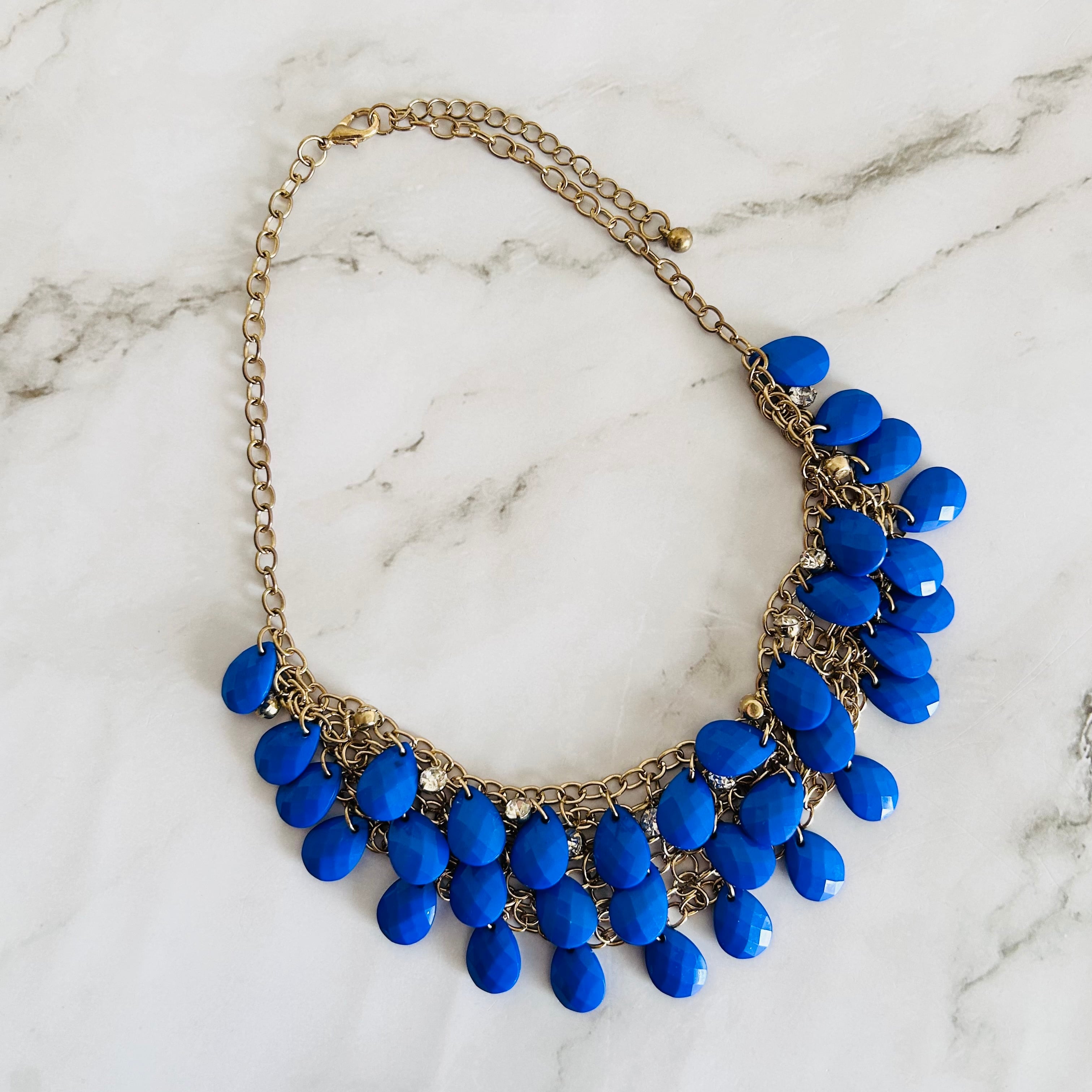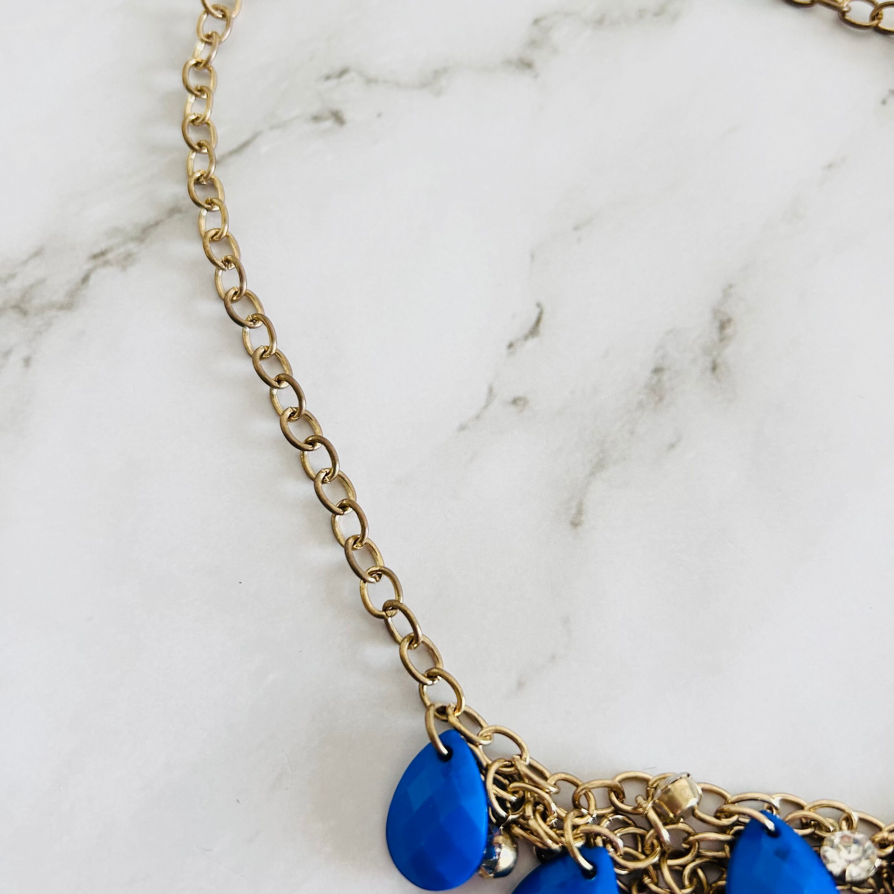 鮮やかなロイヤルブルーが目を惹くドロップ型パーツを贅沢にあしらった、華やかなネックレス。