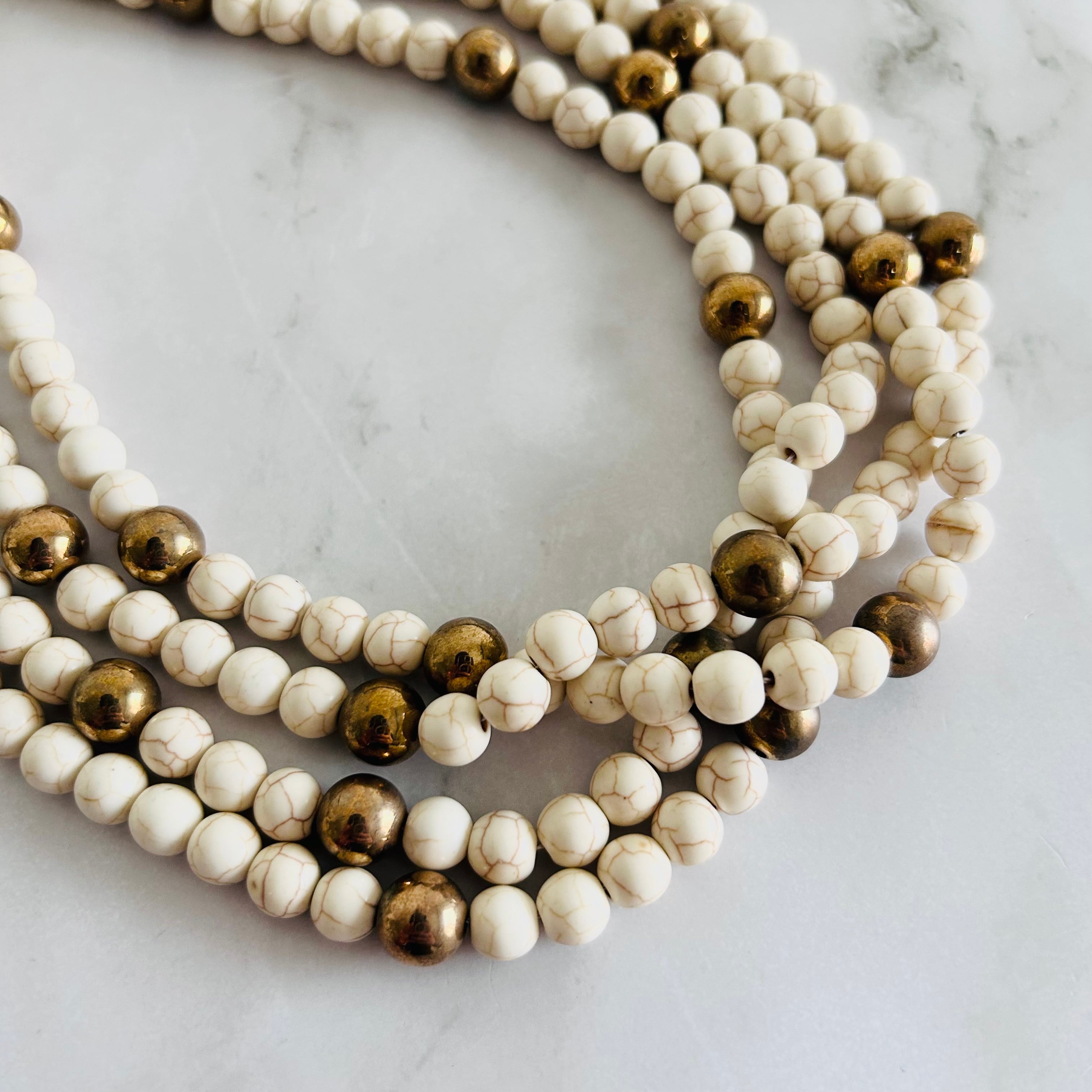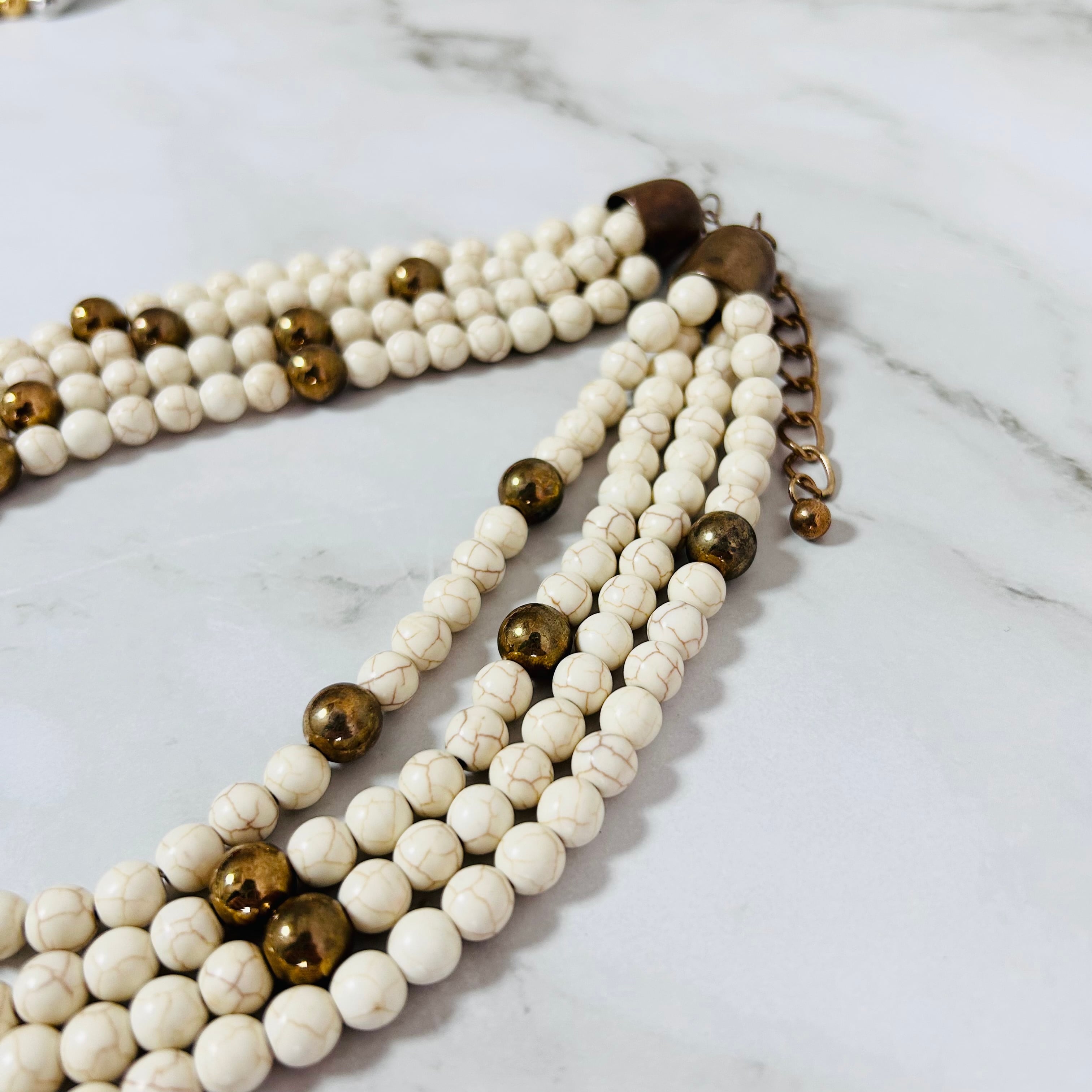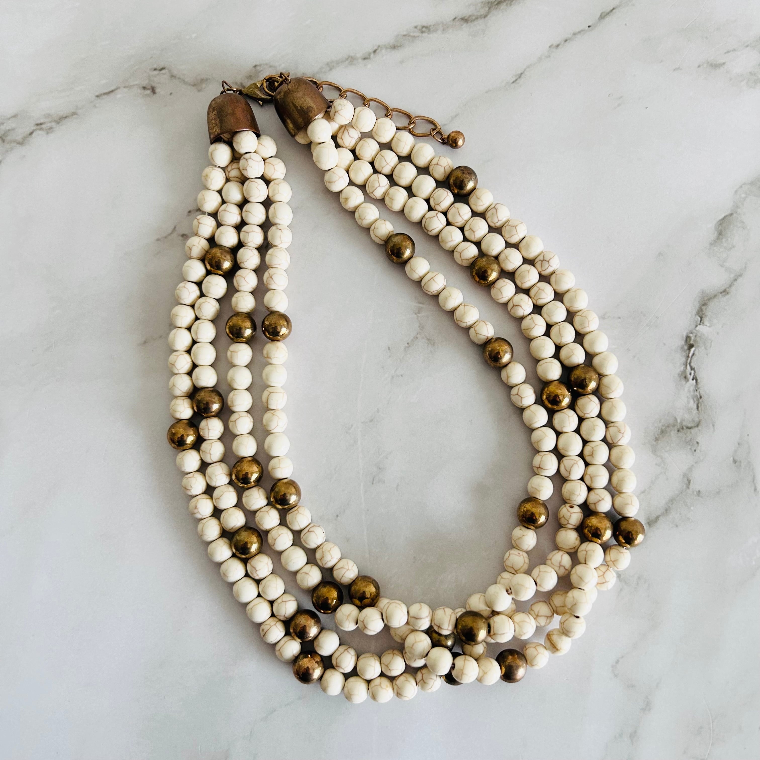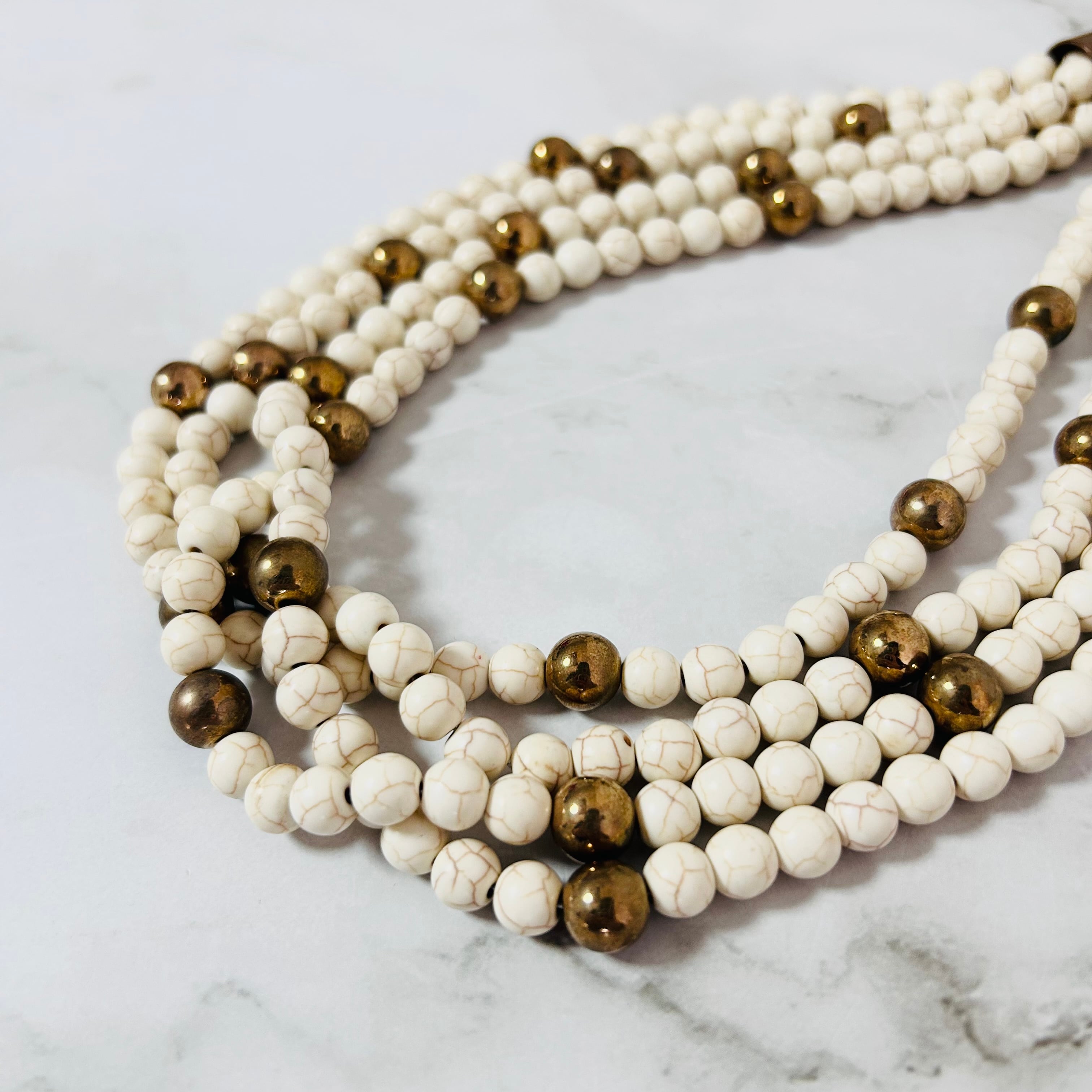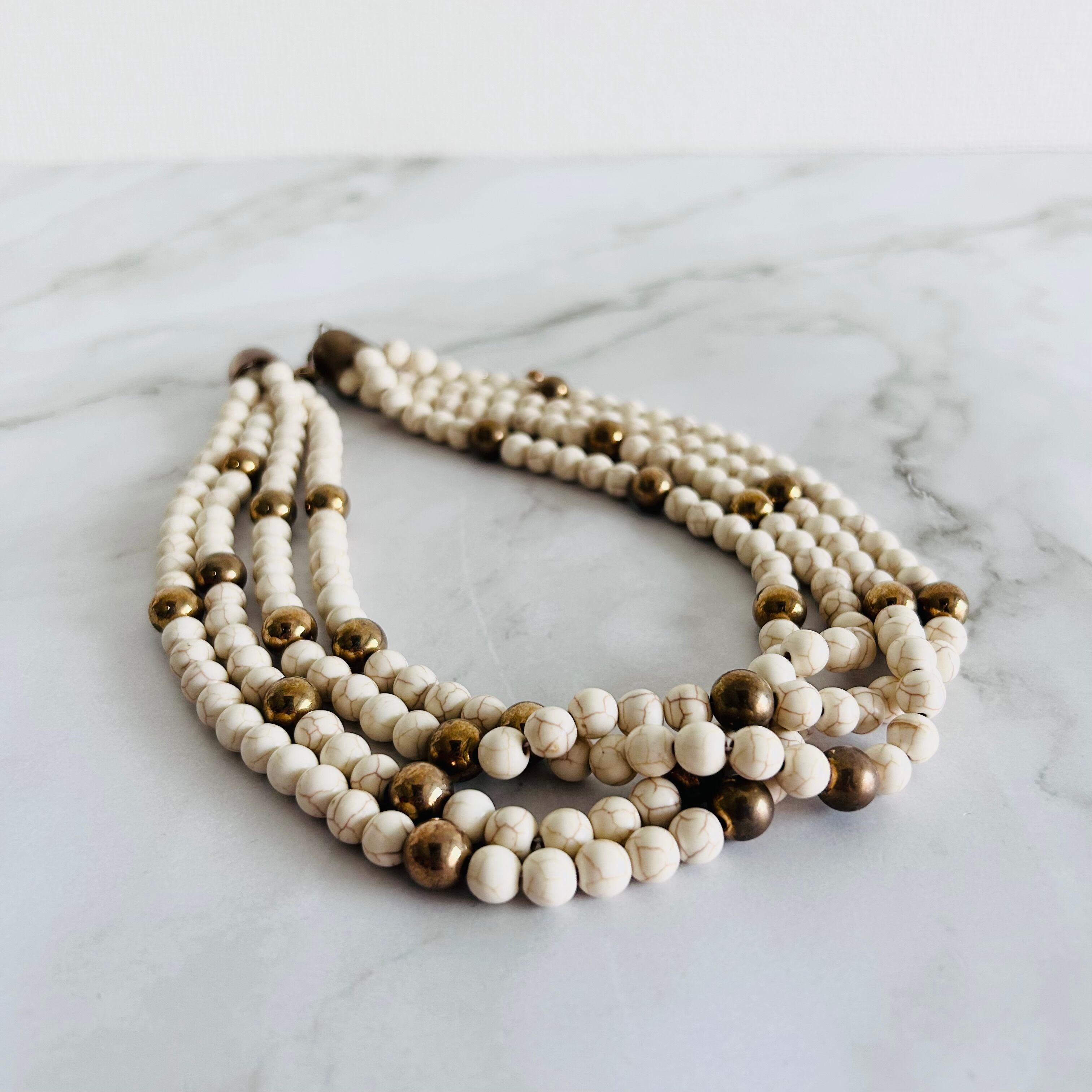 やわらかなアイボリーカラーのストーンビーズを贅沢に連ねた、存在感のあるネックレス。