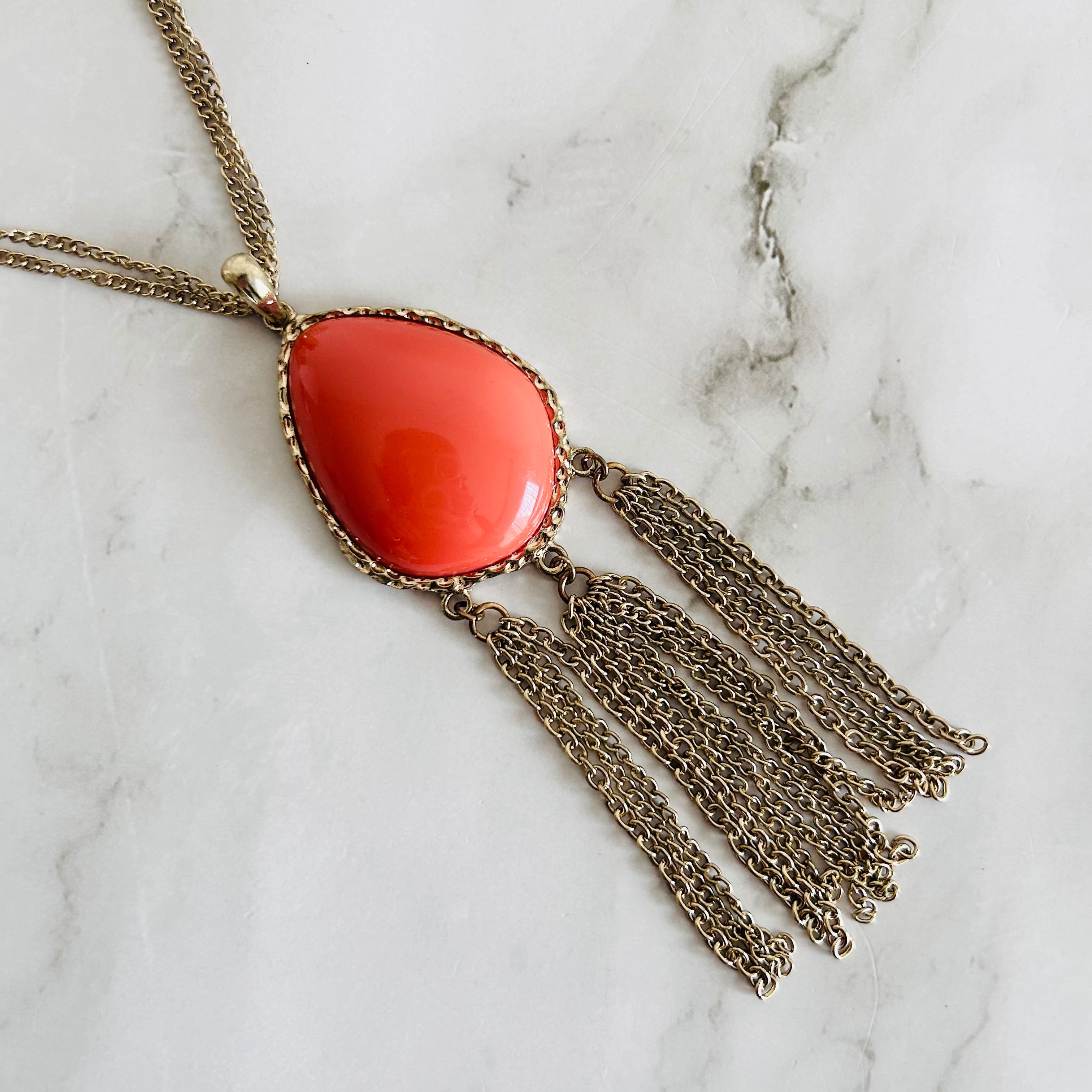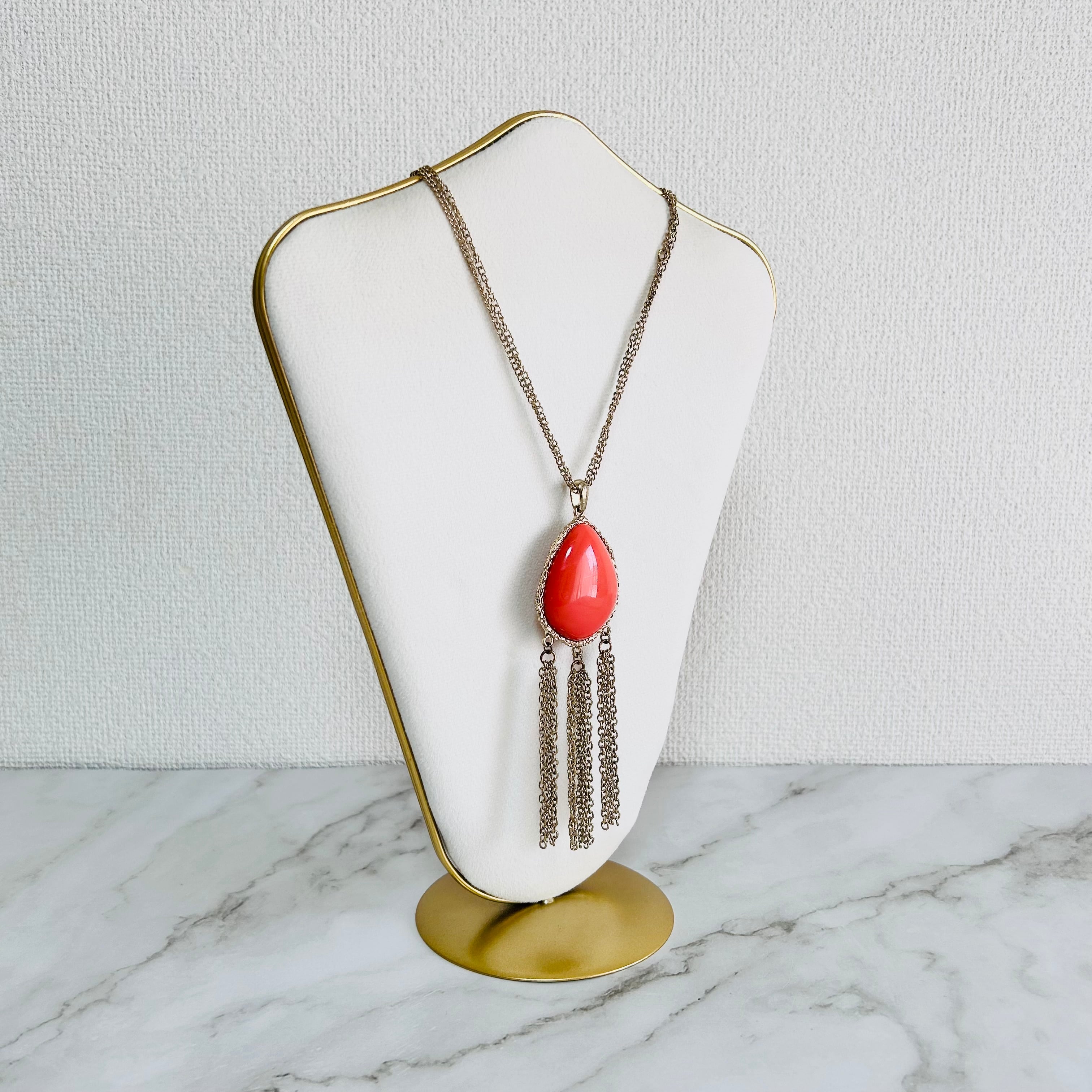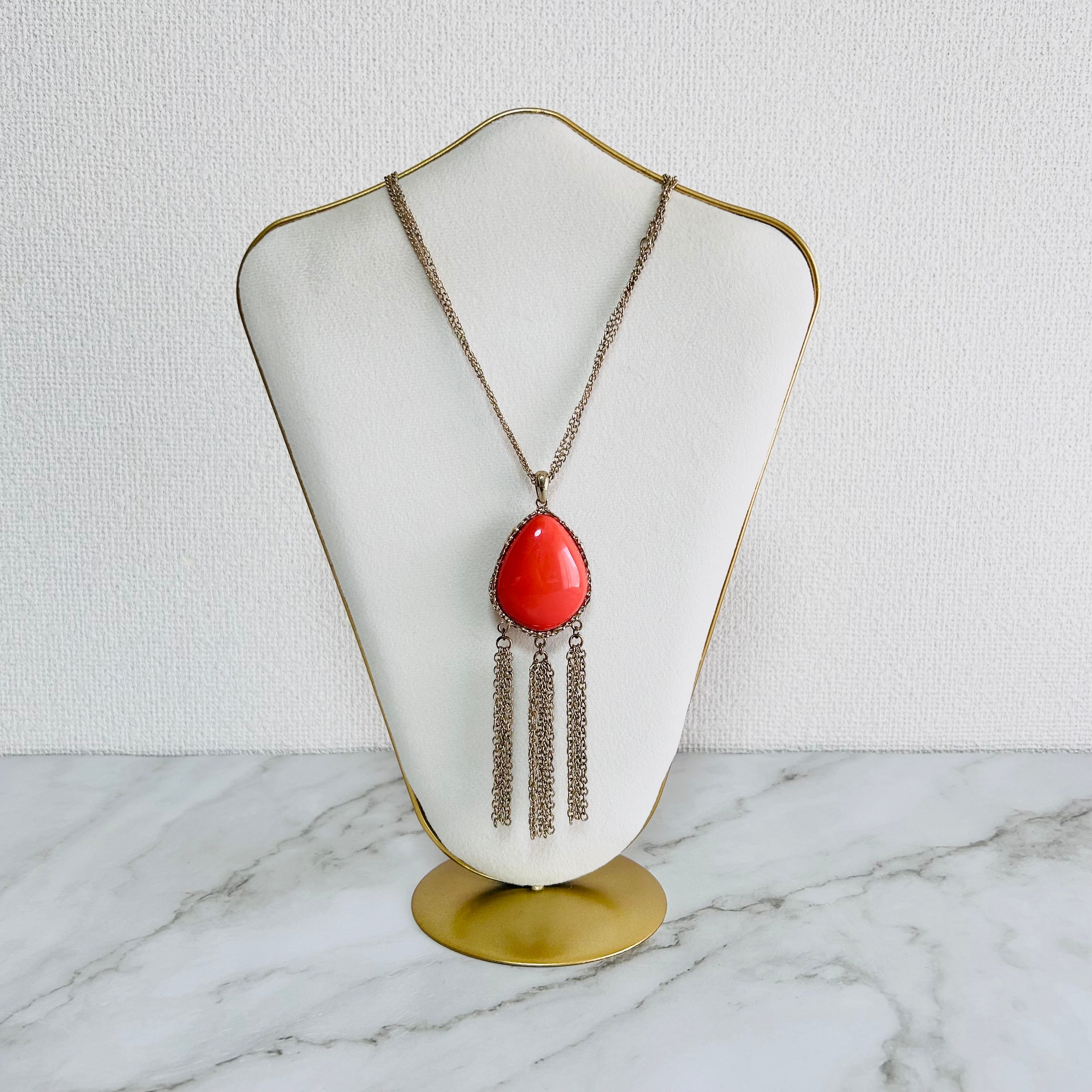 艶やかなオレンジレッドのパーツが印象的な、ロングタイプのネックレス。