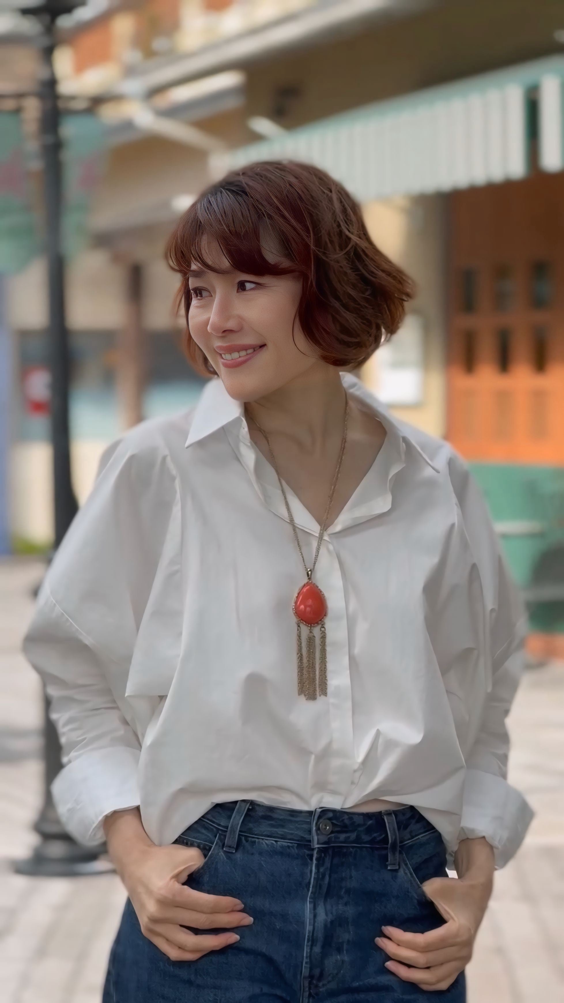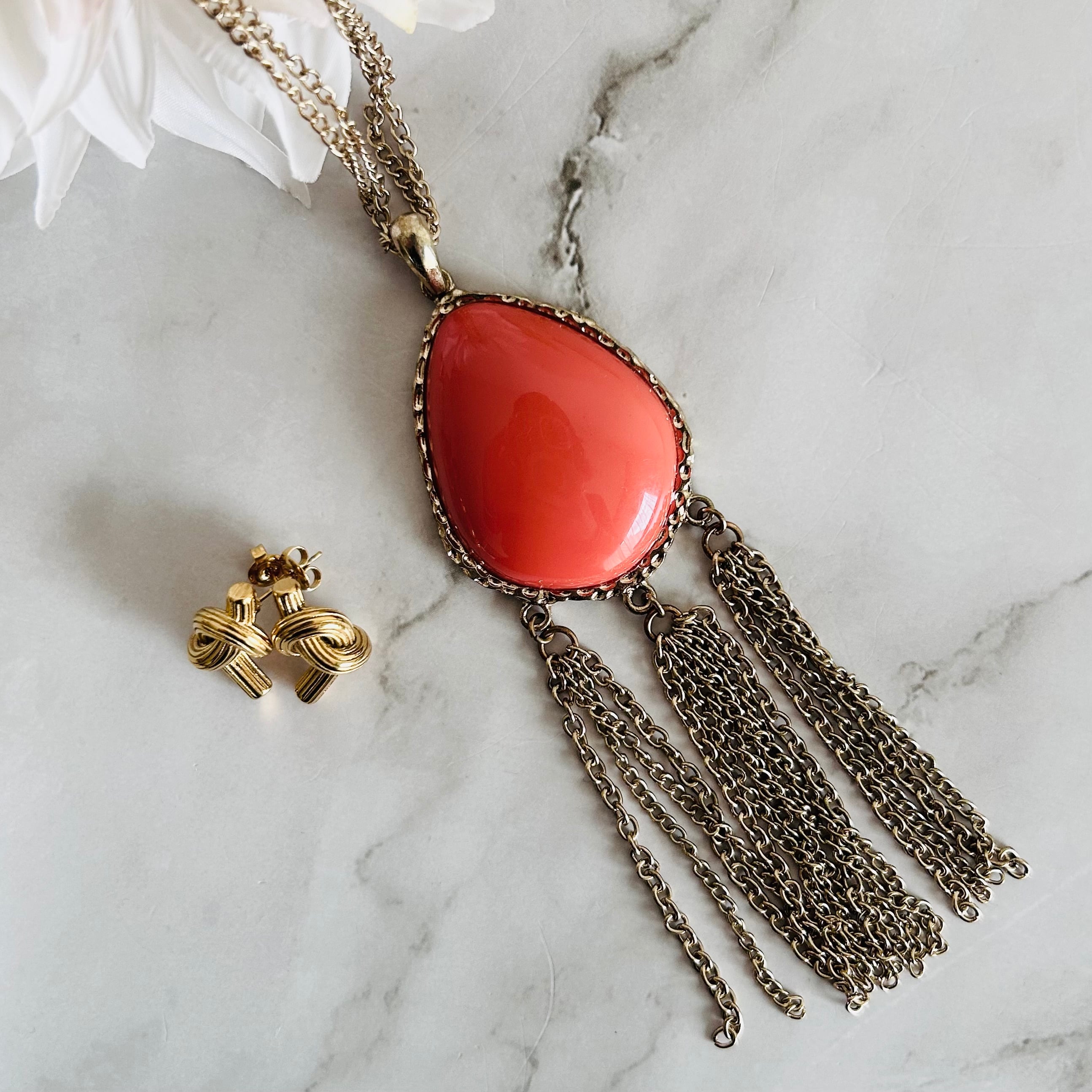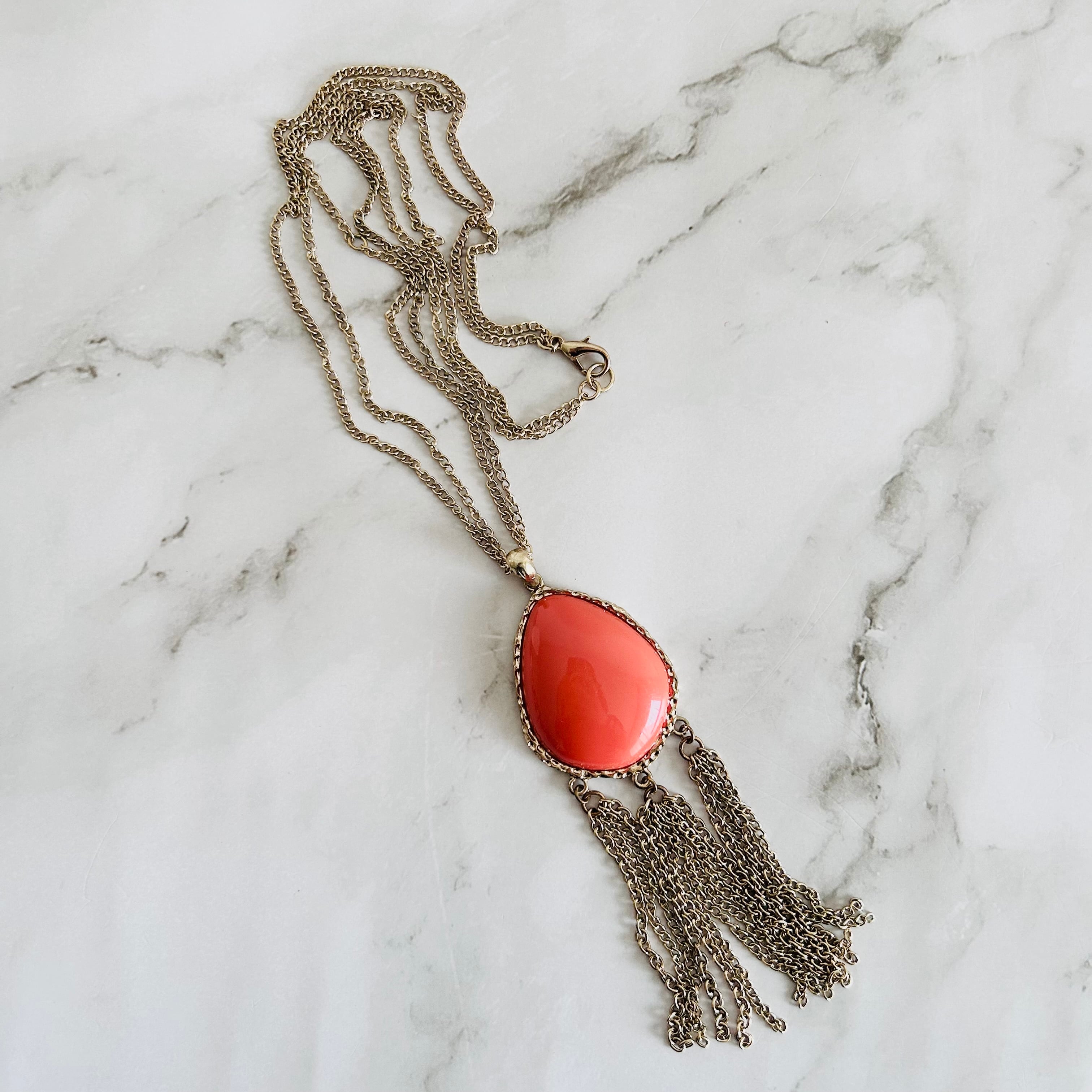 艶やかなオレンジレッドのパーツが印象的な、ロングタイプのネックレス。