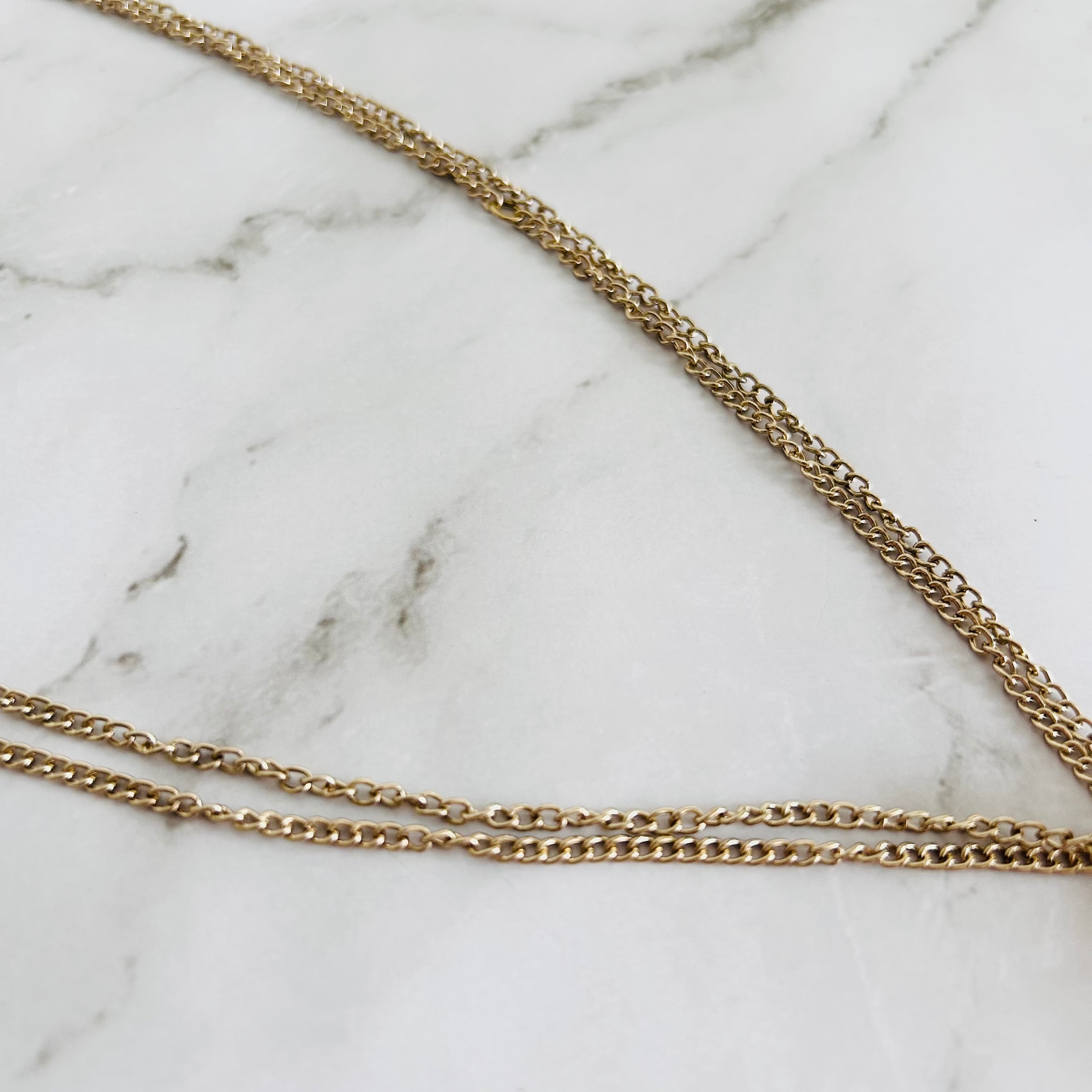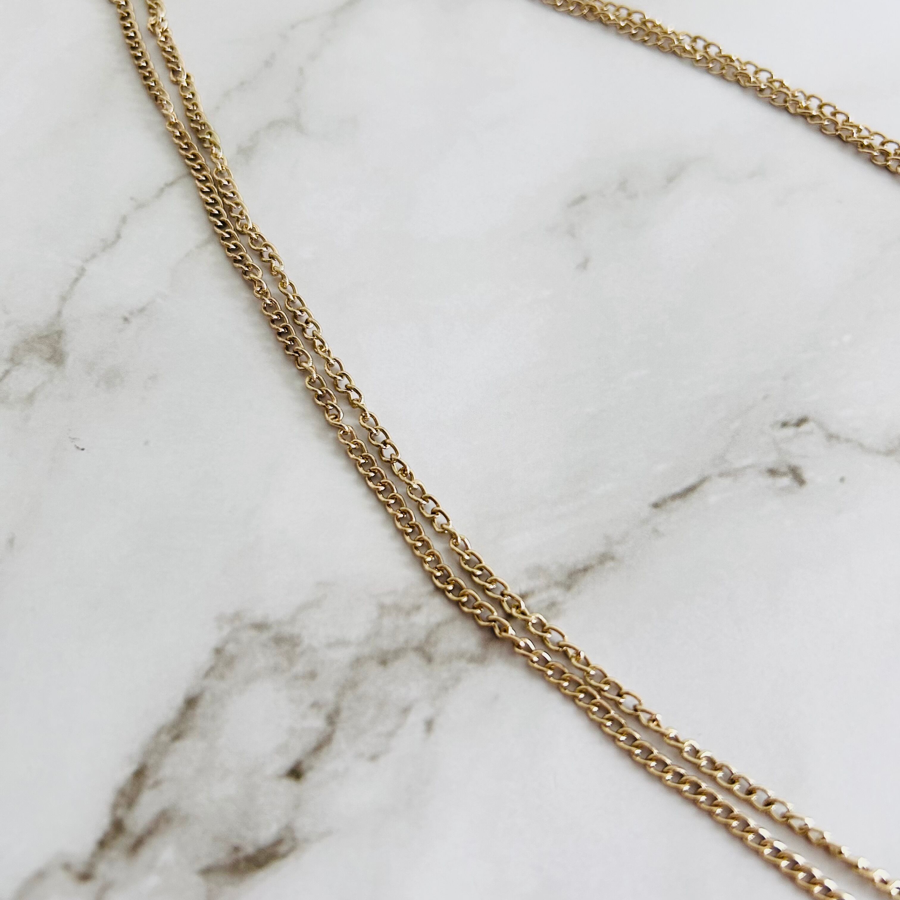 落ち着いたアンティーク調のゴールドチェーンとの組み合わせが、