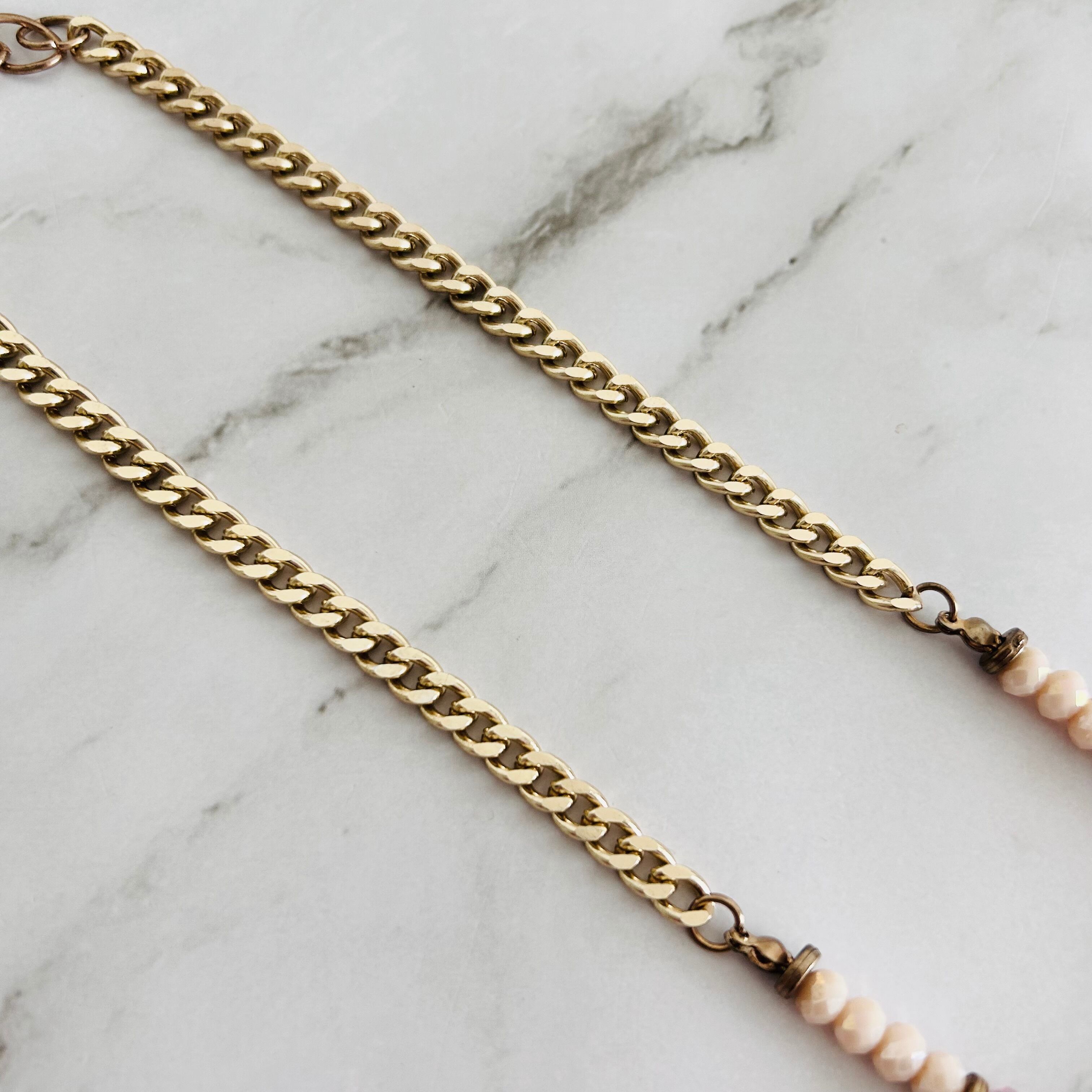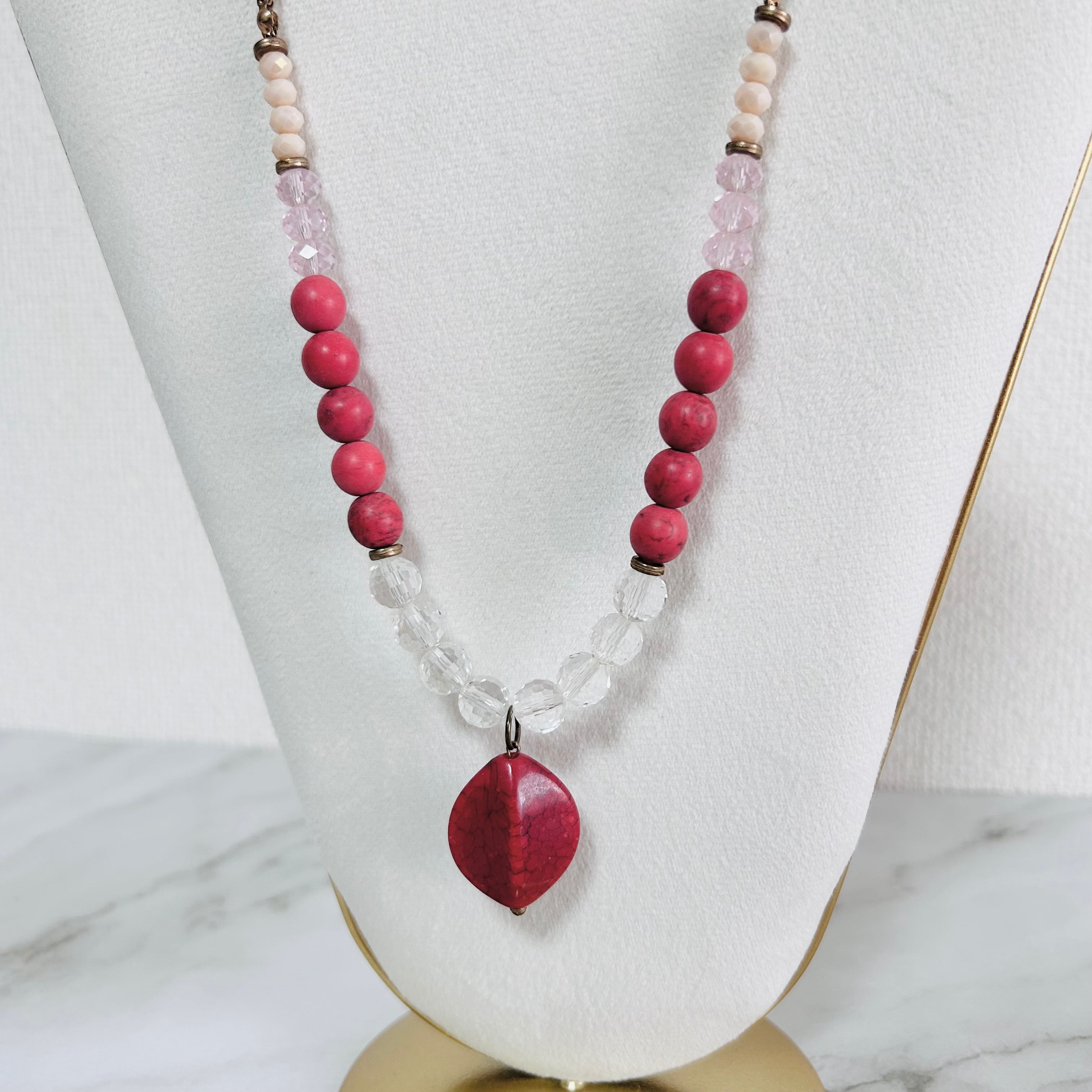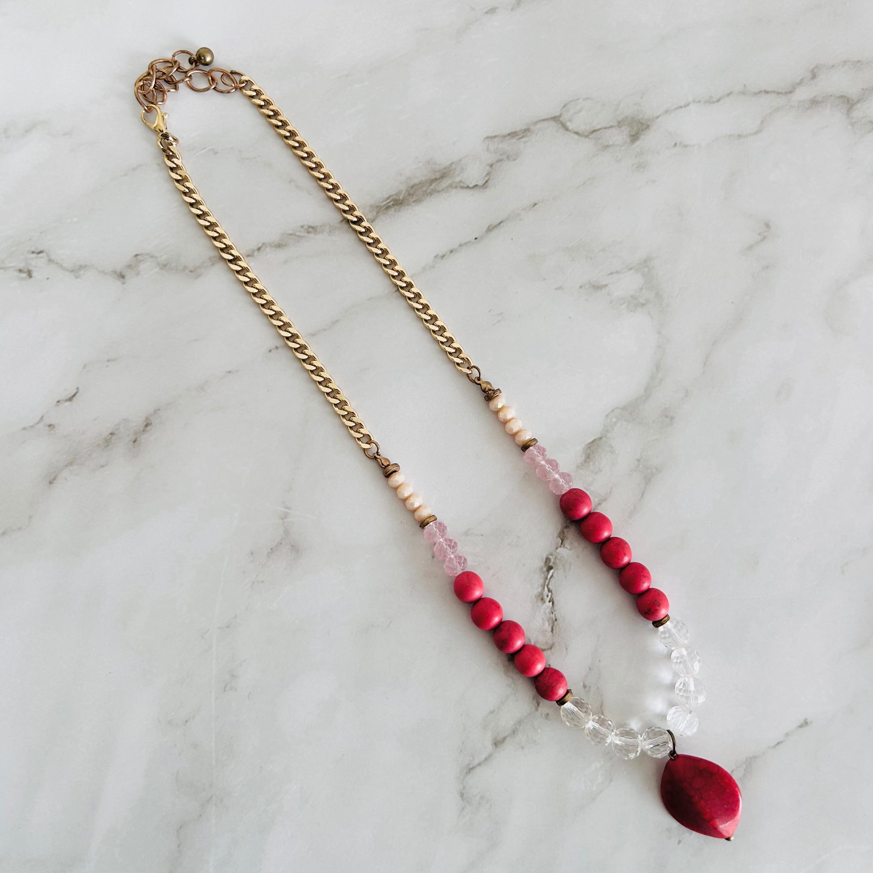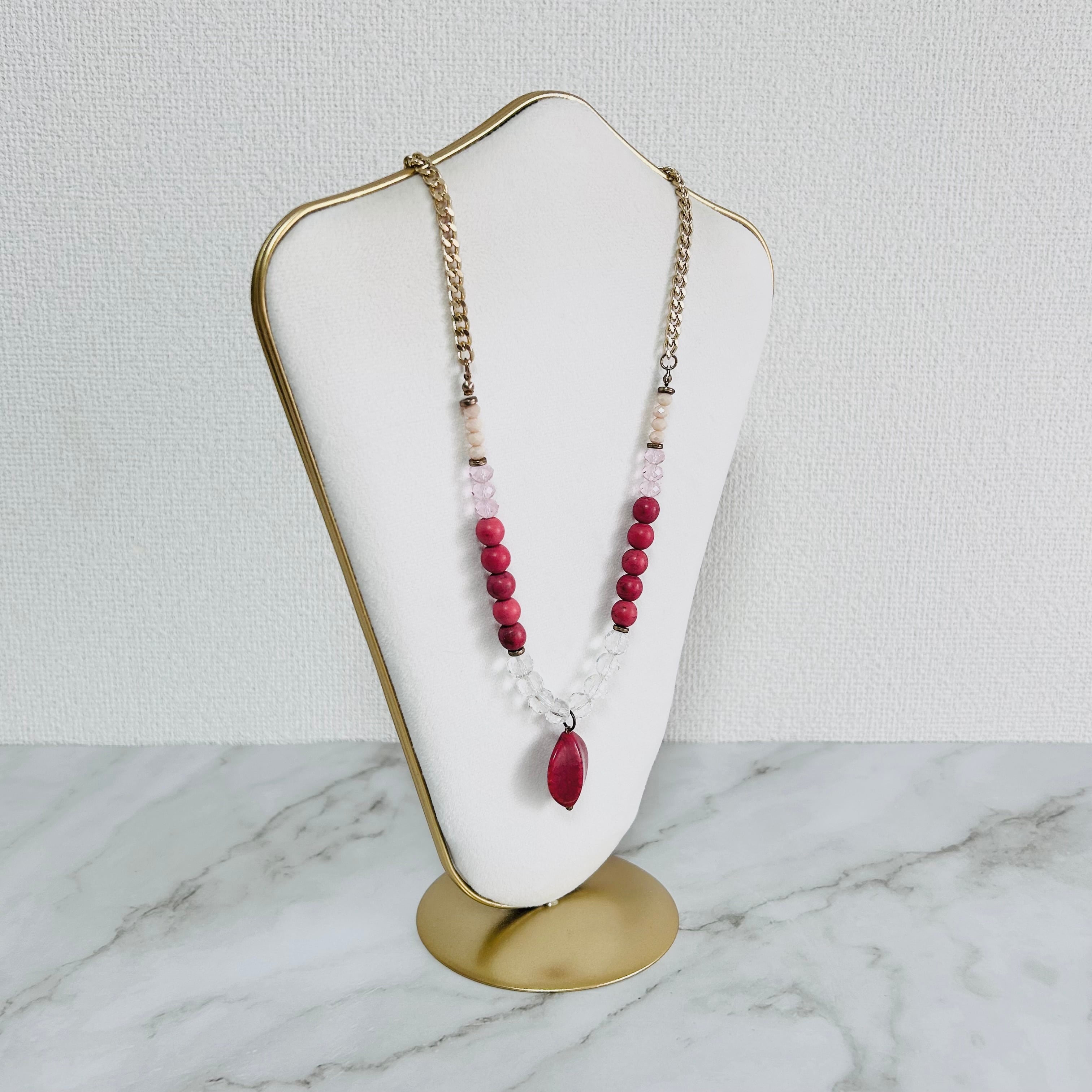 ゴールドチェーンに、レッド・ピンク・クリアの異なる表情のビーズを組み合わせたロングネックレス。