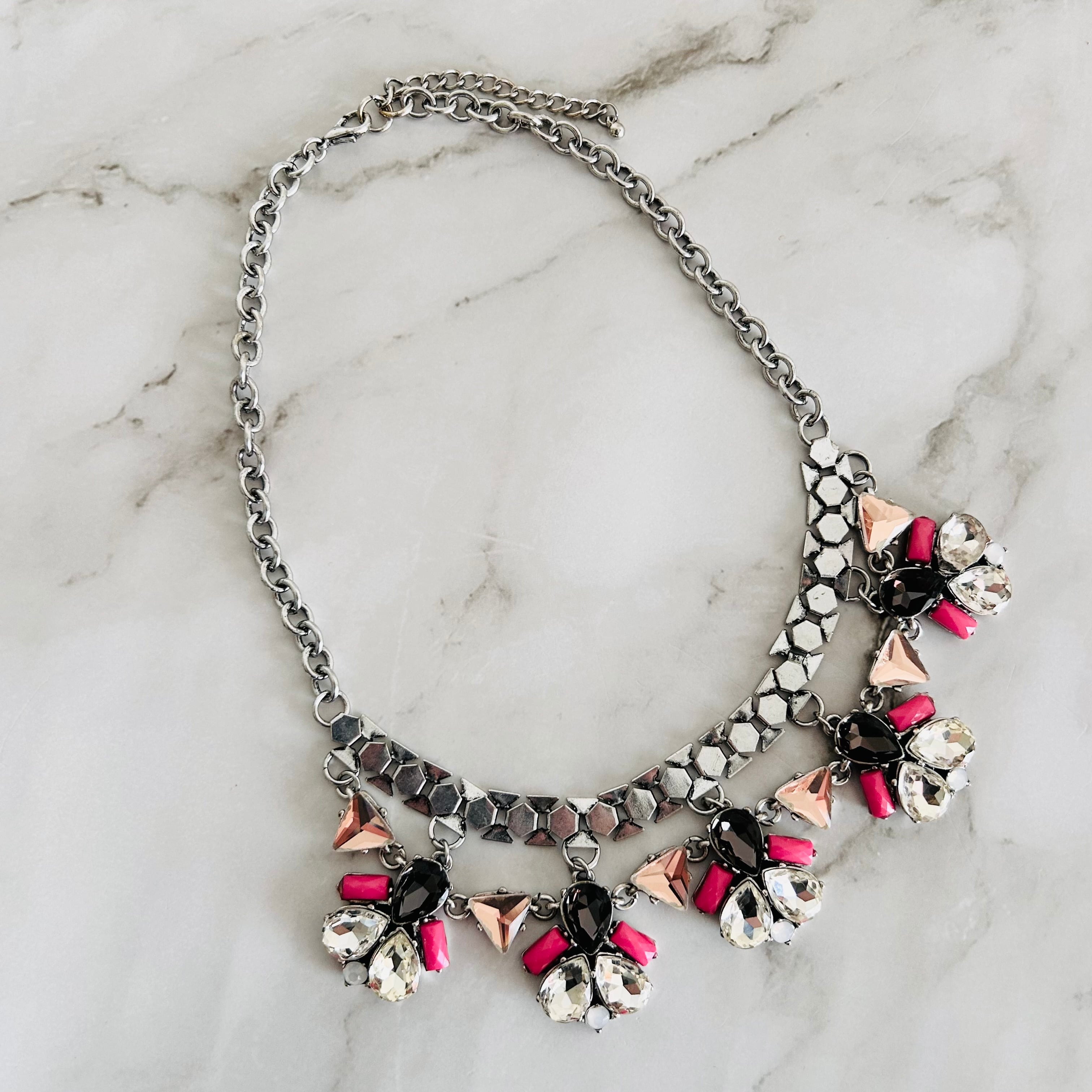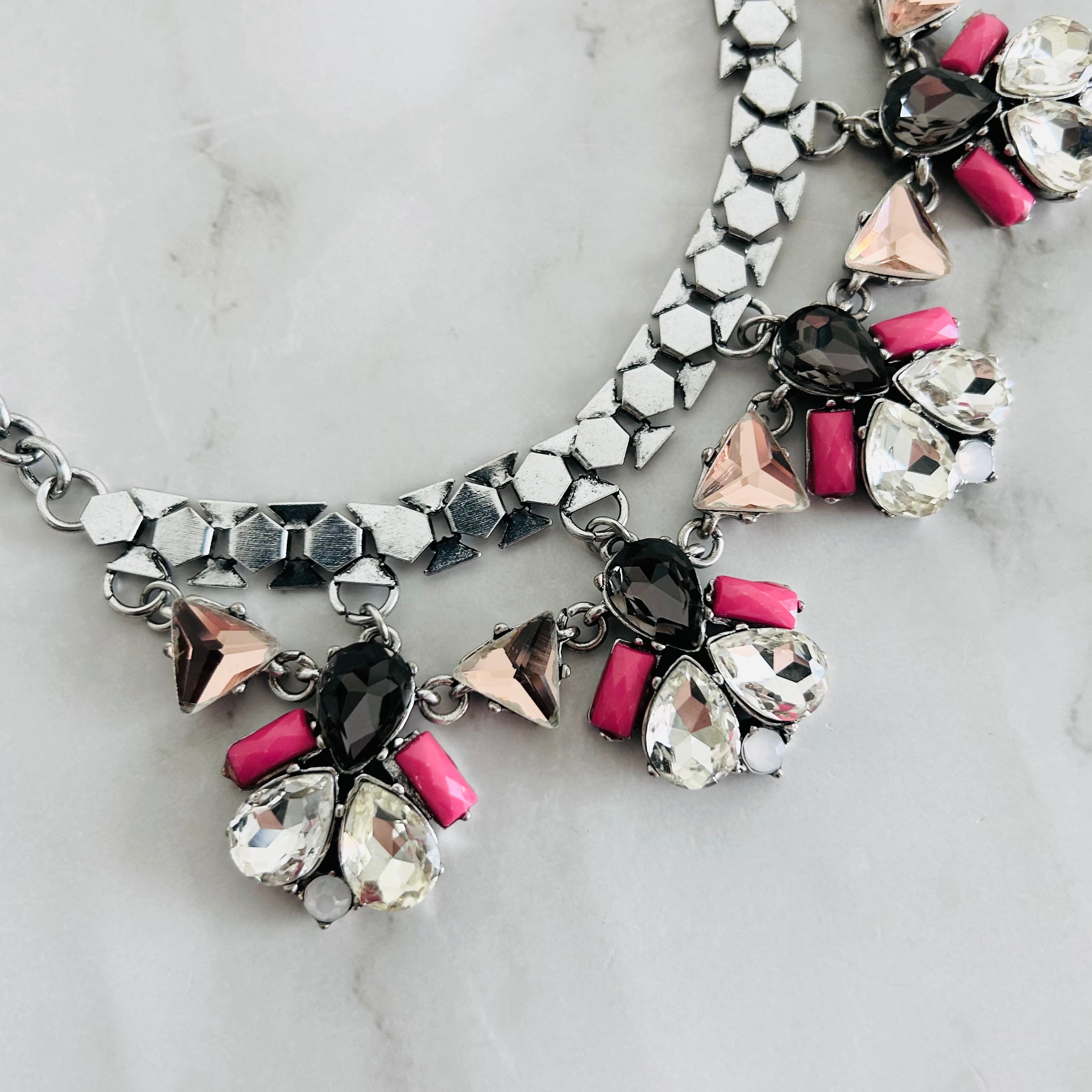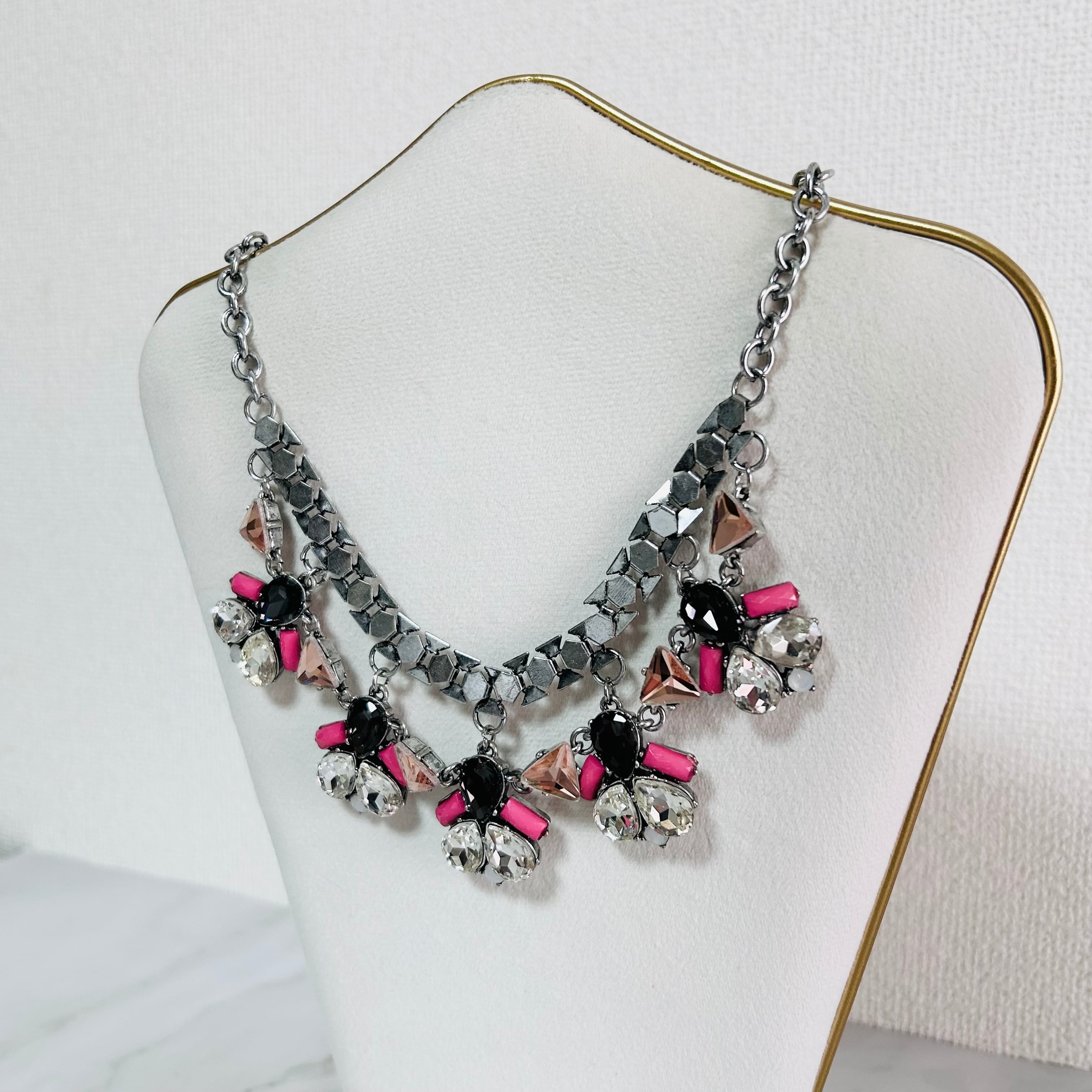 シルバートーンのチェーンに、カットの美しいカラフルなクリスタルとブラック、そして鮮やかなピンクのパーツを組み合わせた華やかなネックレス。