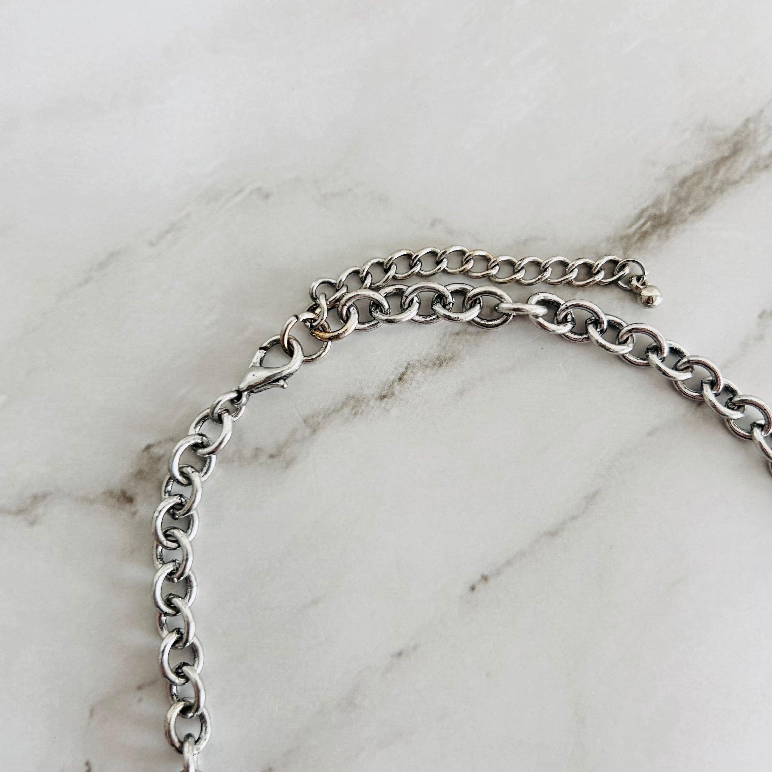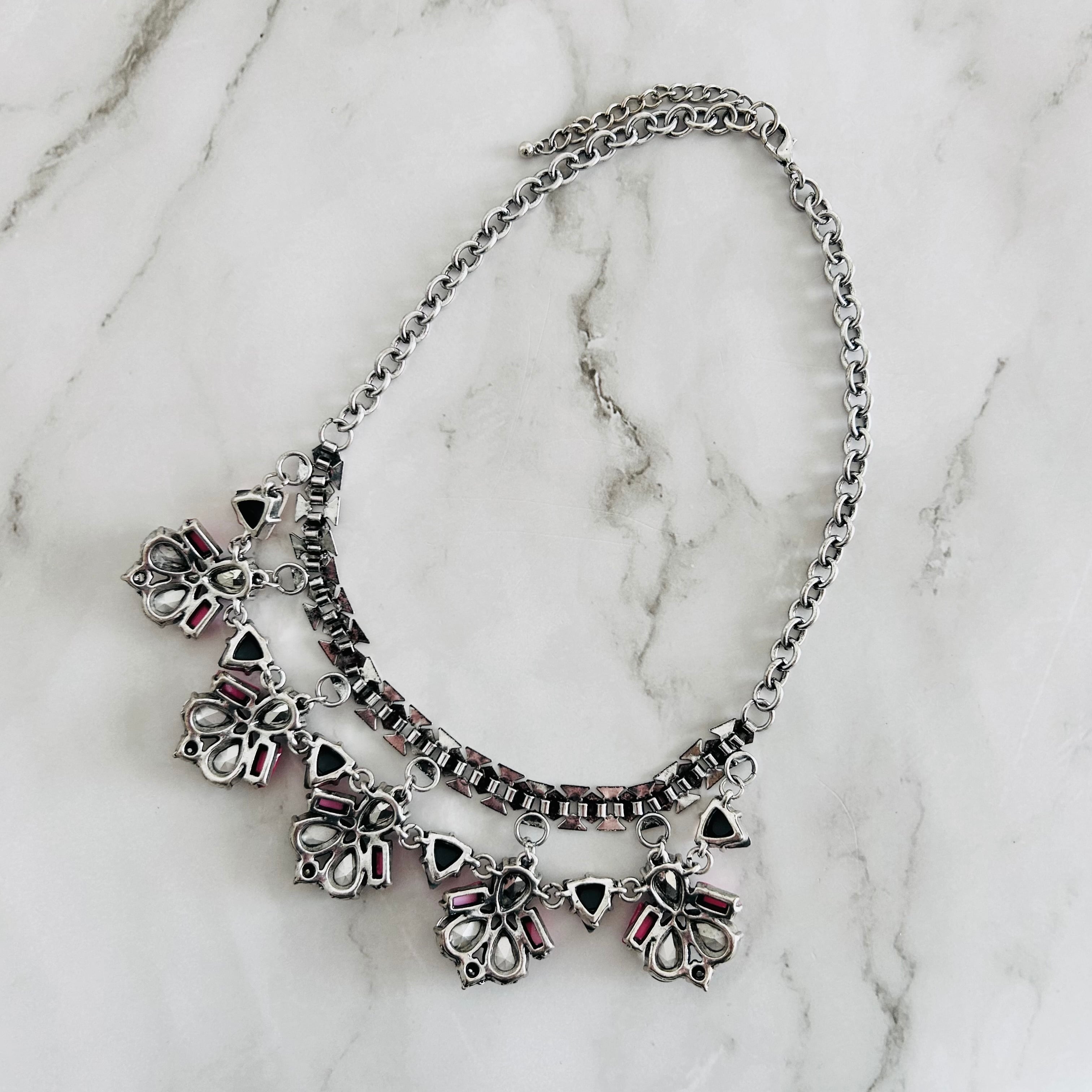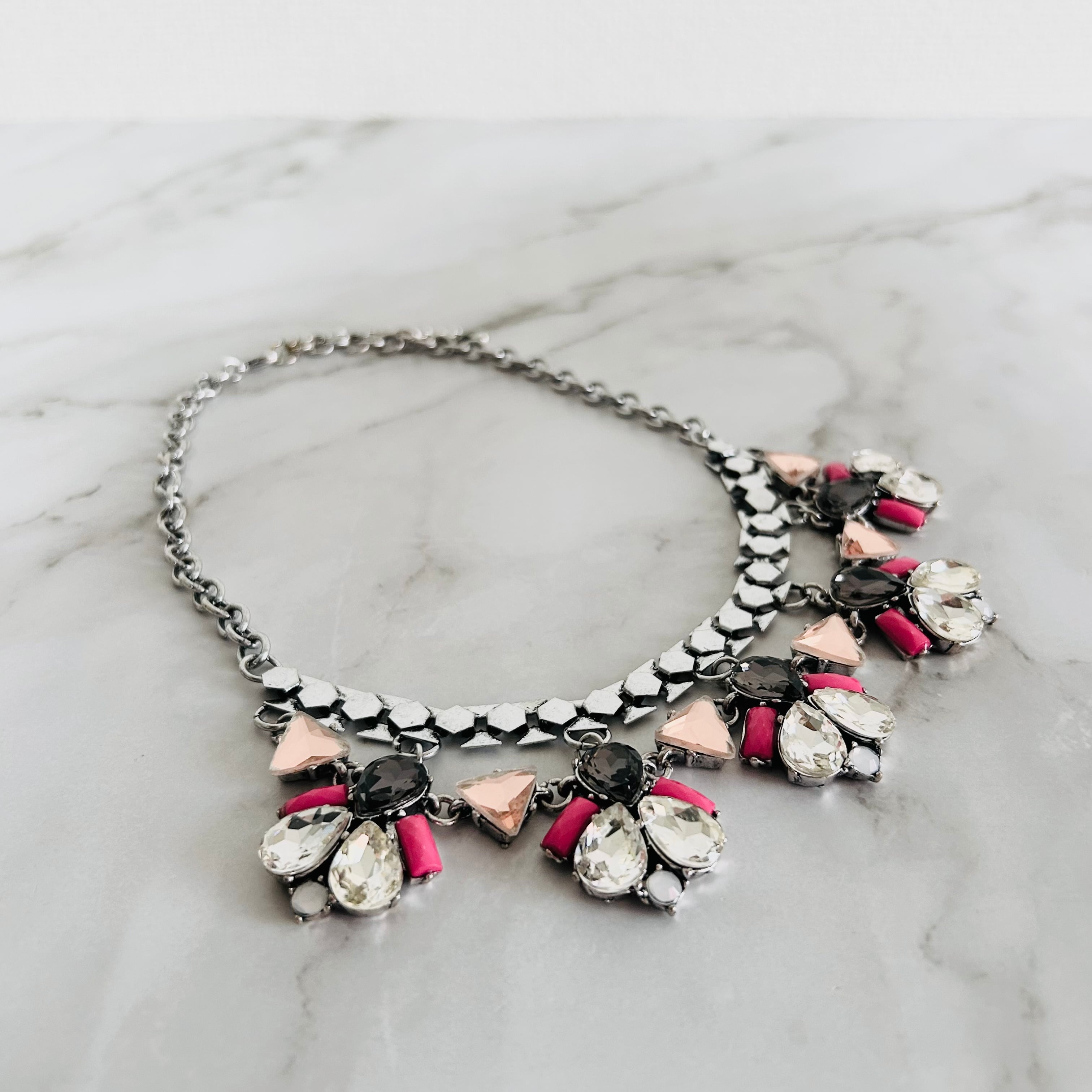 シルバートーンのチェーンに、カットの美しいカラフルなクリスタルとブラック、そして鮮やかなピンクのパーツを組み合わせた華やかなネックレス。