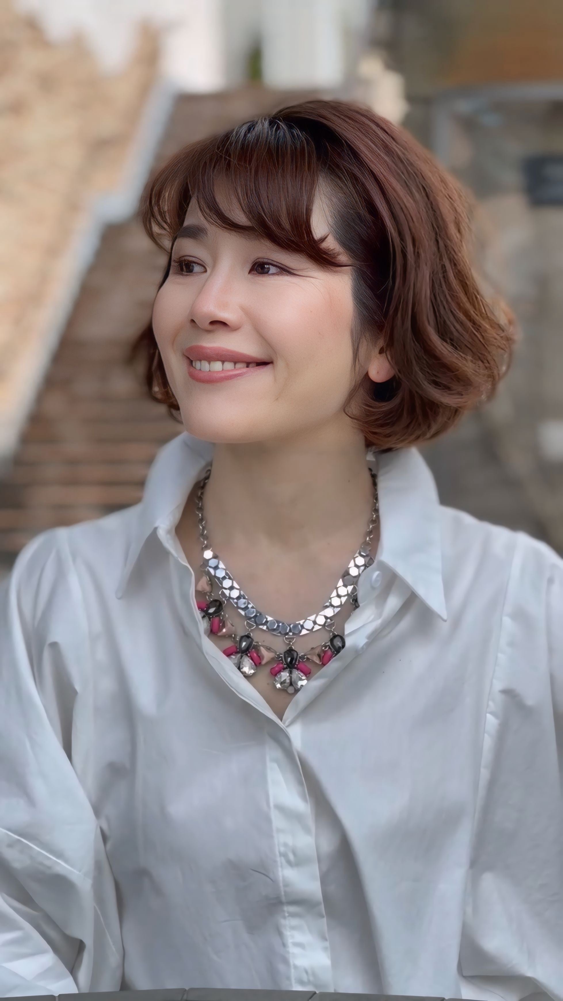 シンプルなニットやブラウスに合わせるだけで、顔まわりがぐっと華やぎ、