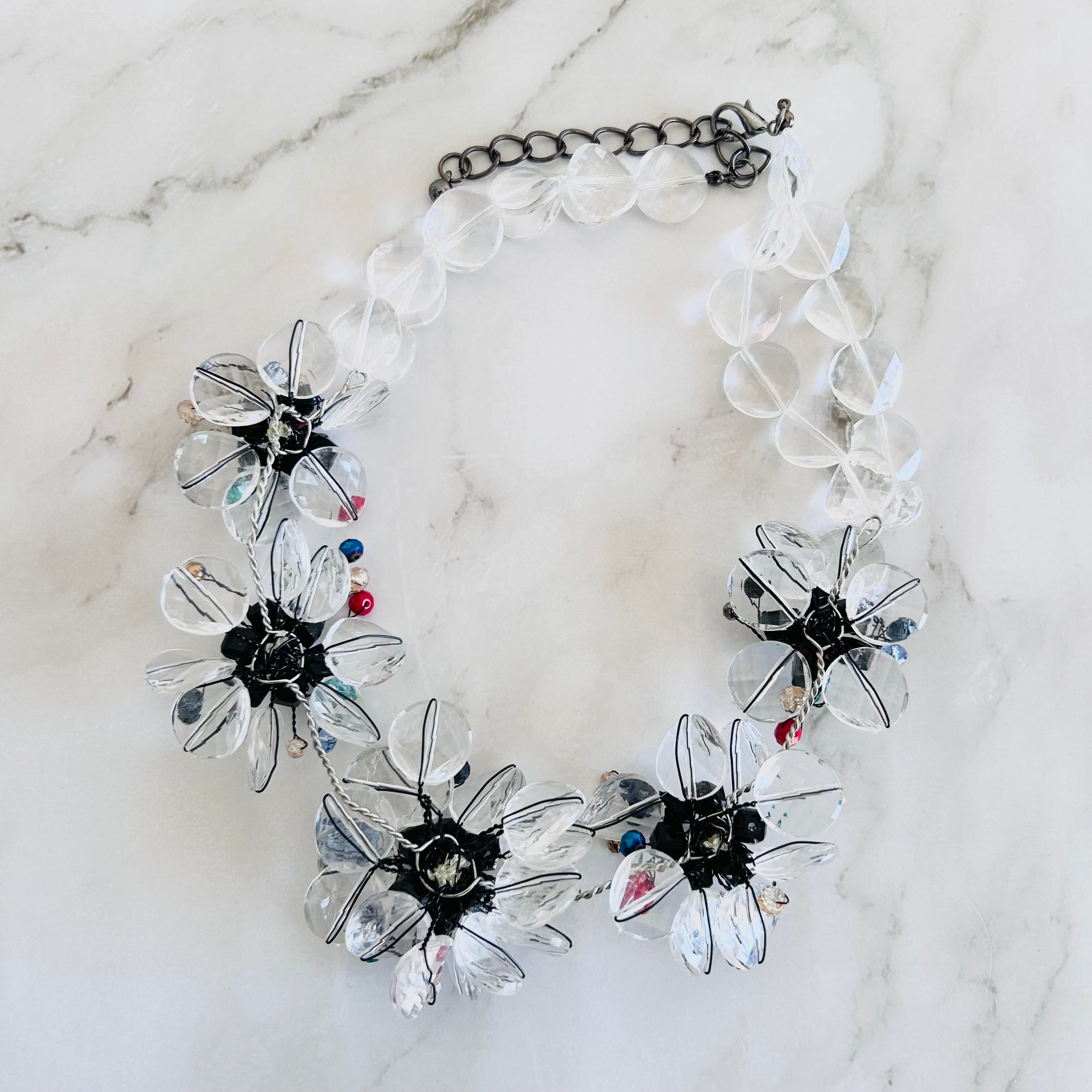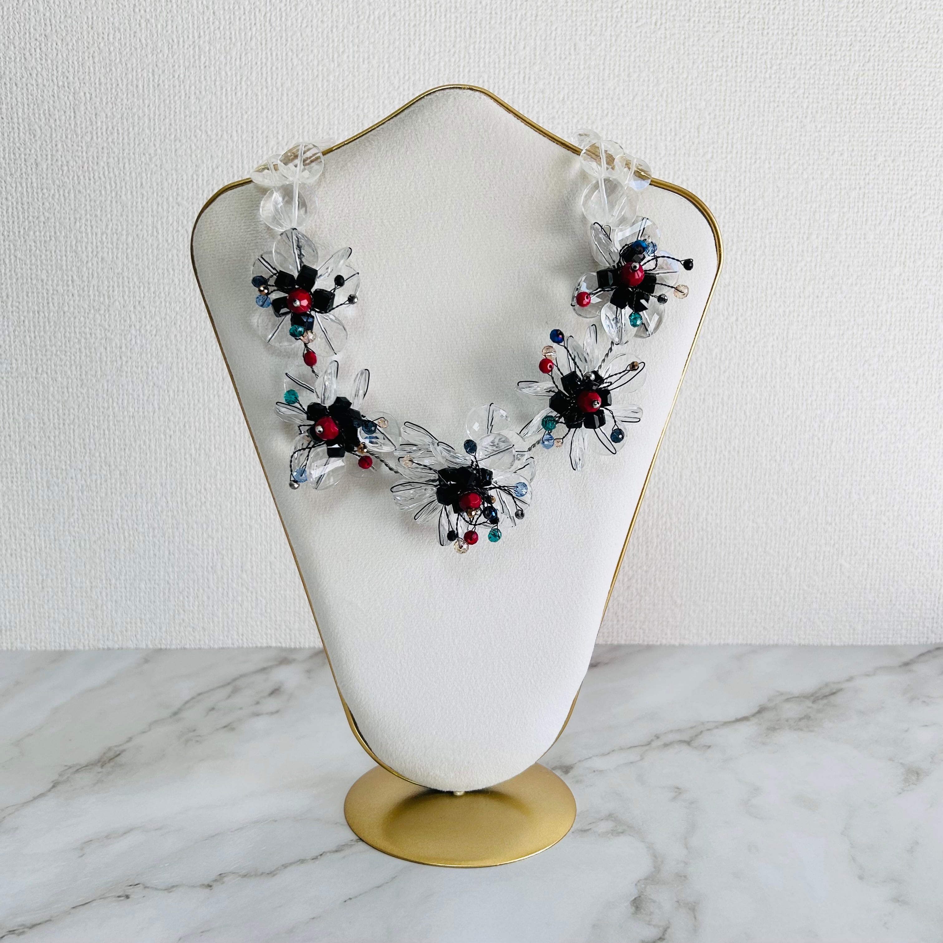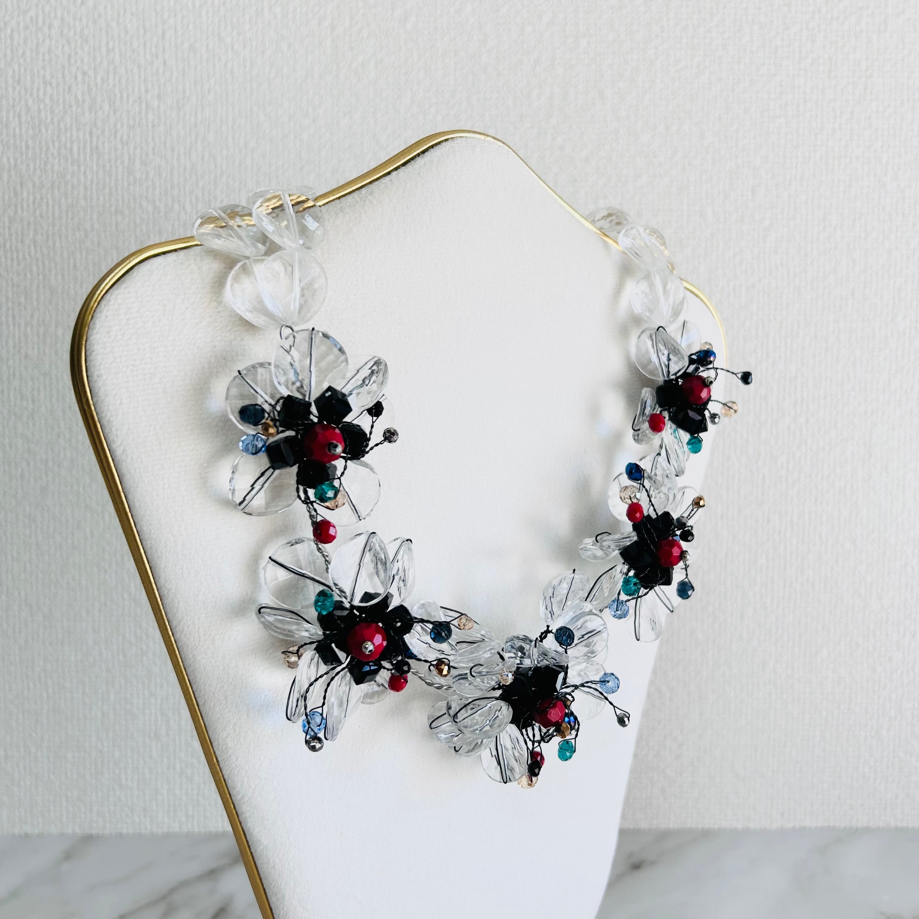 透明感あふれるクリアパーツに、立体的なフラワーモチーフをあしらった、華やかで個性が光るネックレス。