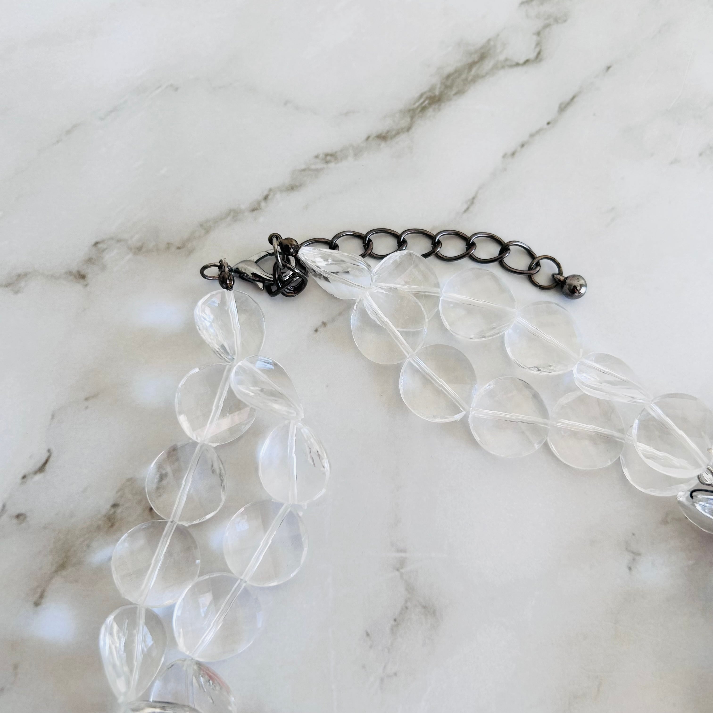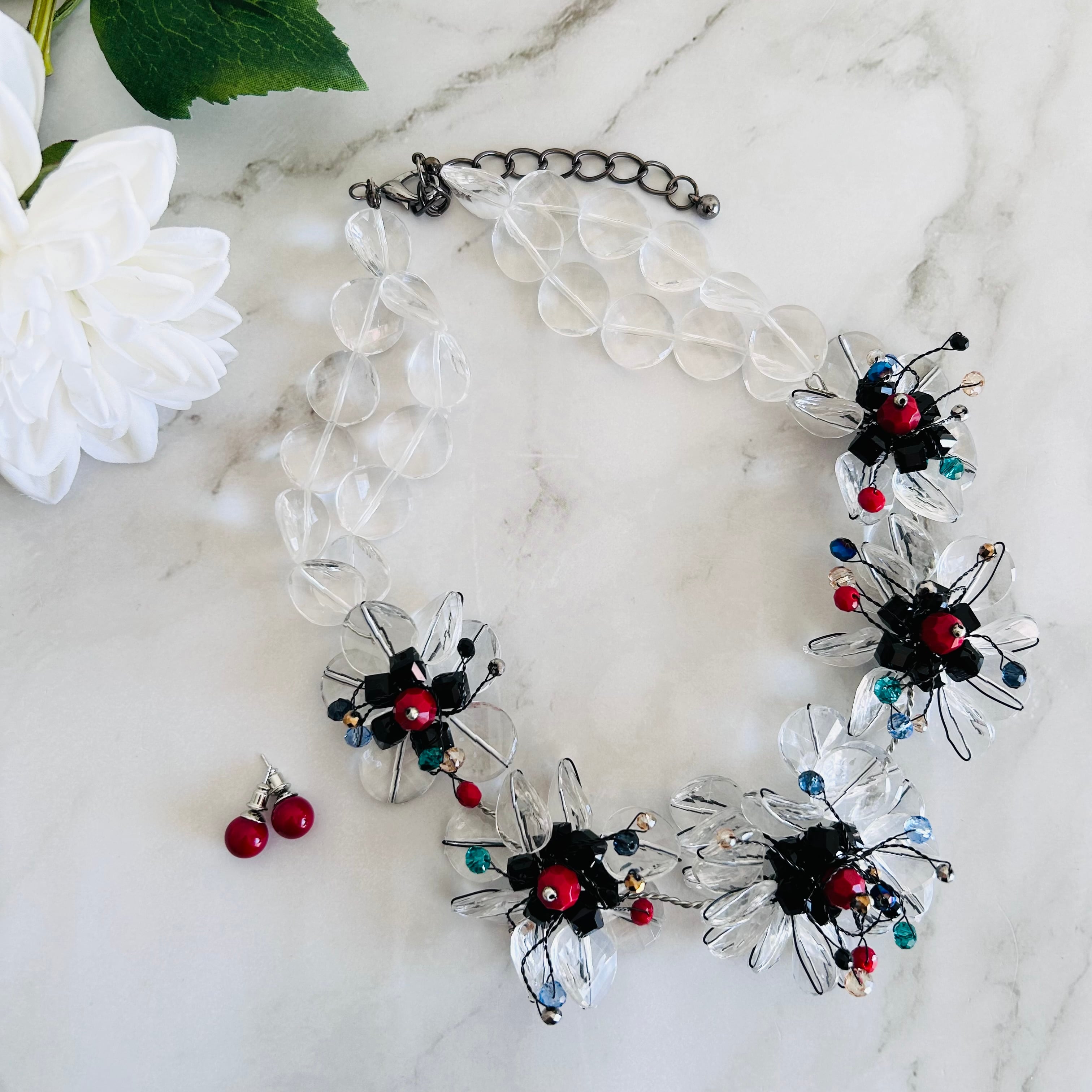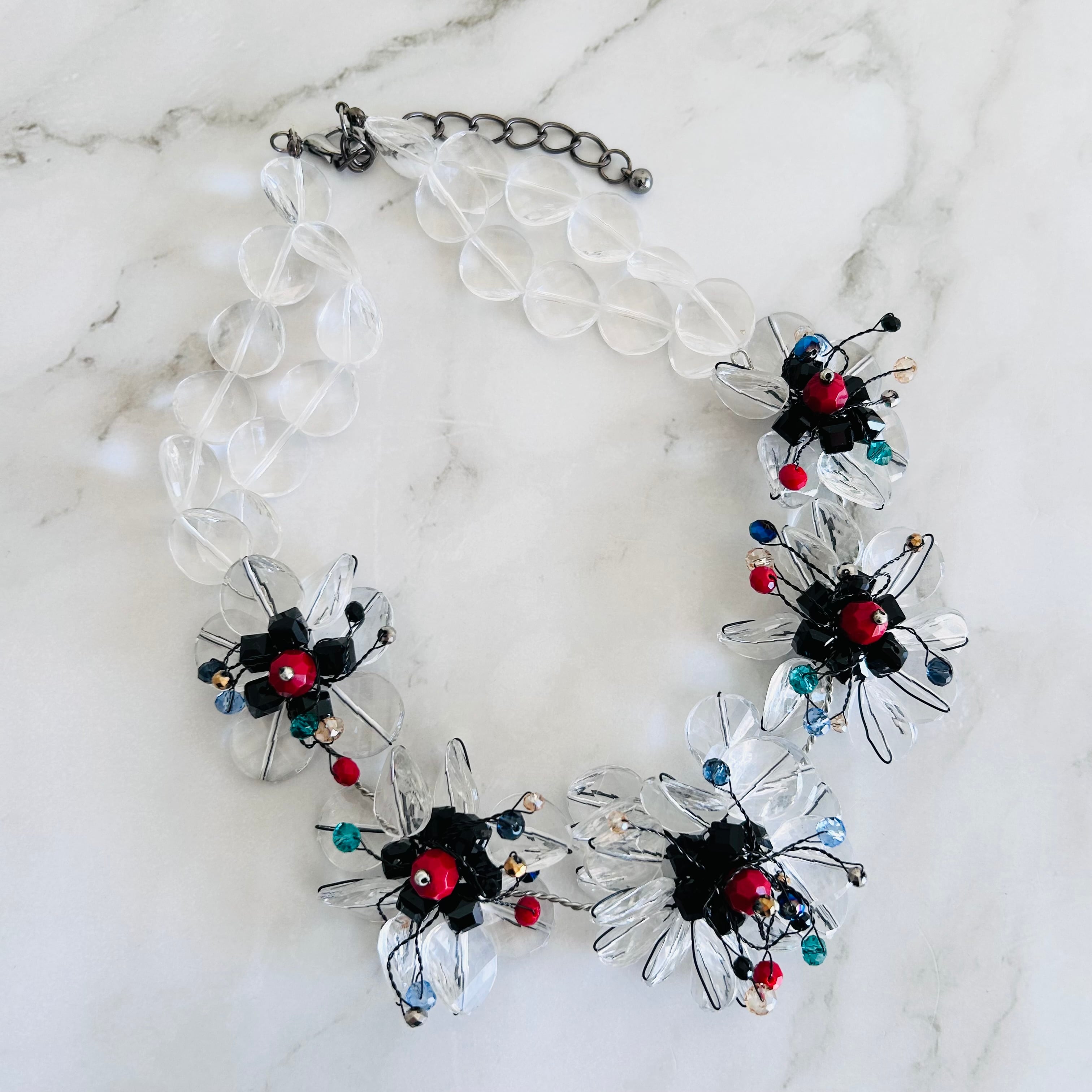 透明感あふれるクリアパーツに、立体的なフラワーモチーフをあしらった、華やかで個性が光るネックレス。