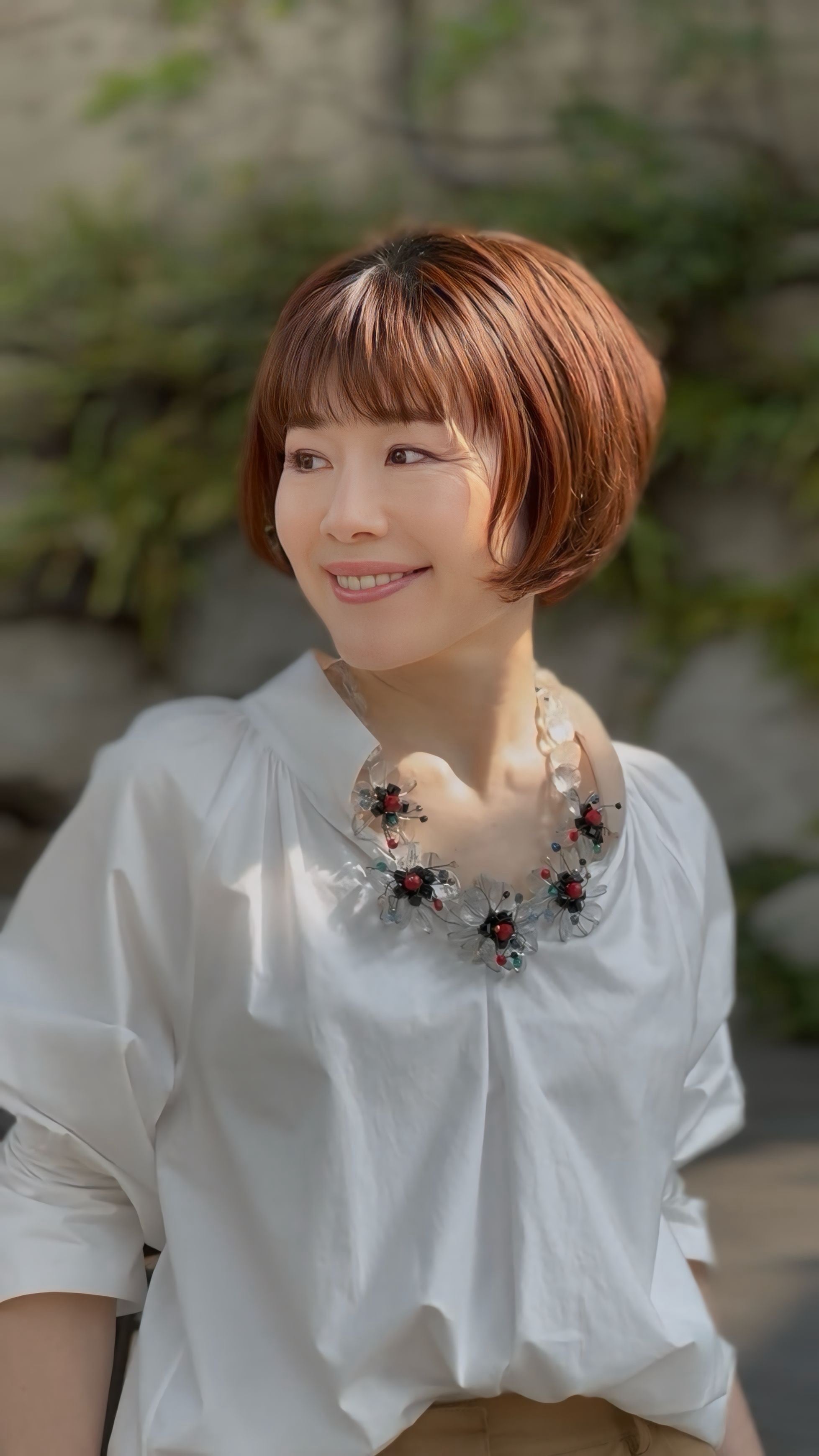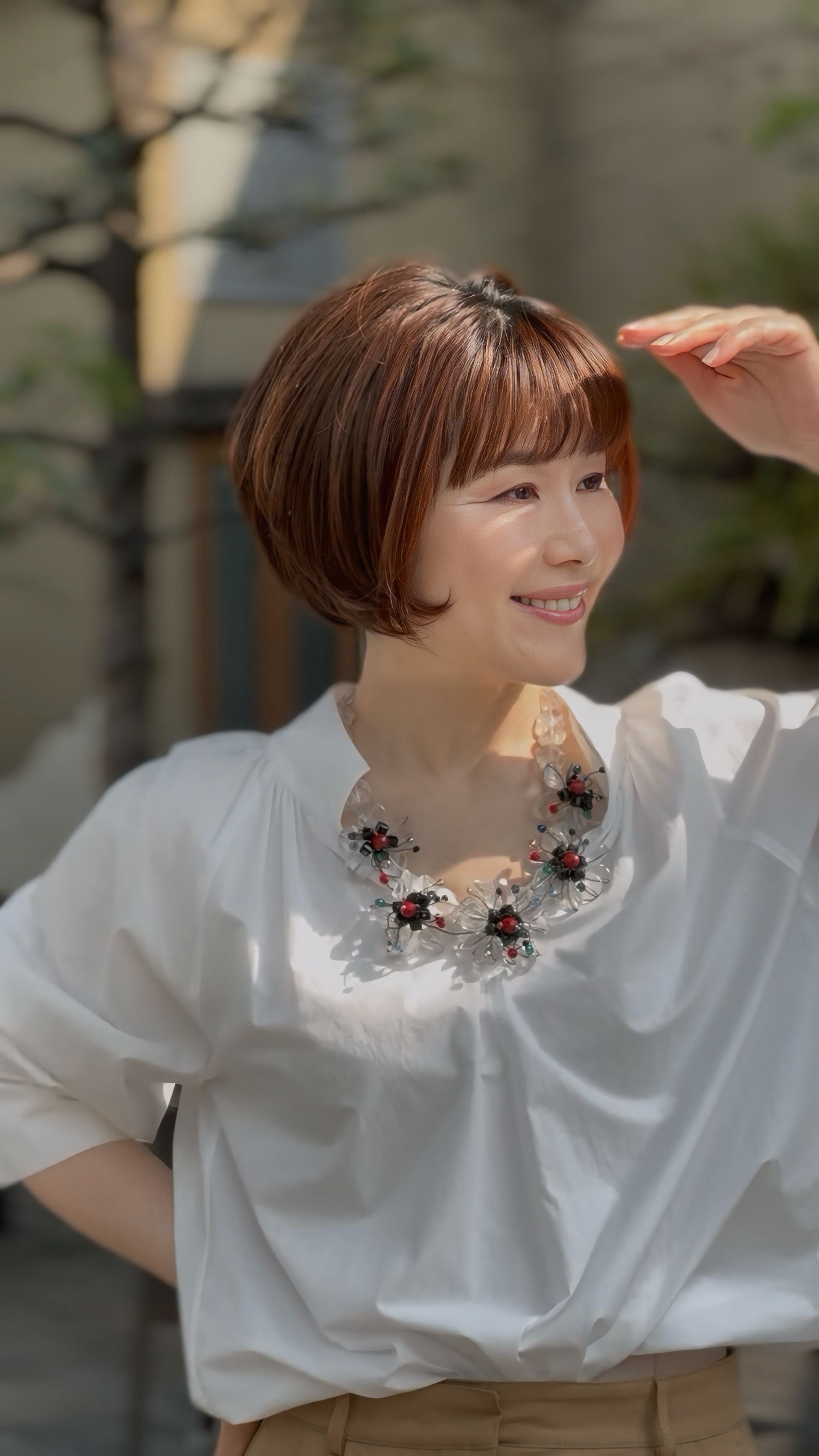 透明感と彩りが重なり合い、装いに遊び心と華やかさを添えてくれるネックレスです。