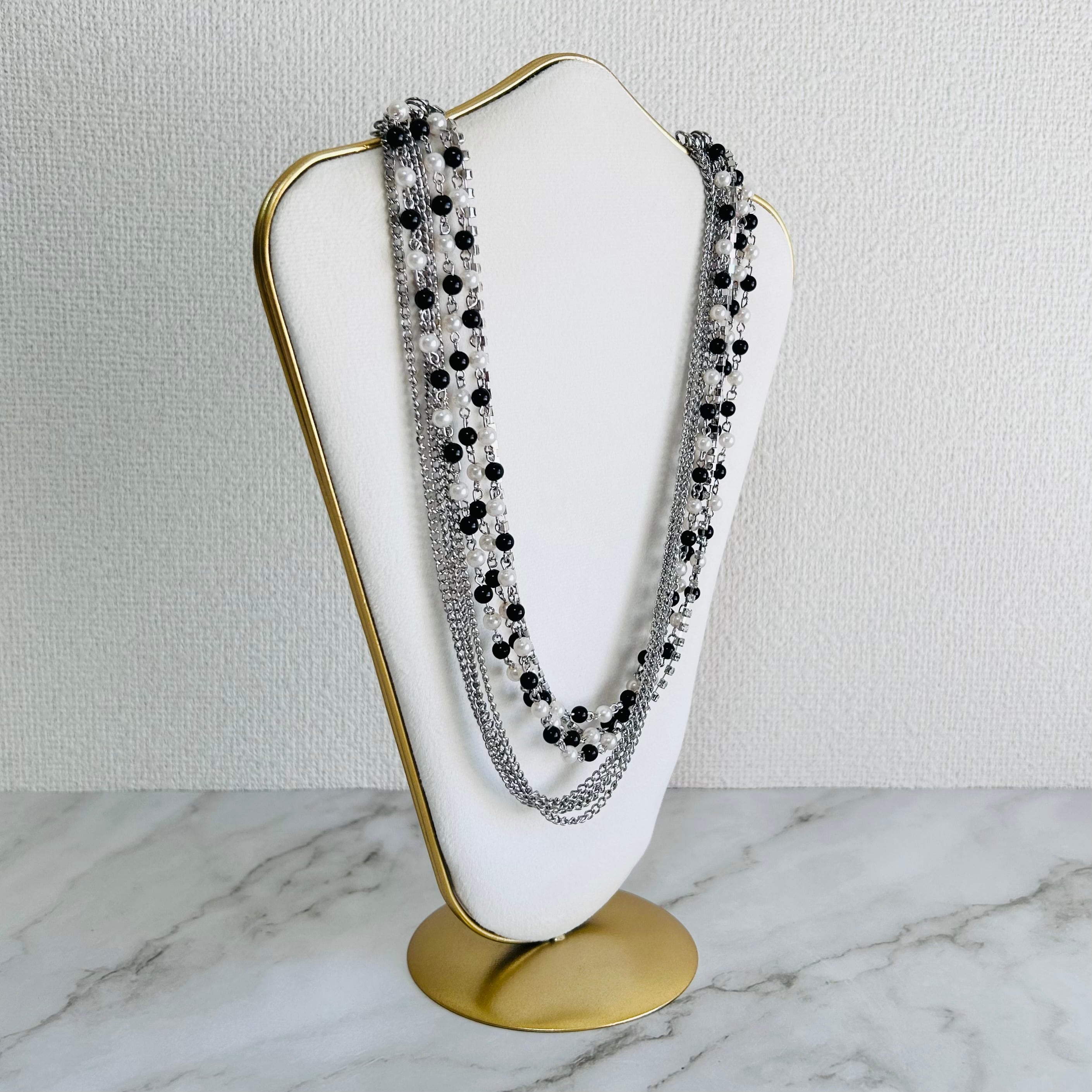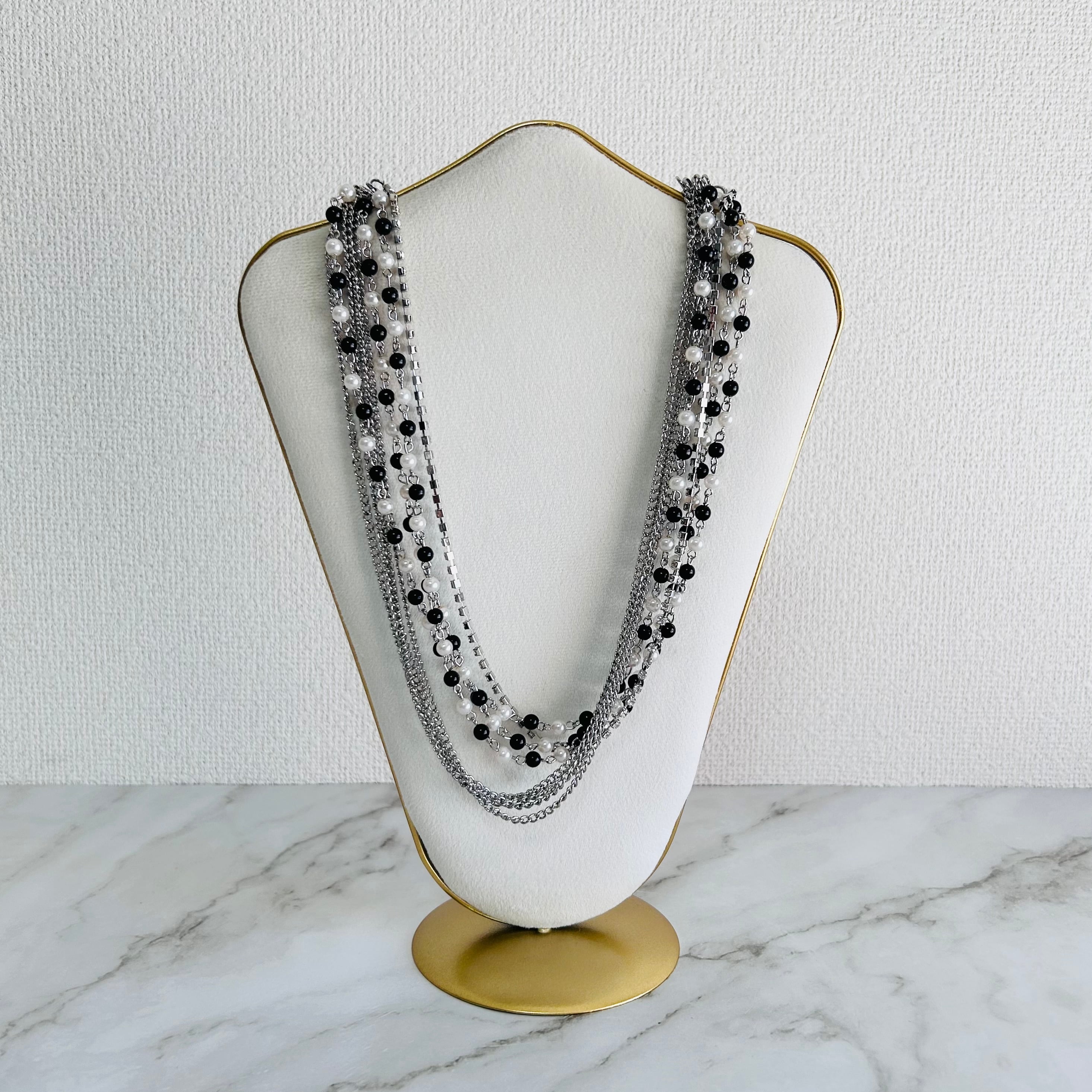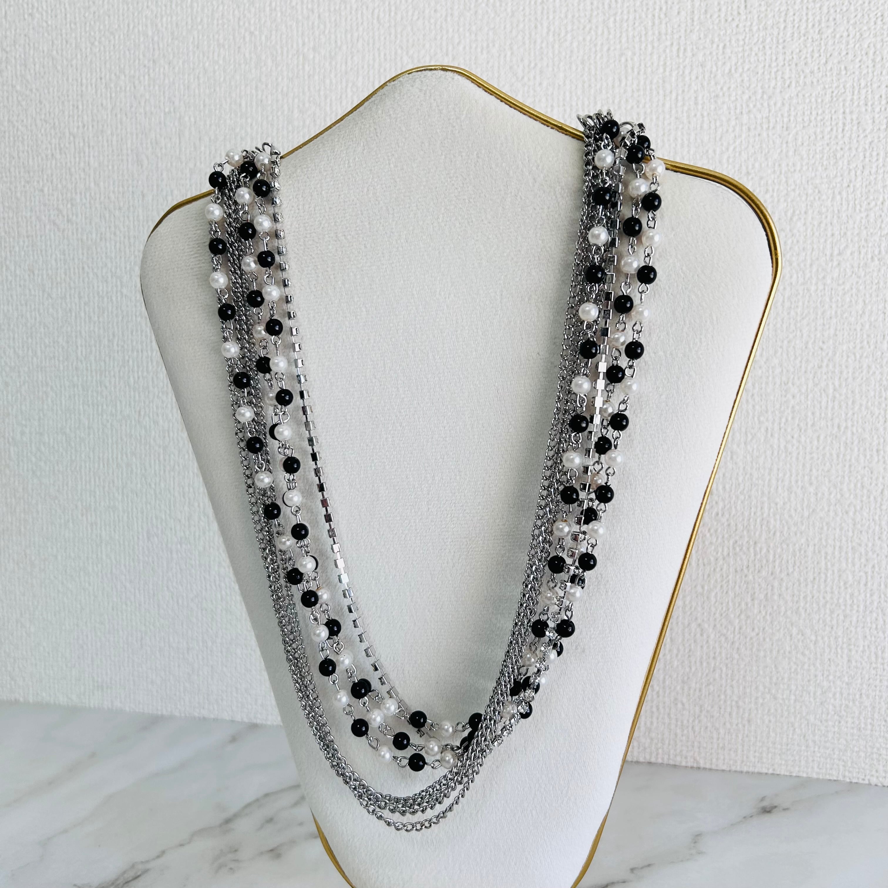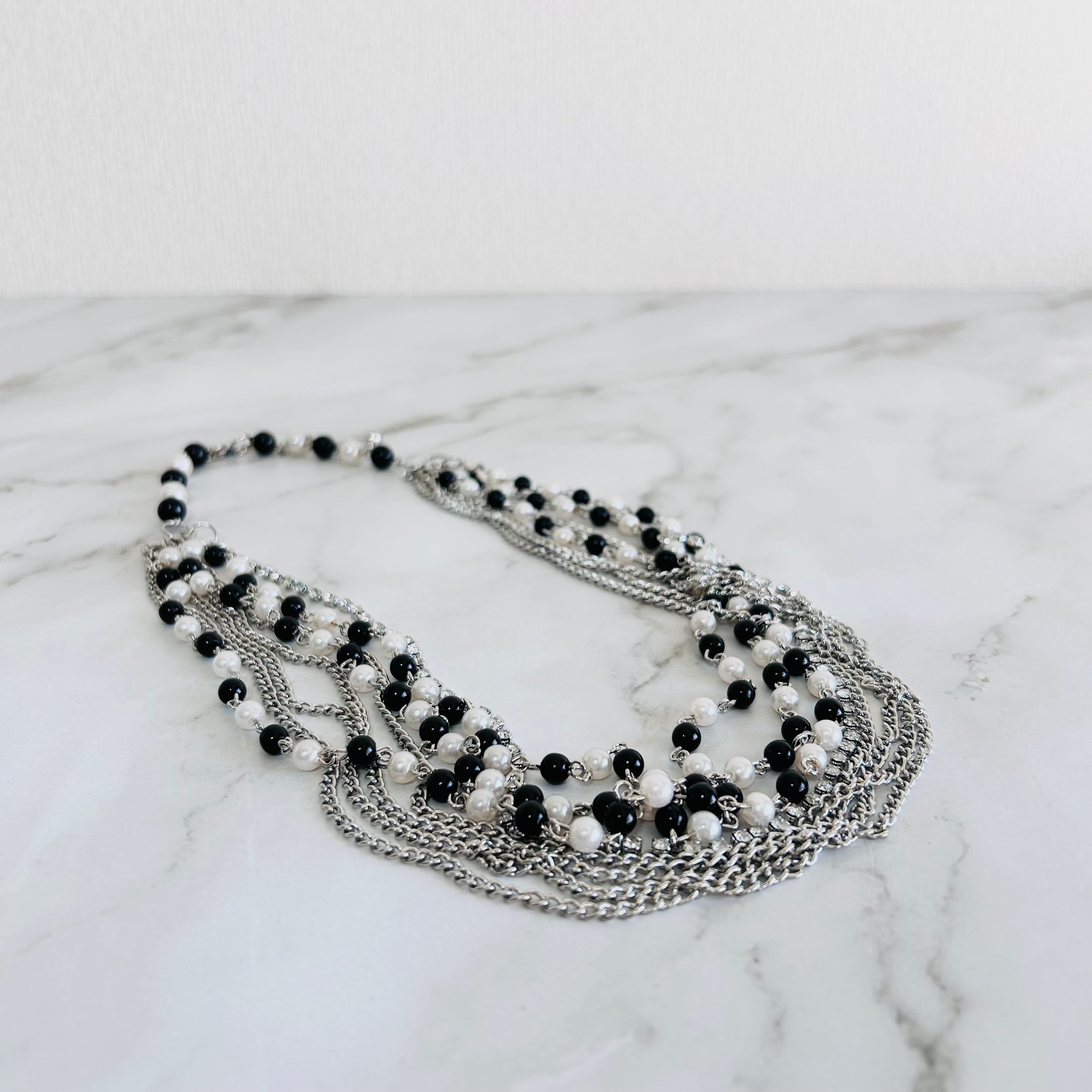 ブラックとホワイトのビーズに、シルバーチェーンを幾重にも重ねた、動きと存在感が際立つロングネックレス。