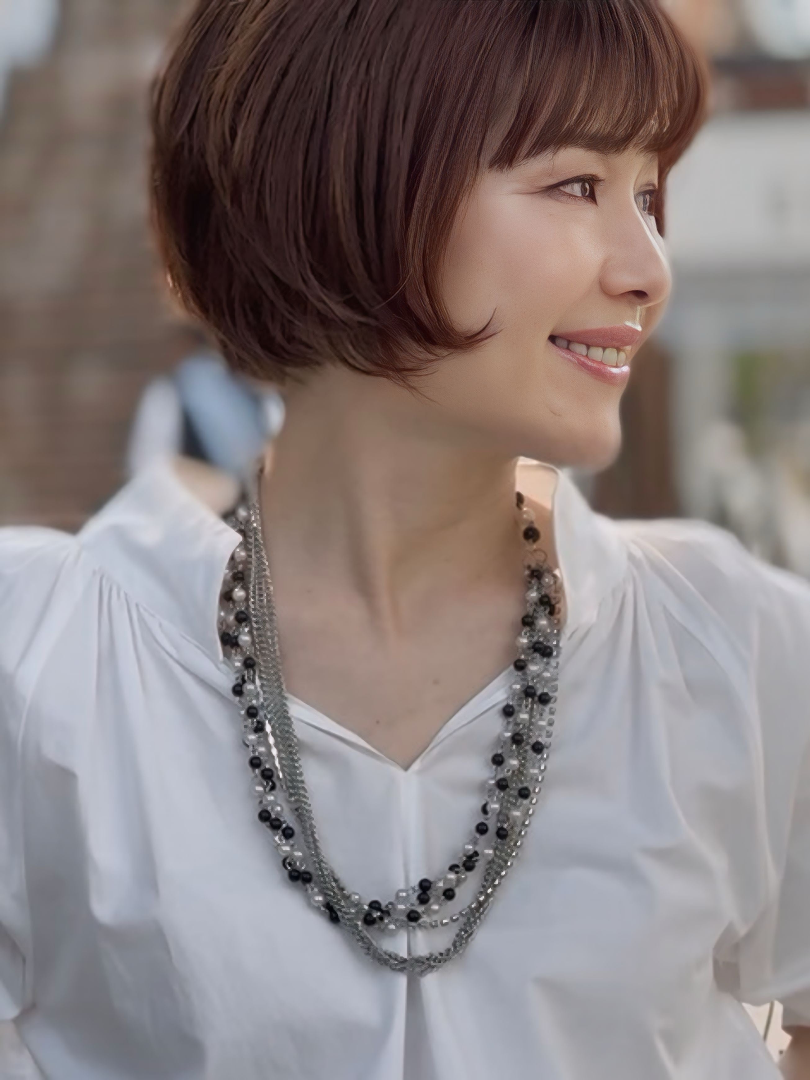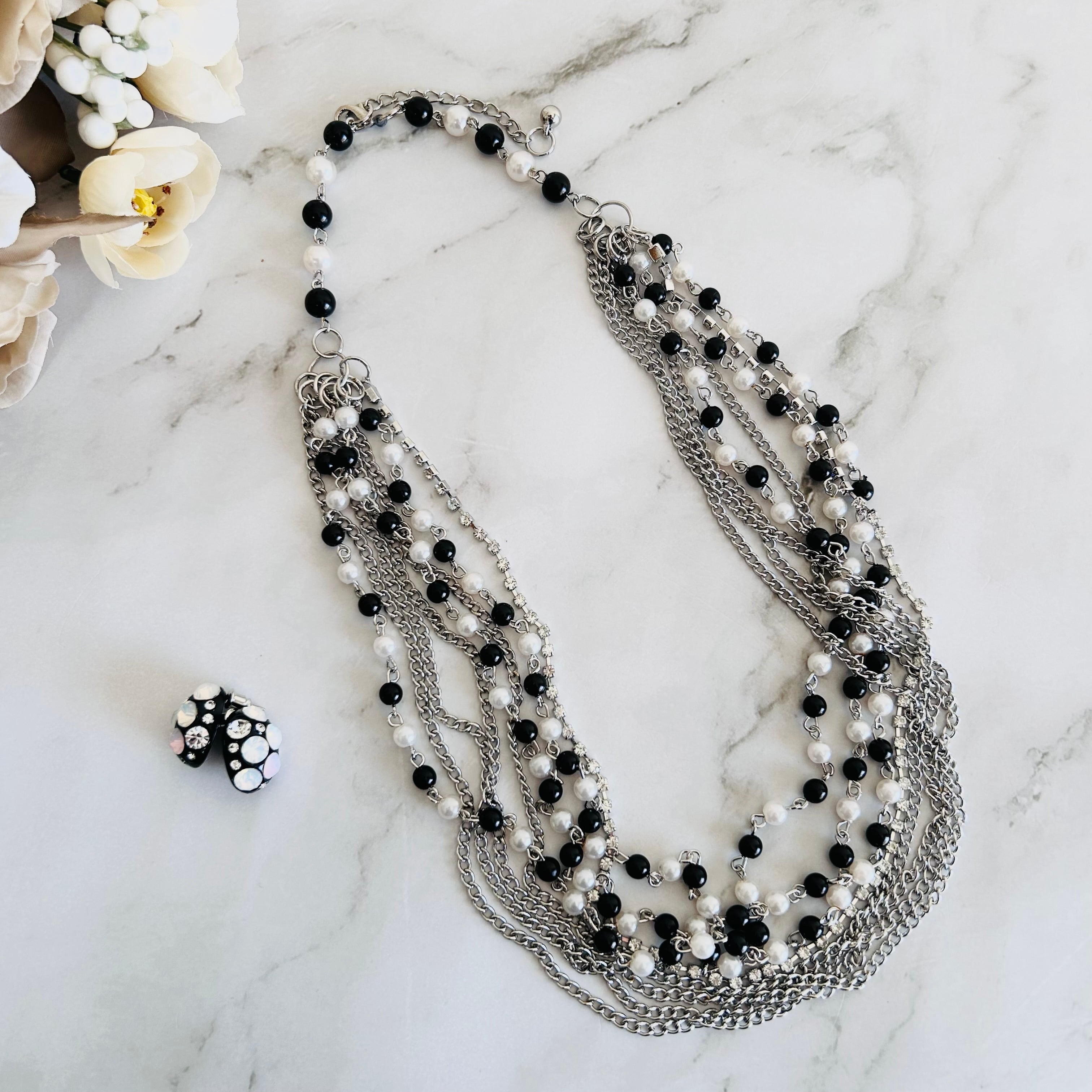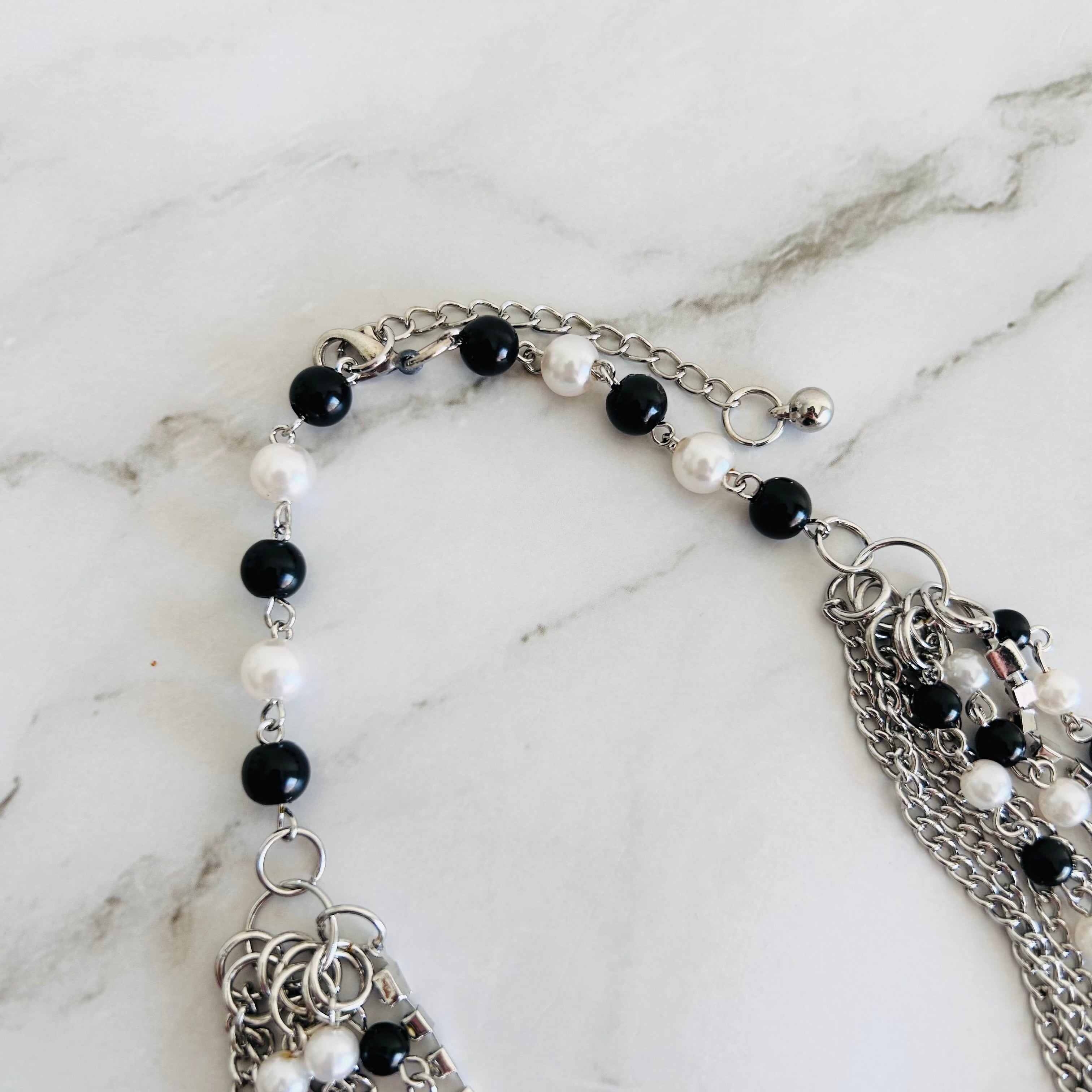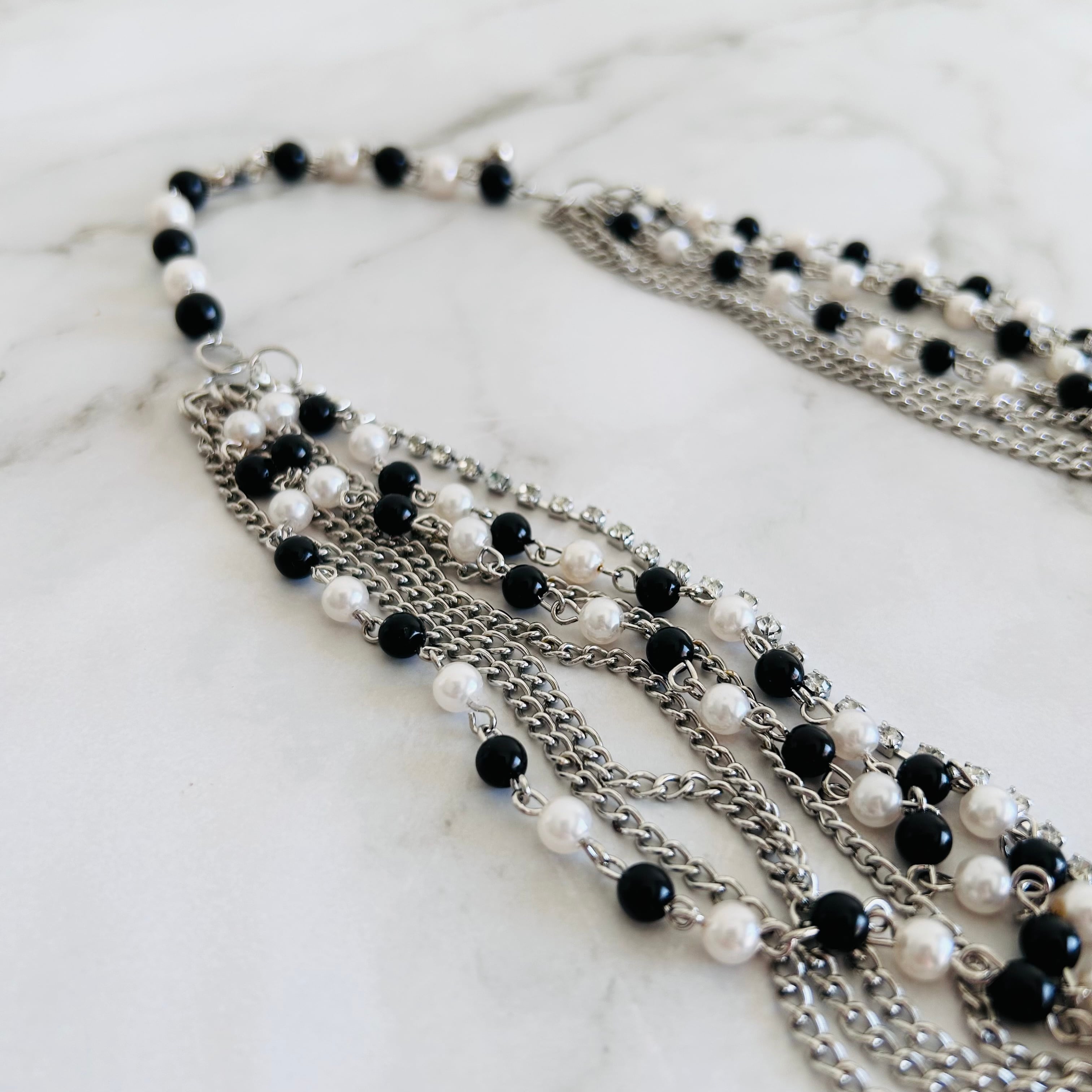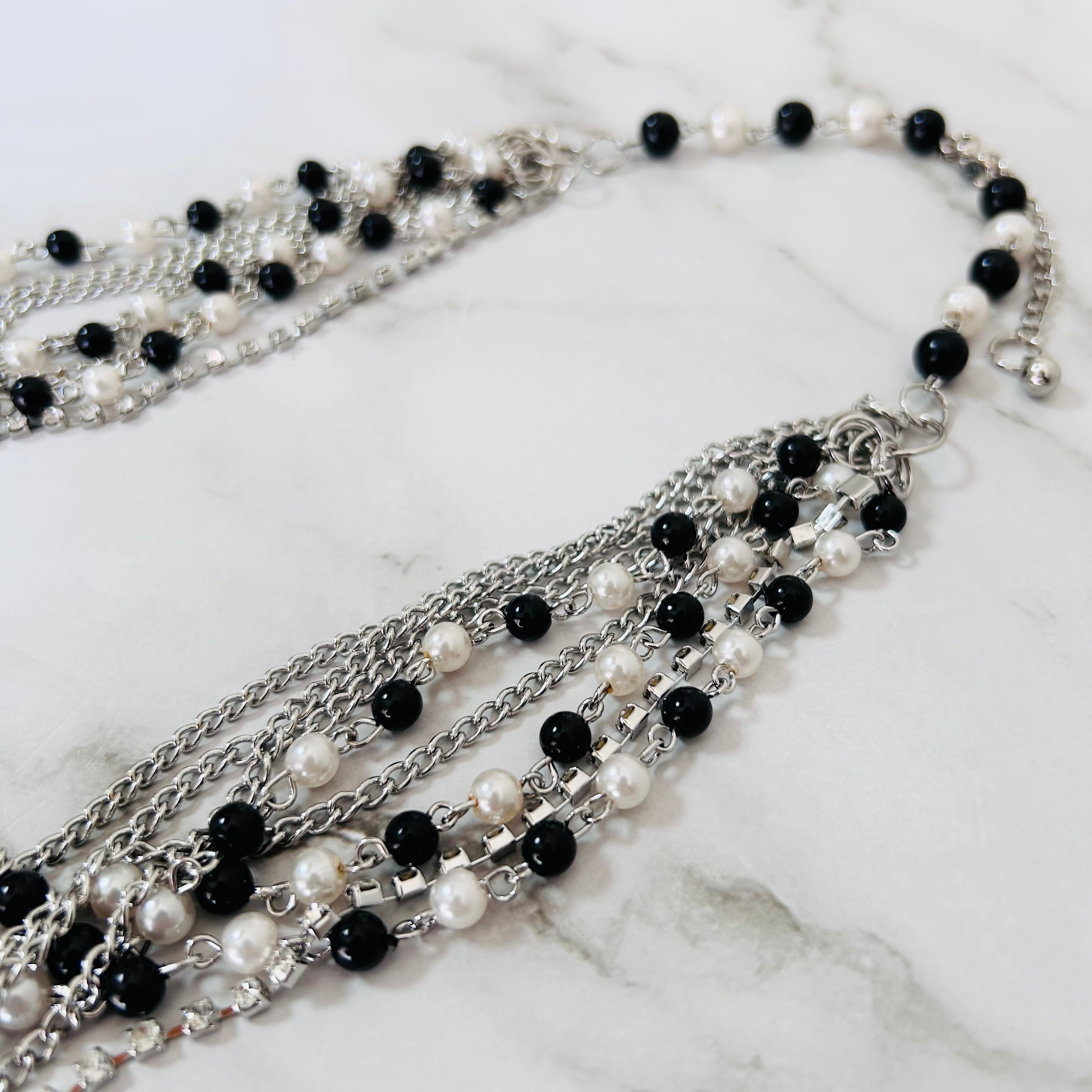 ブラックとホワイトのビーズに、シルバーチェーンを幾重にも重ねた、動きと存在感が際立つロングネックレス。