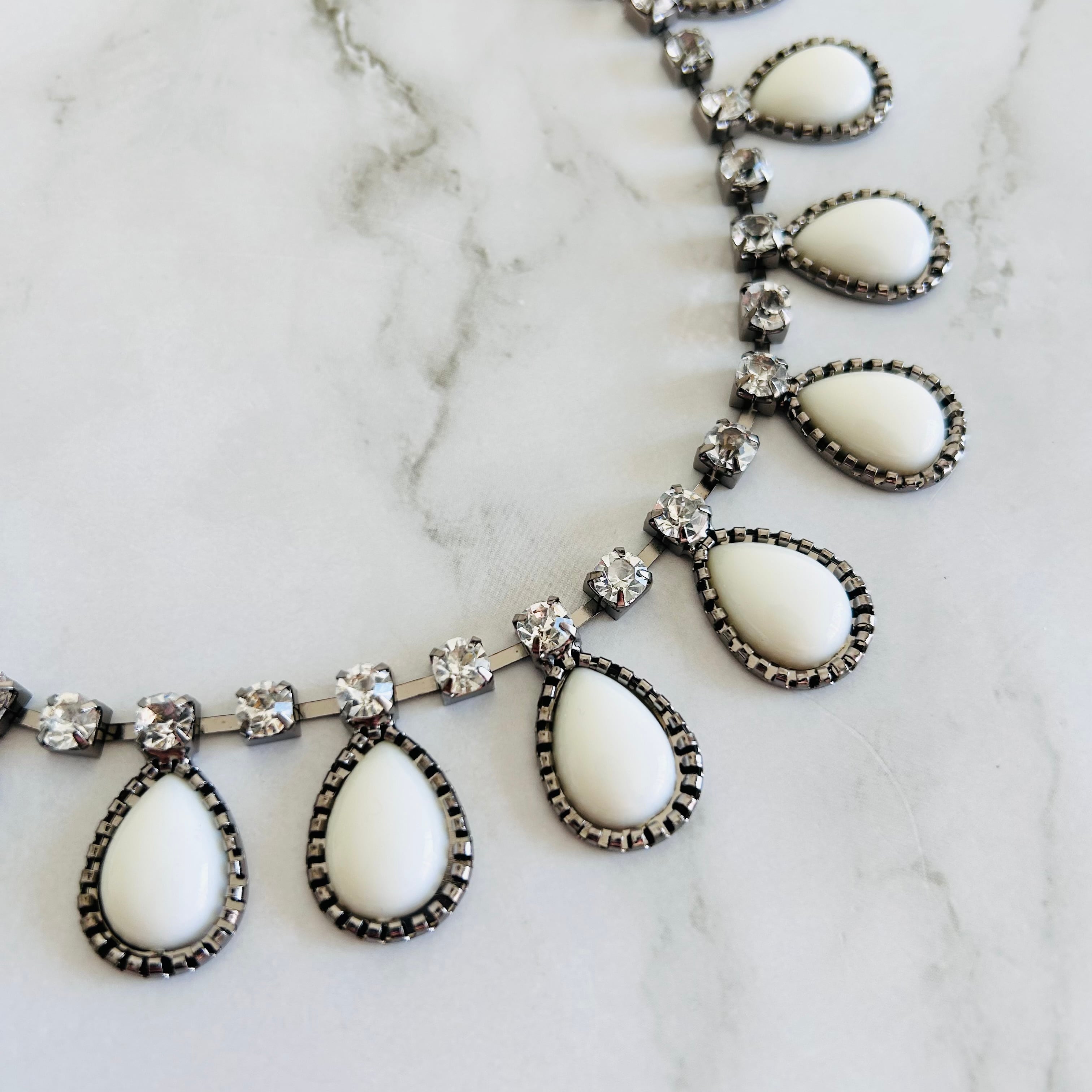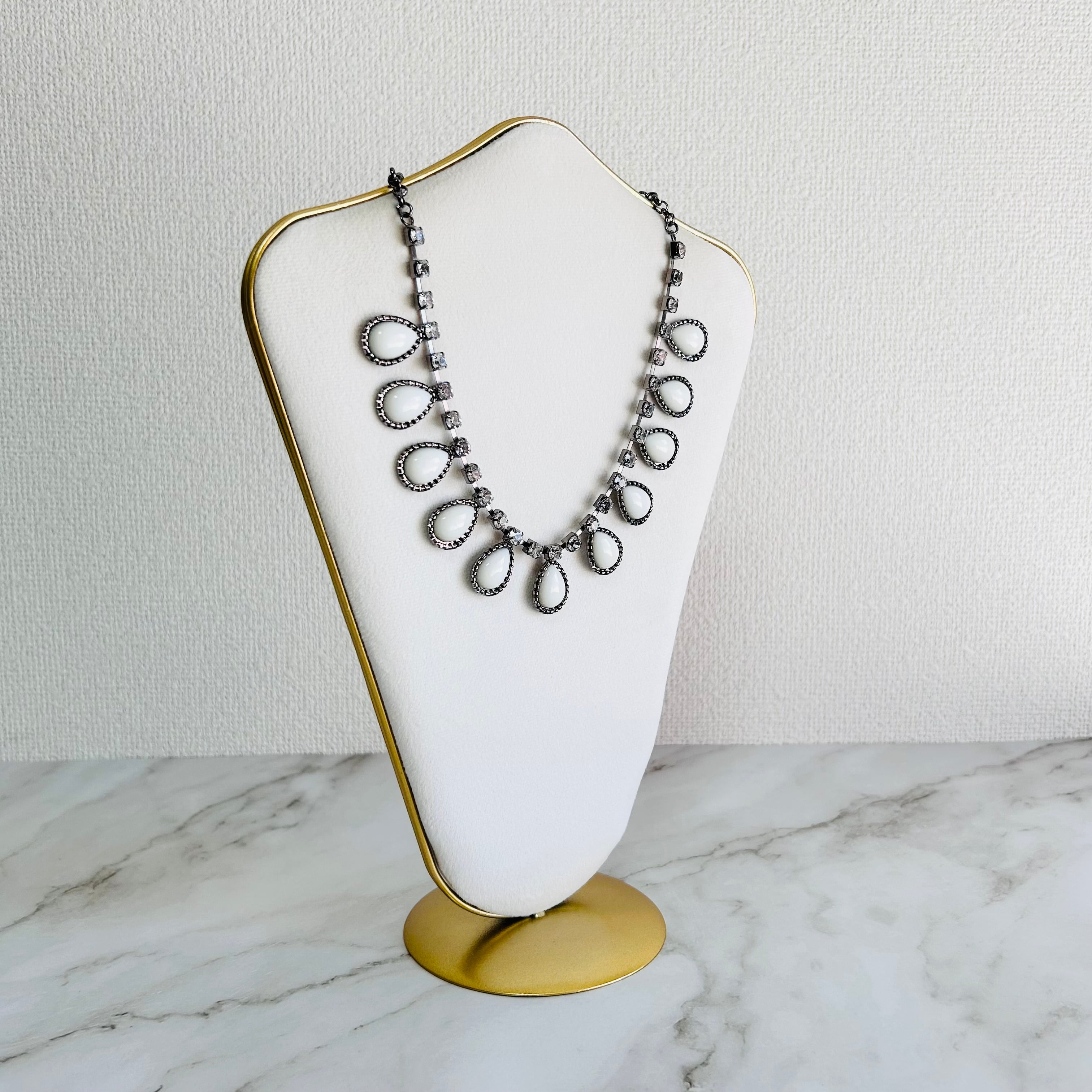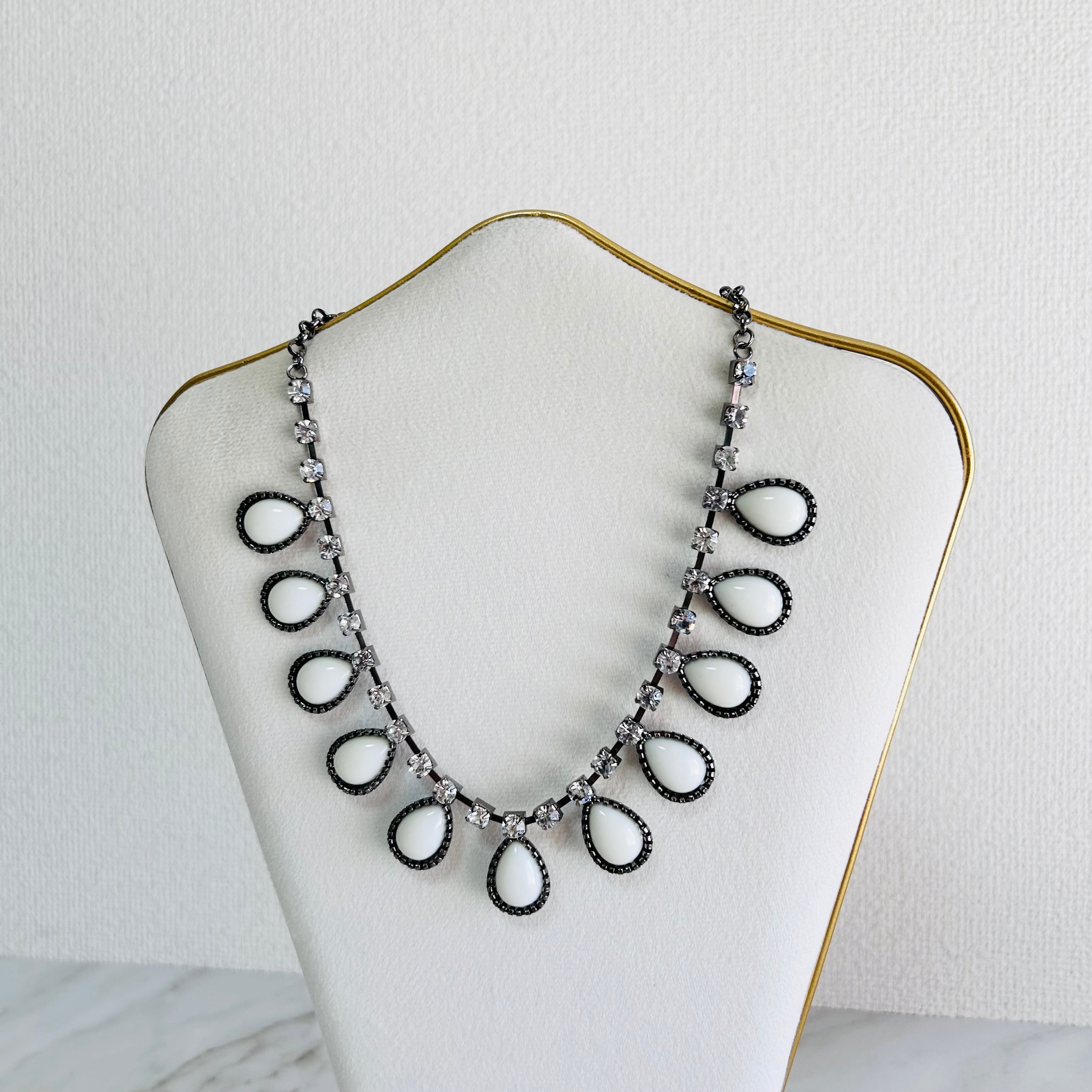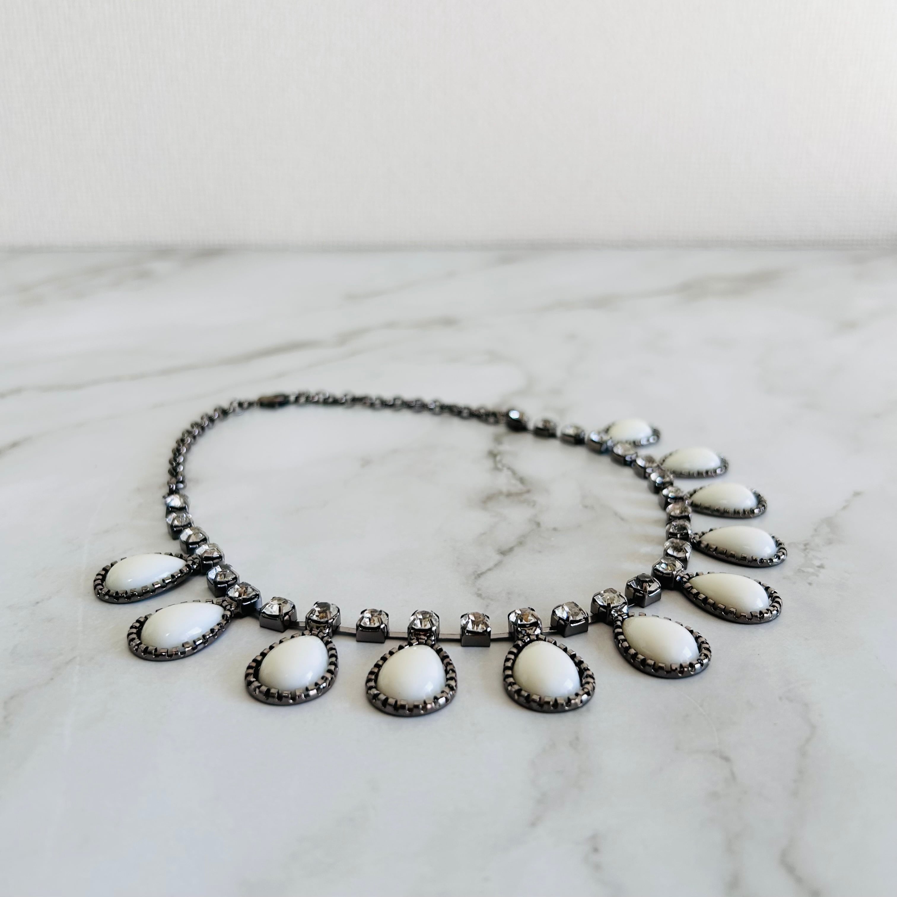 やわらかな乳白色のドロップパーツとクリアな輝きを放つクリスタルを組み合わせたネックレス。