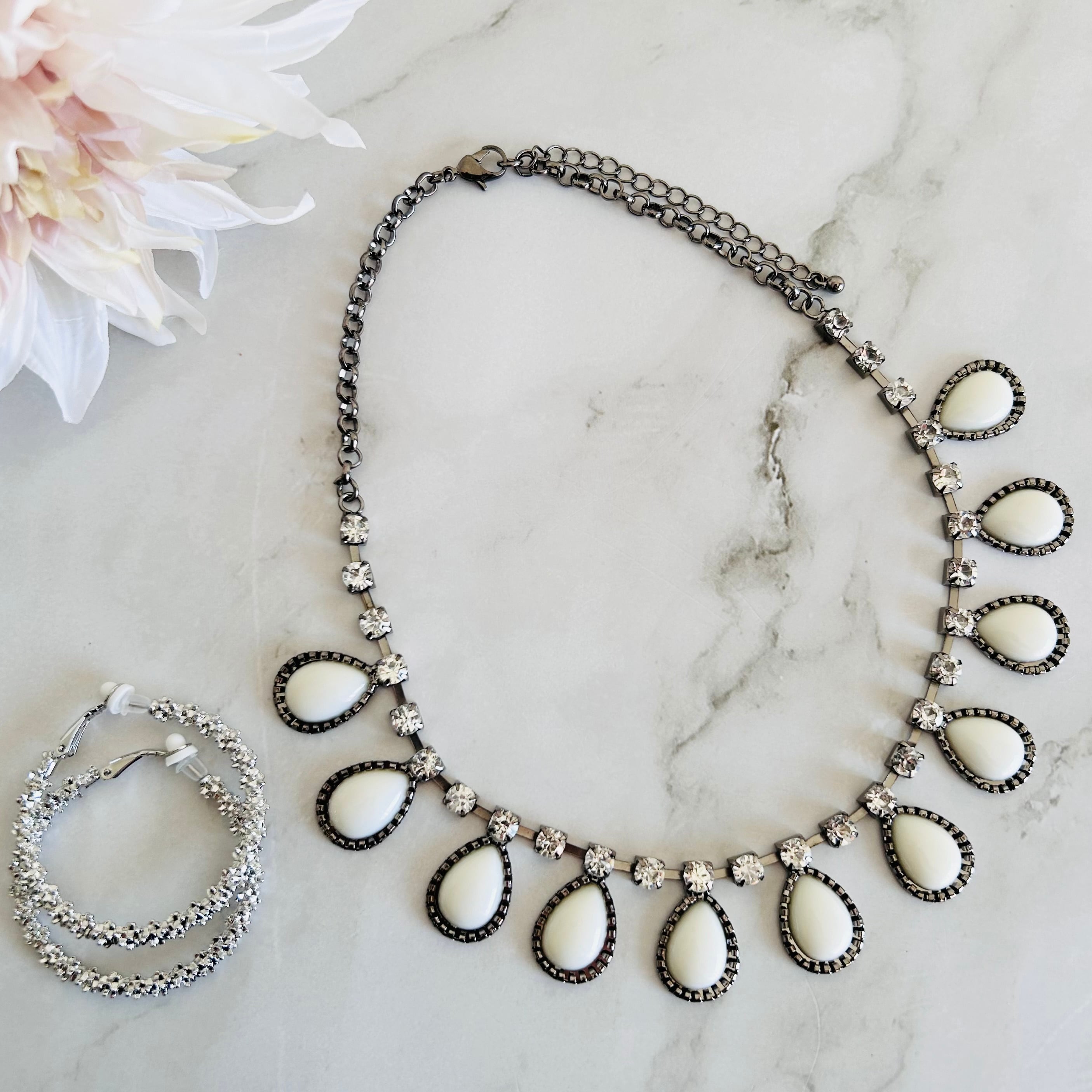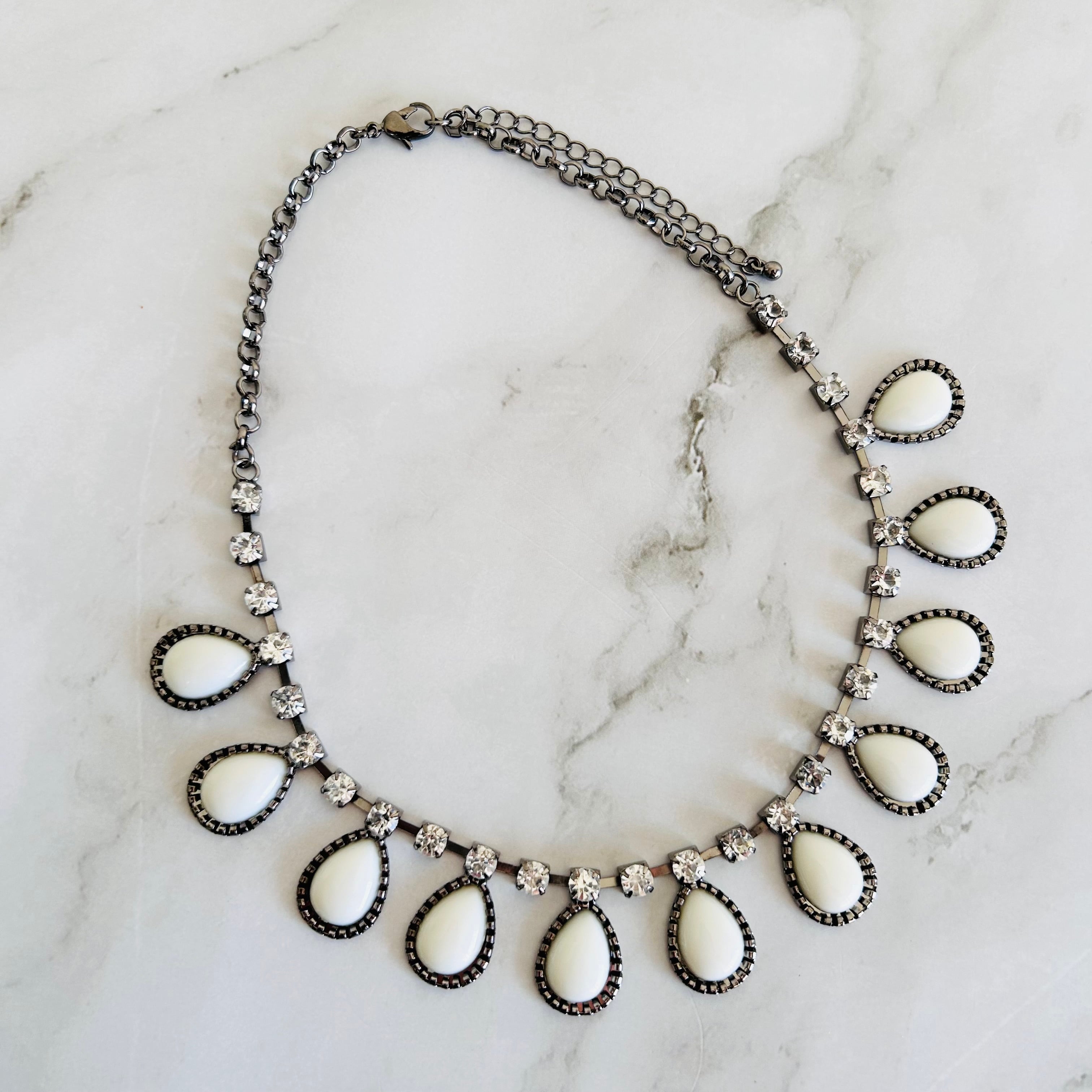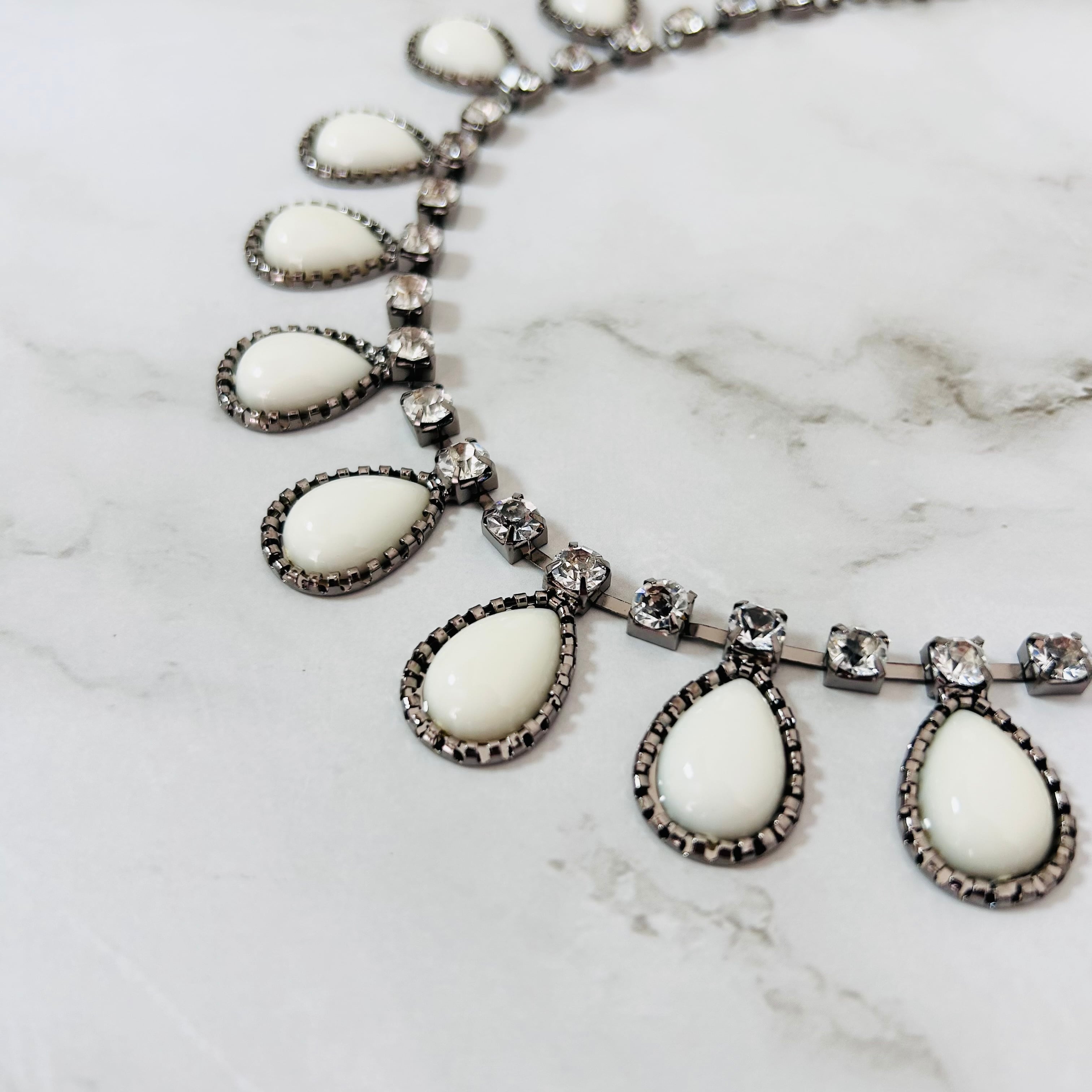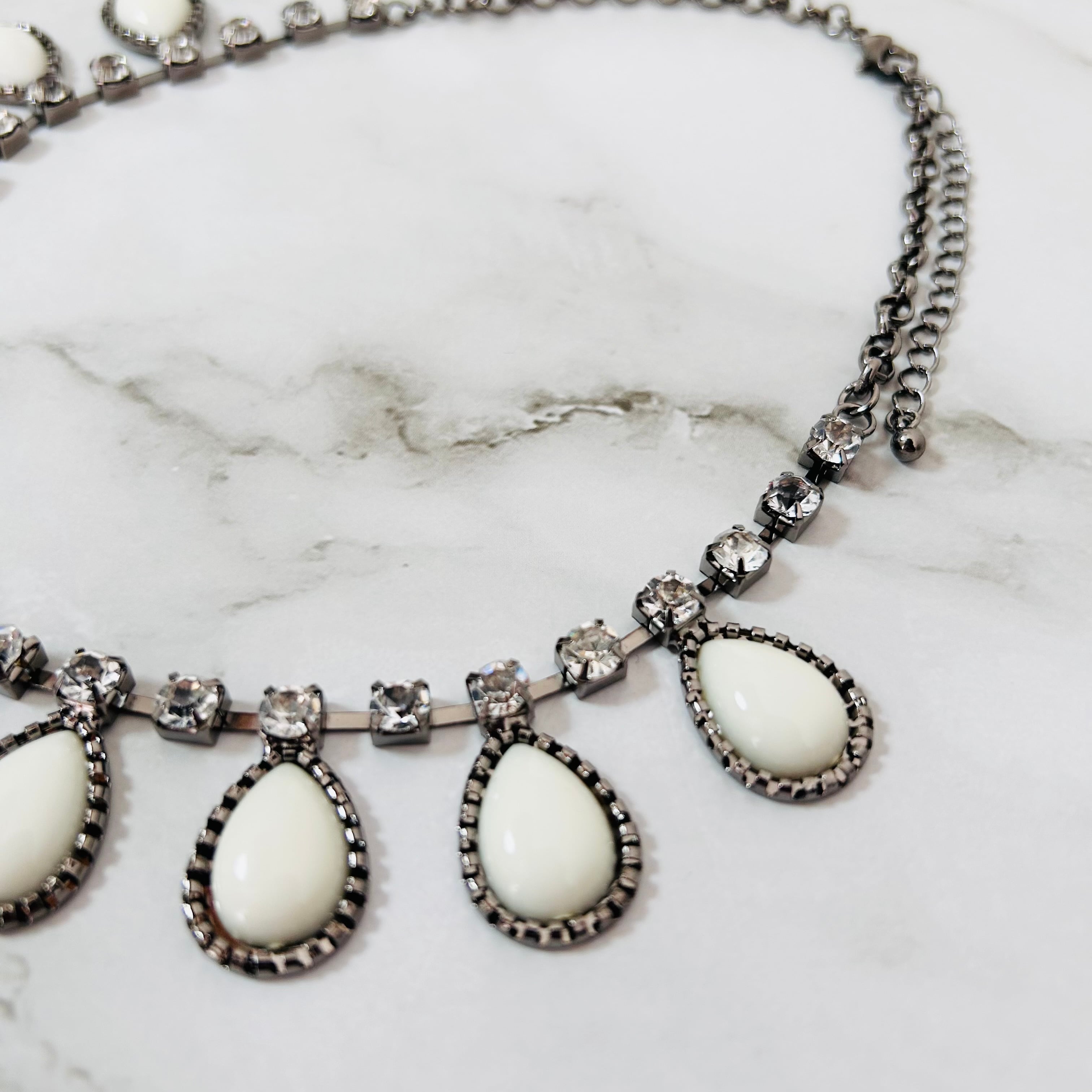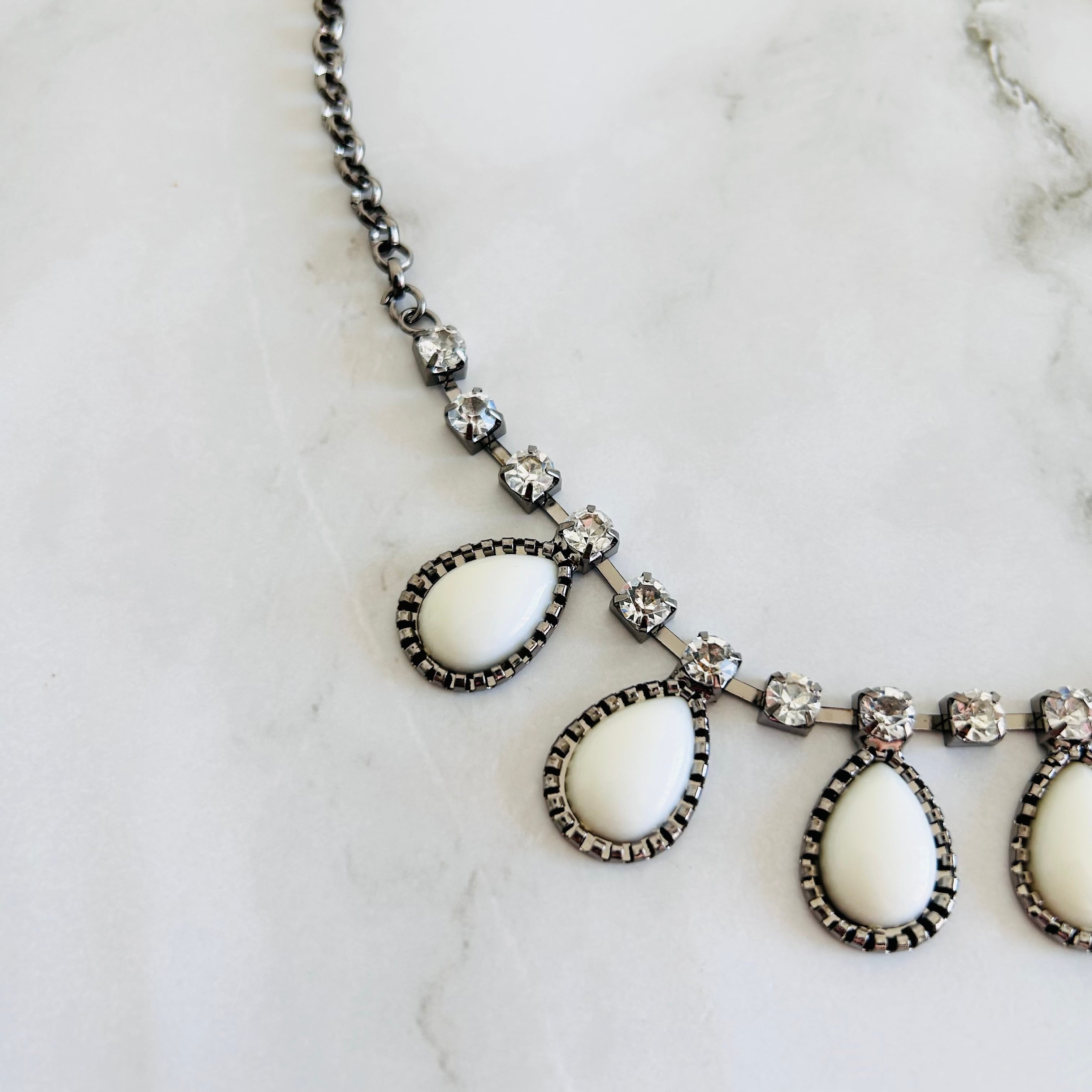 やわらかな乳白色のドロップパーツとクリアな輝きを放つクリスタルを組み合わせたネックレス。