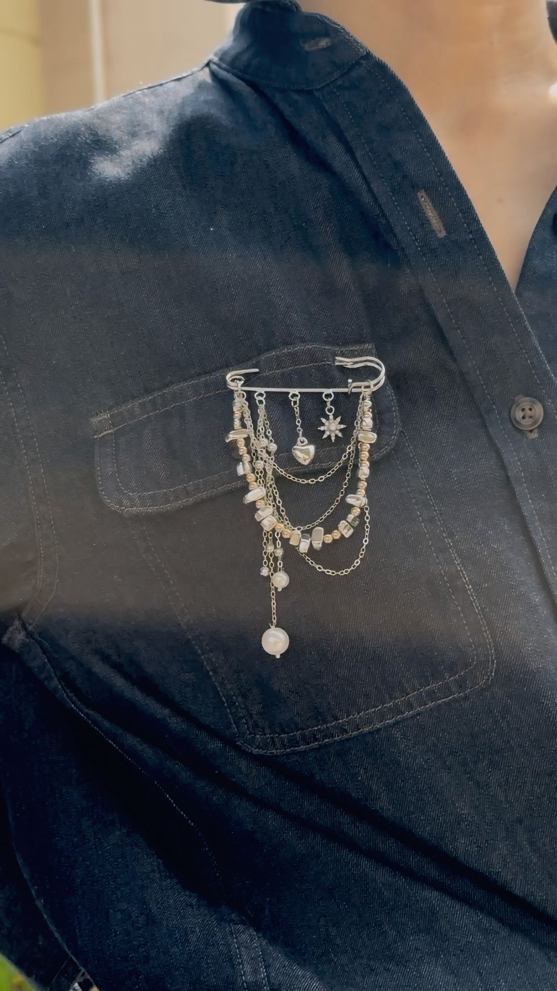 いつもの装いに少しの遊びと華やぎを添えてくれる、存在感あるブローチです。