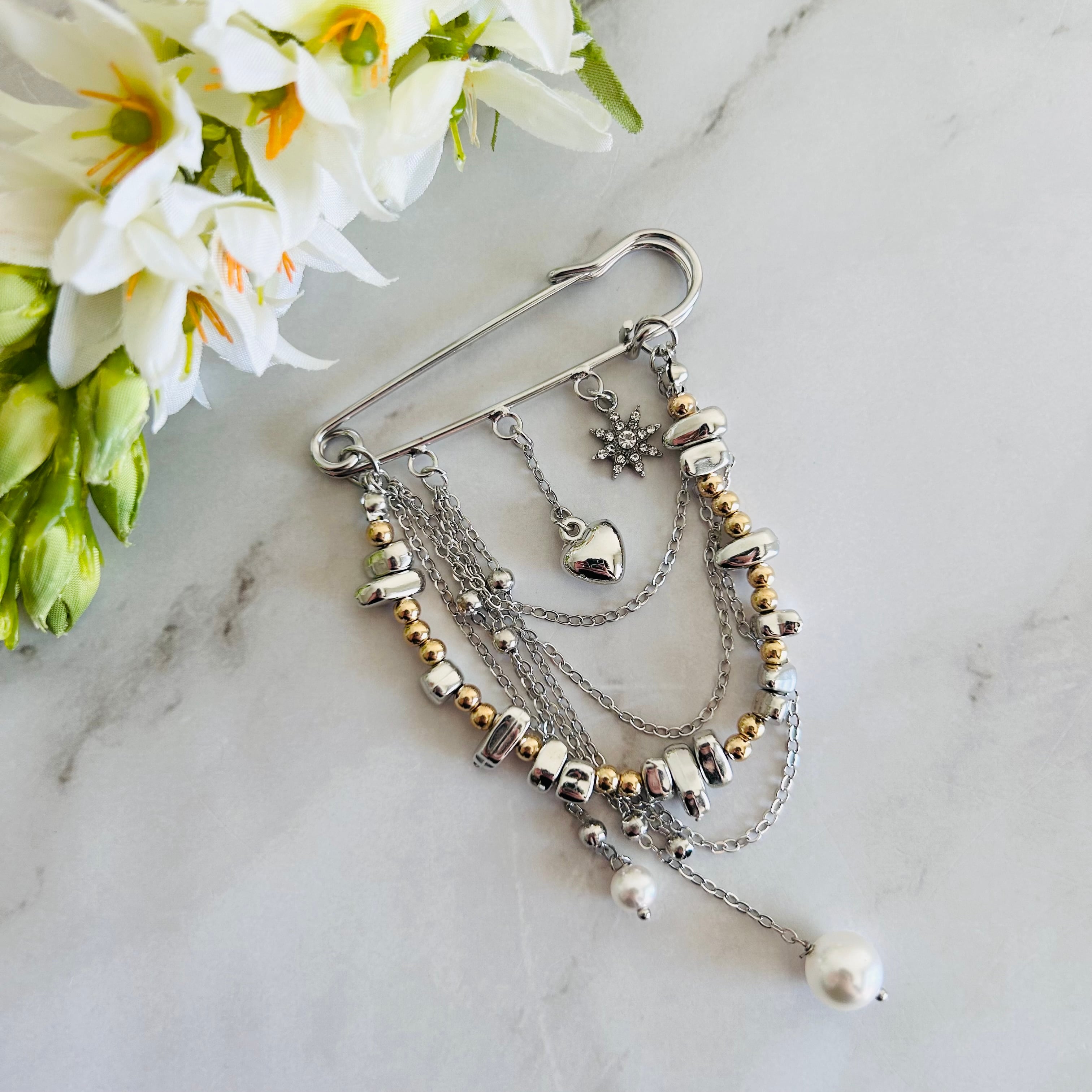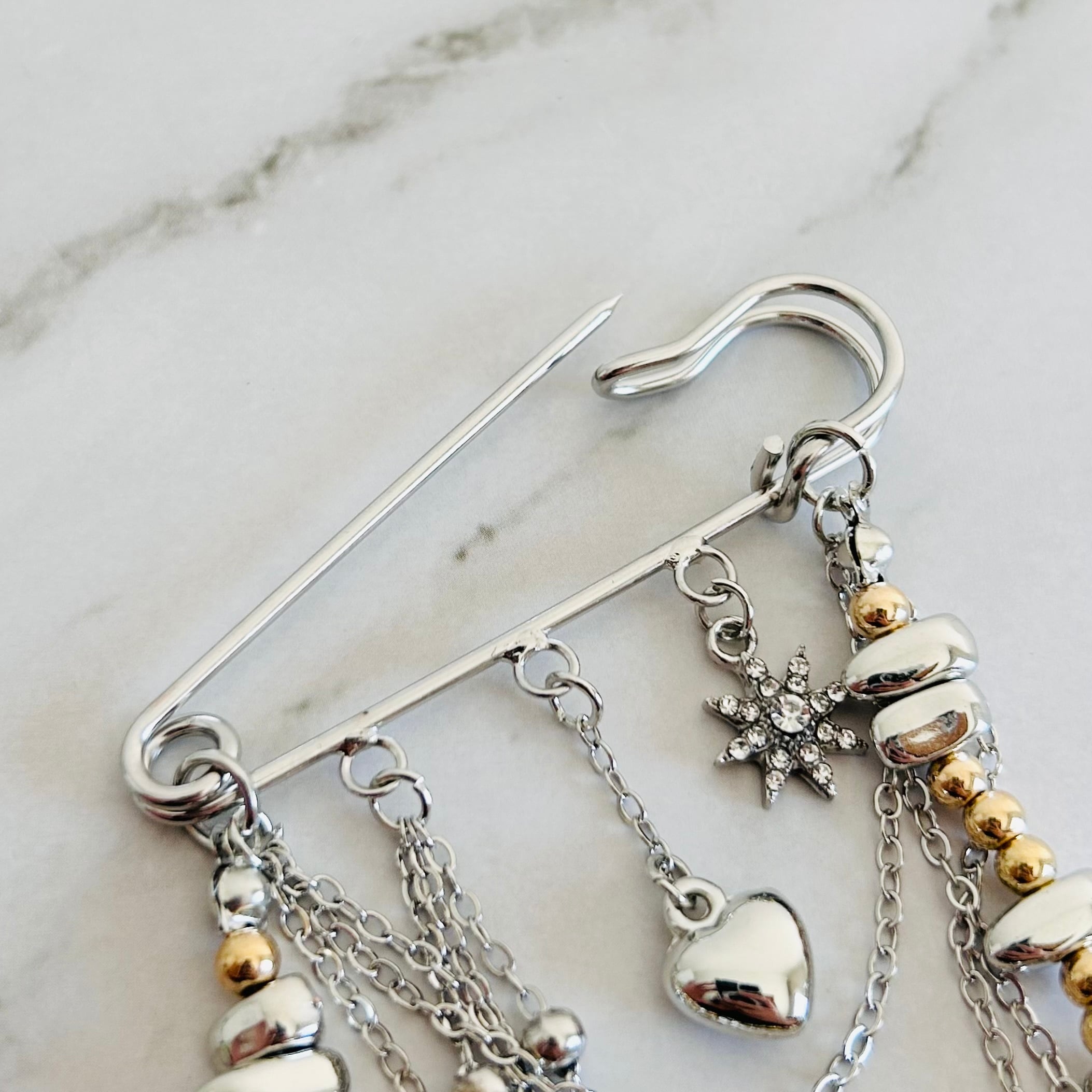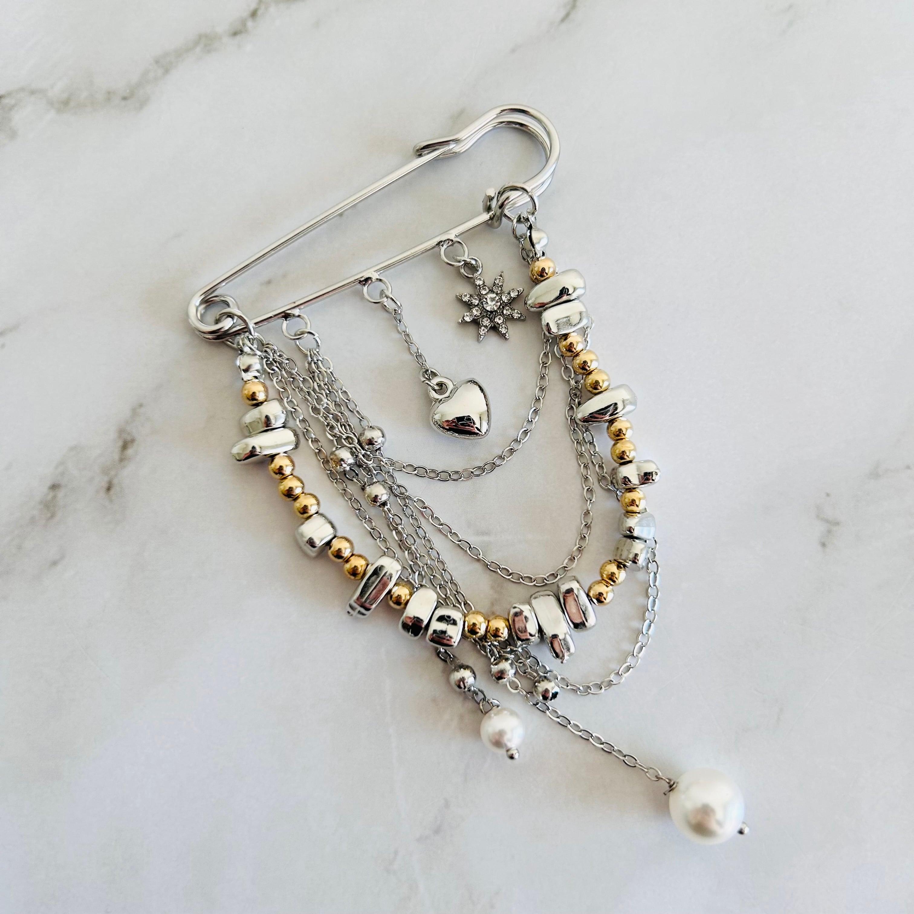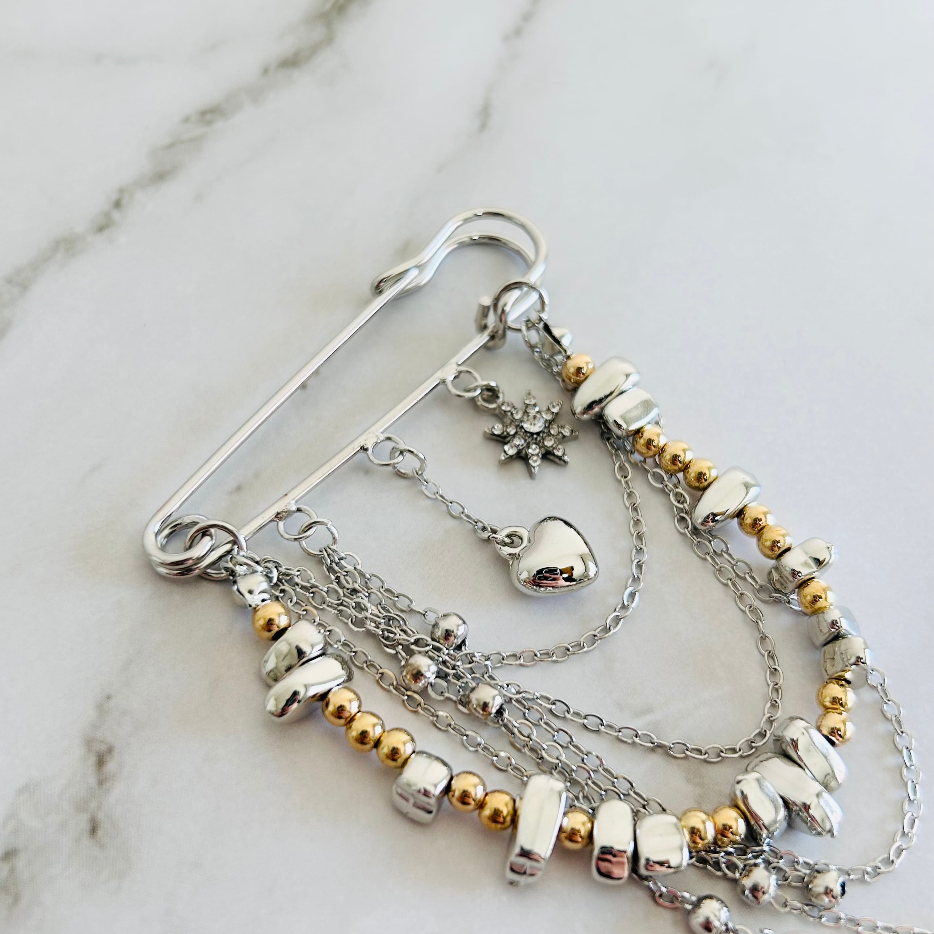 シルバーとゴールドのメタルパーツに、チェーンやチャームを重ねた、