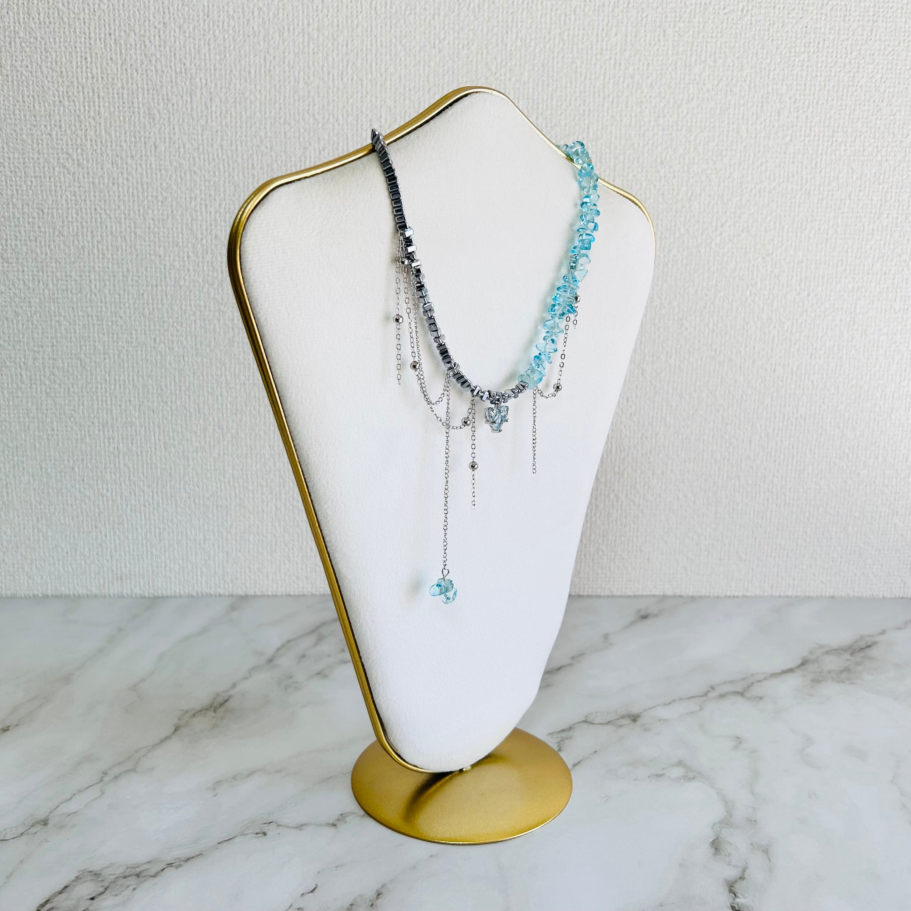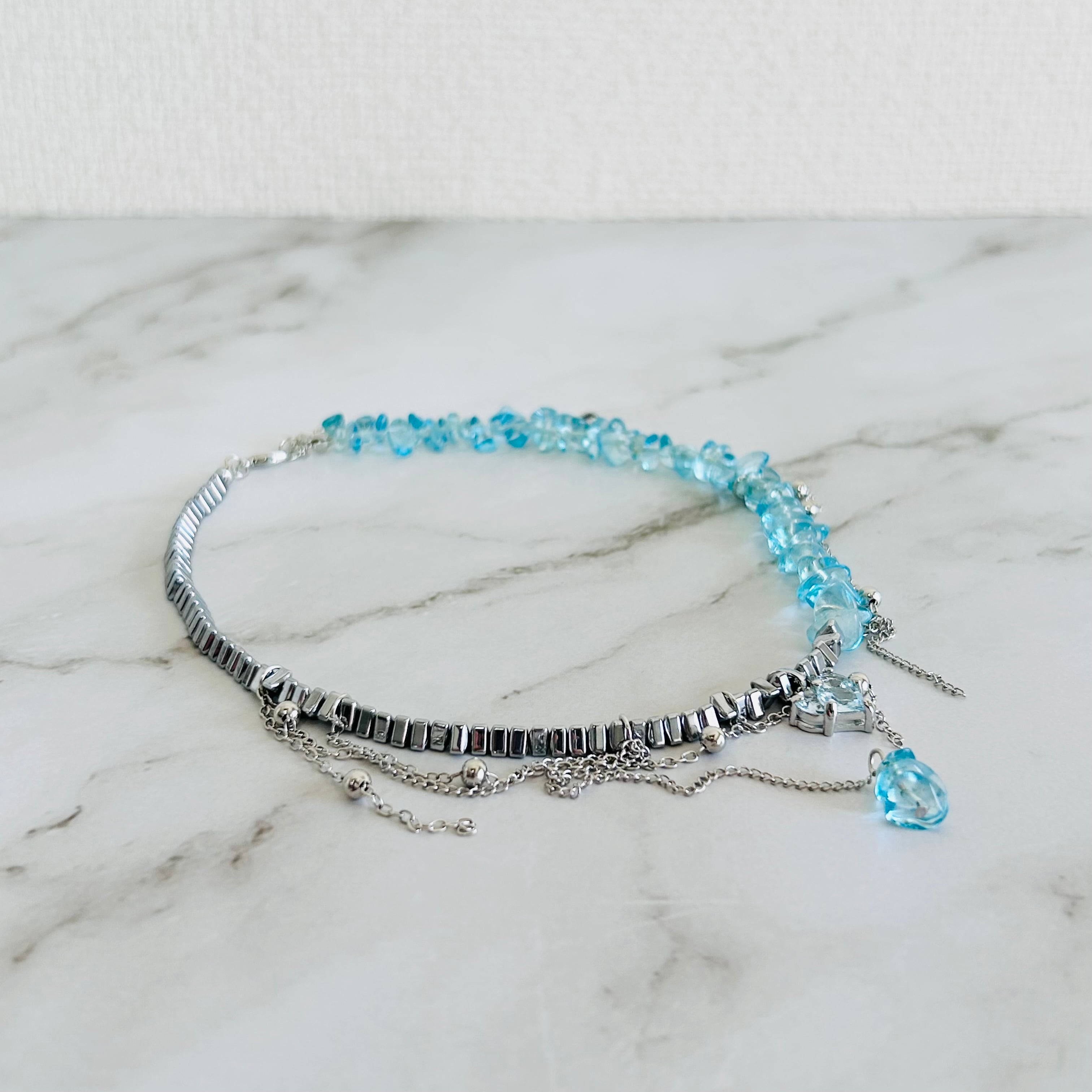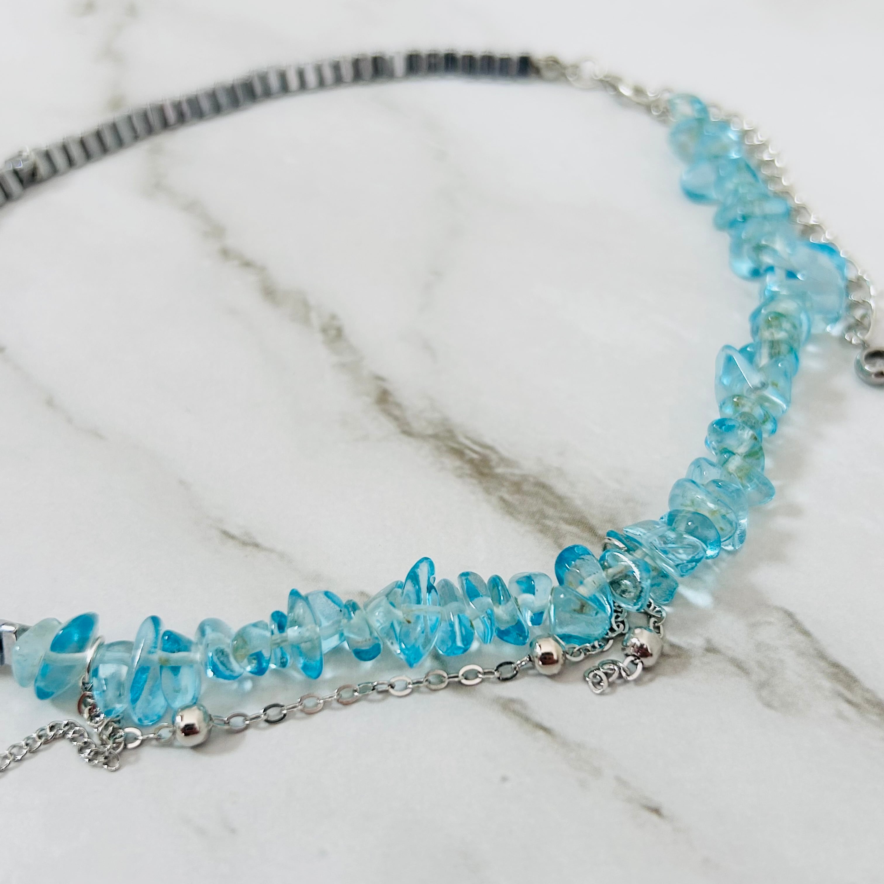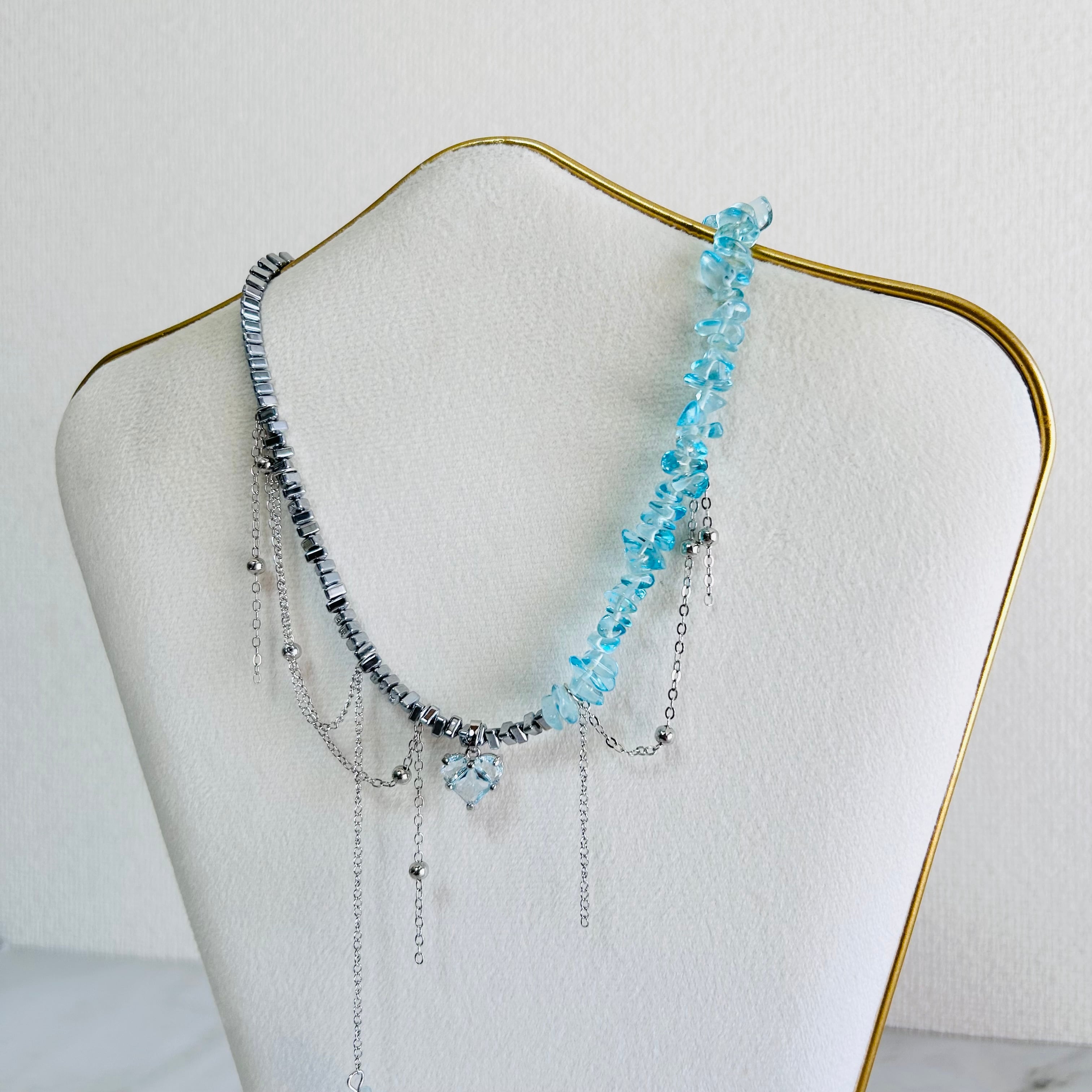 透明感のあるブルーのチップストーンと、シルバーのメタルパーツを組み合わせたデザインネックレス。