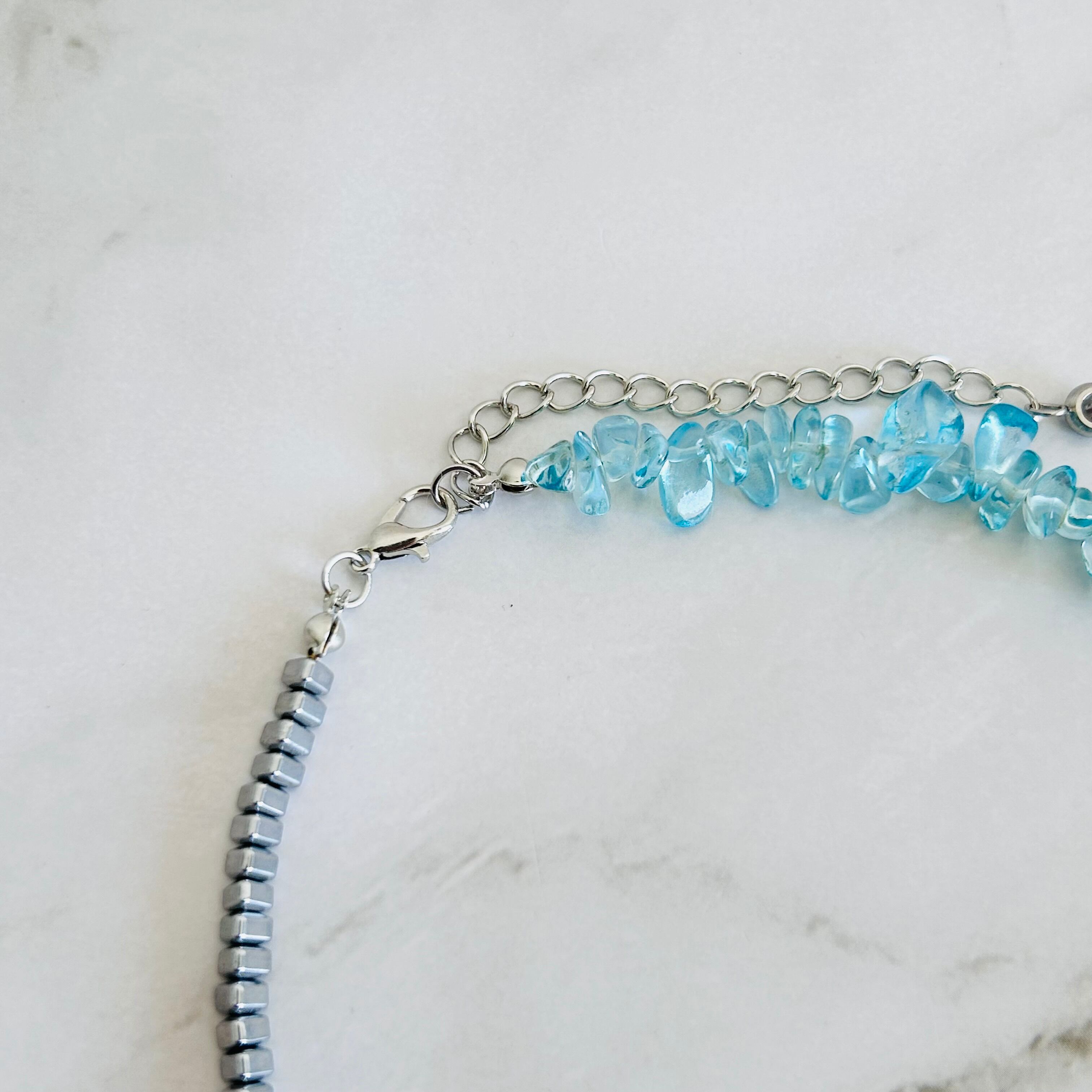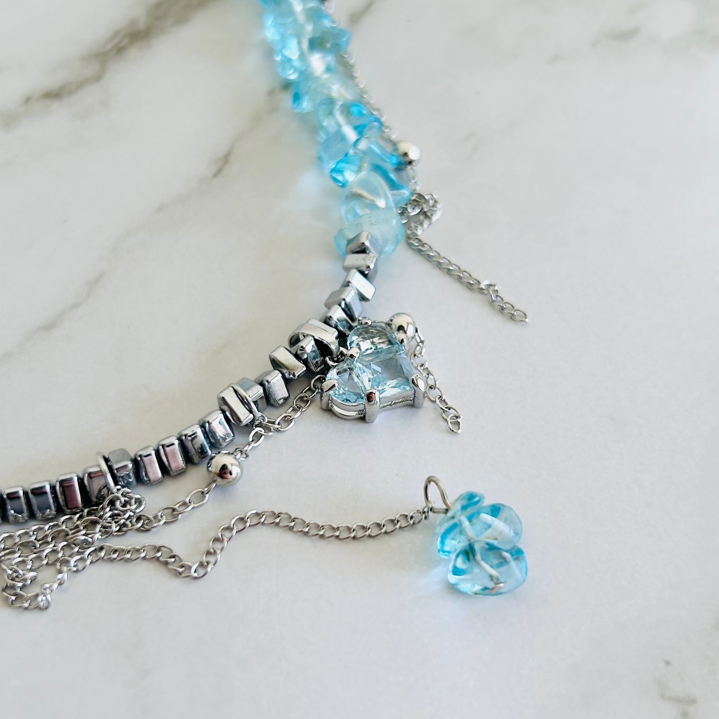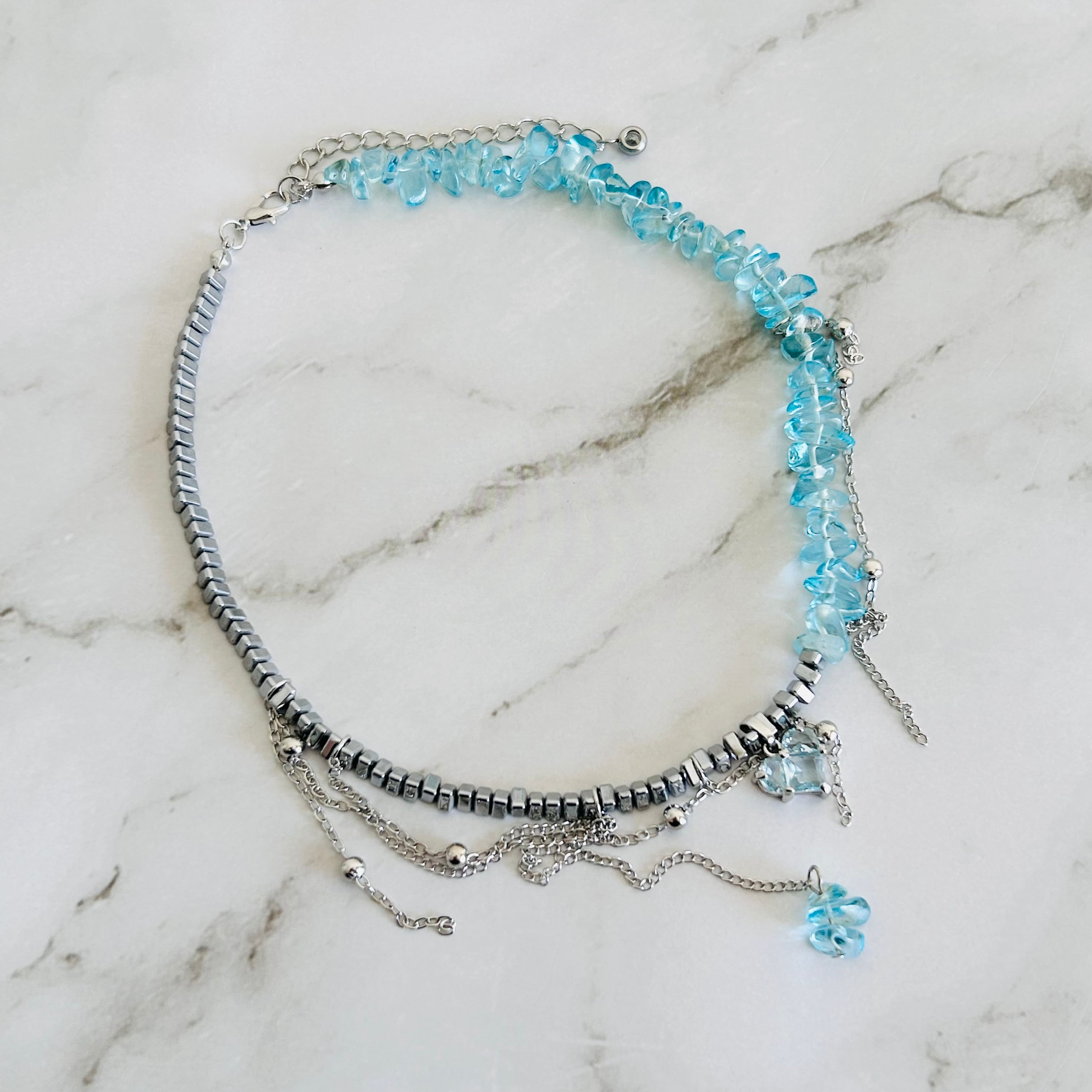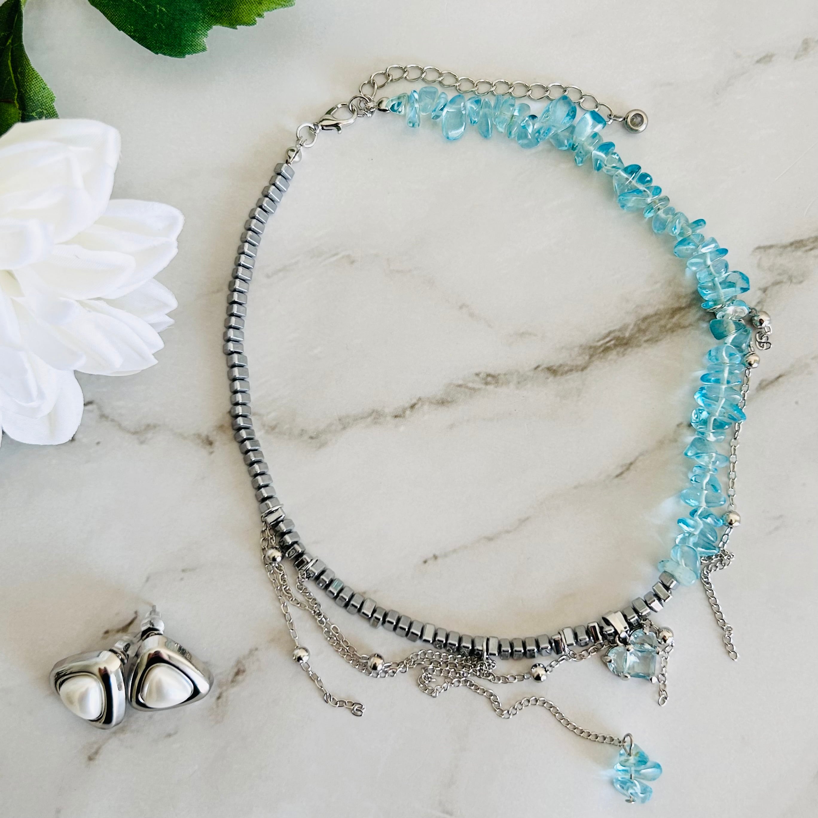 透明感のあるブルーのチップストーンと、シルバーのメタルパーツを組み合わせたデザインネックレス。
