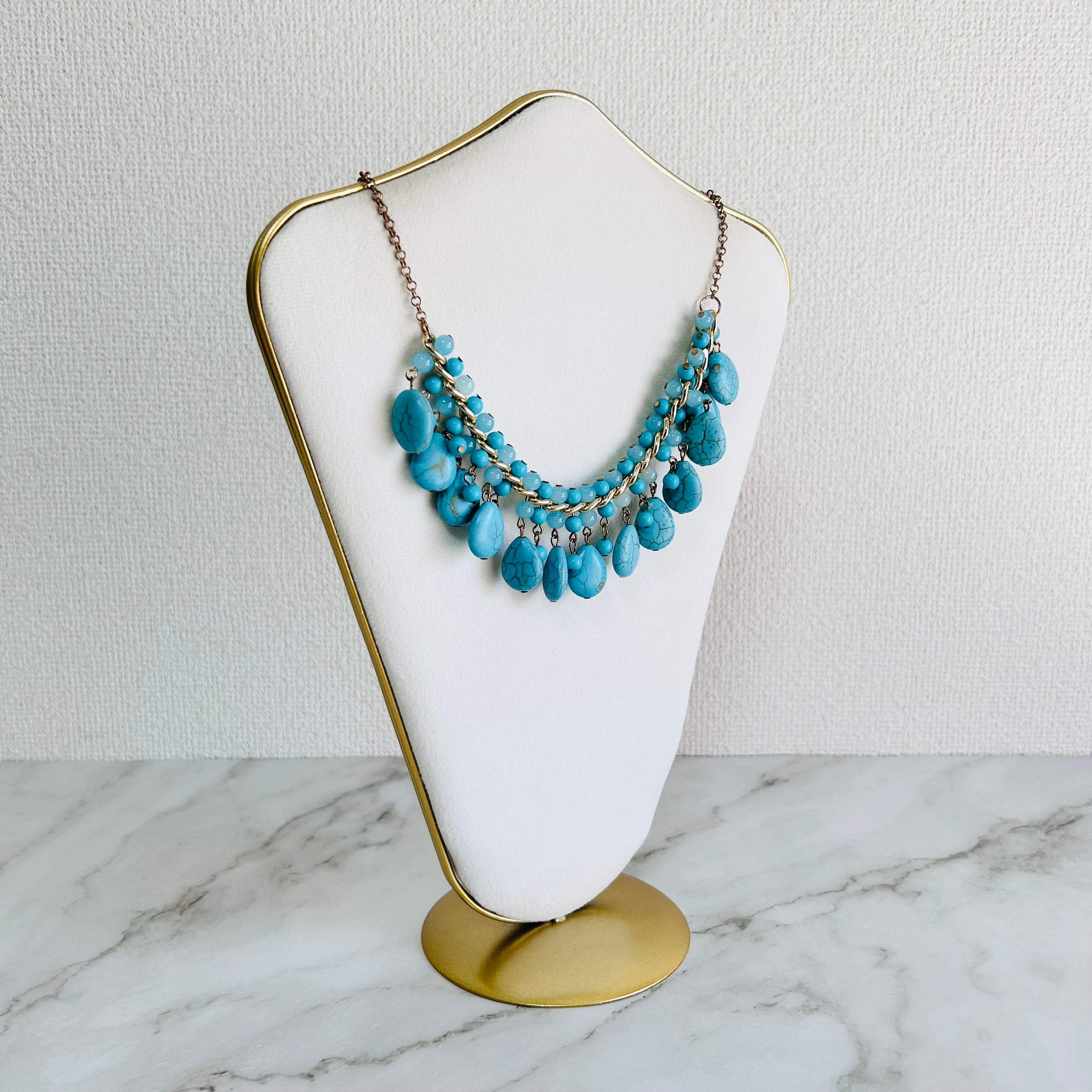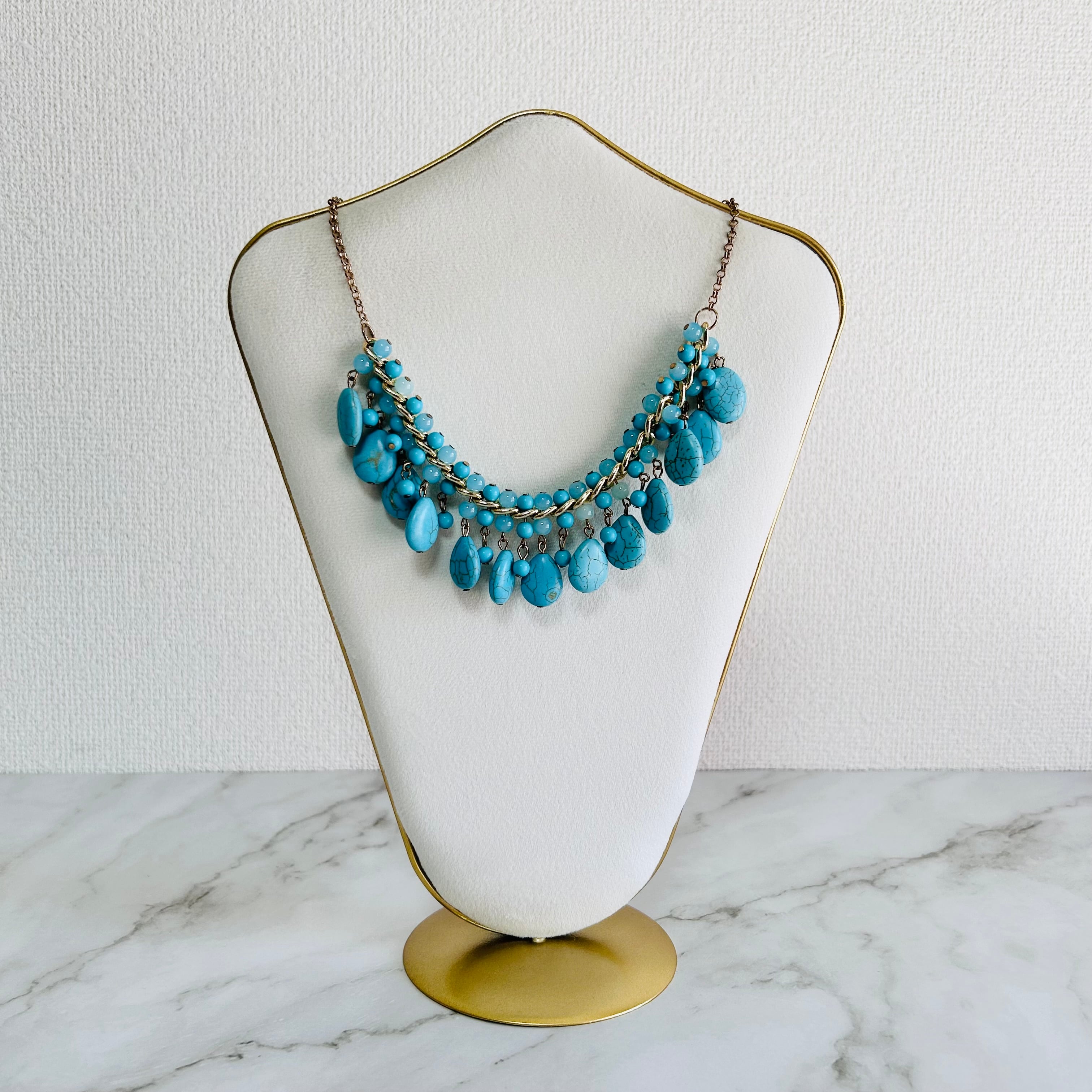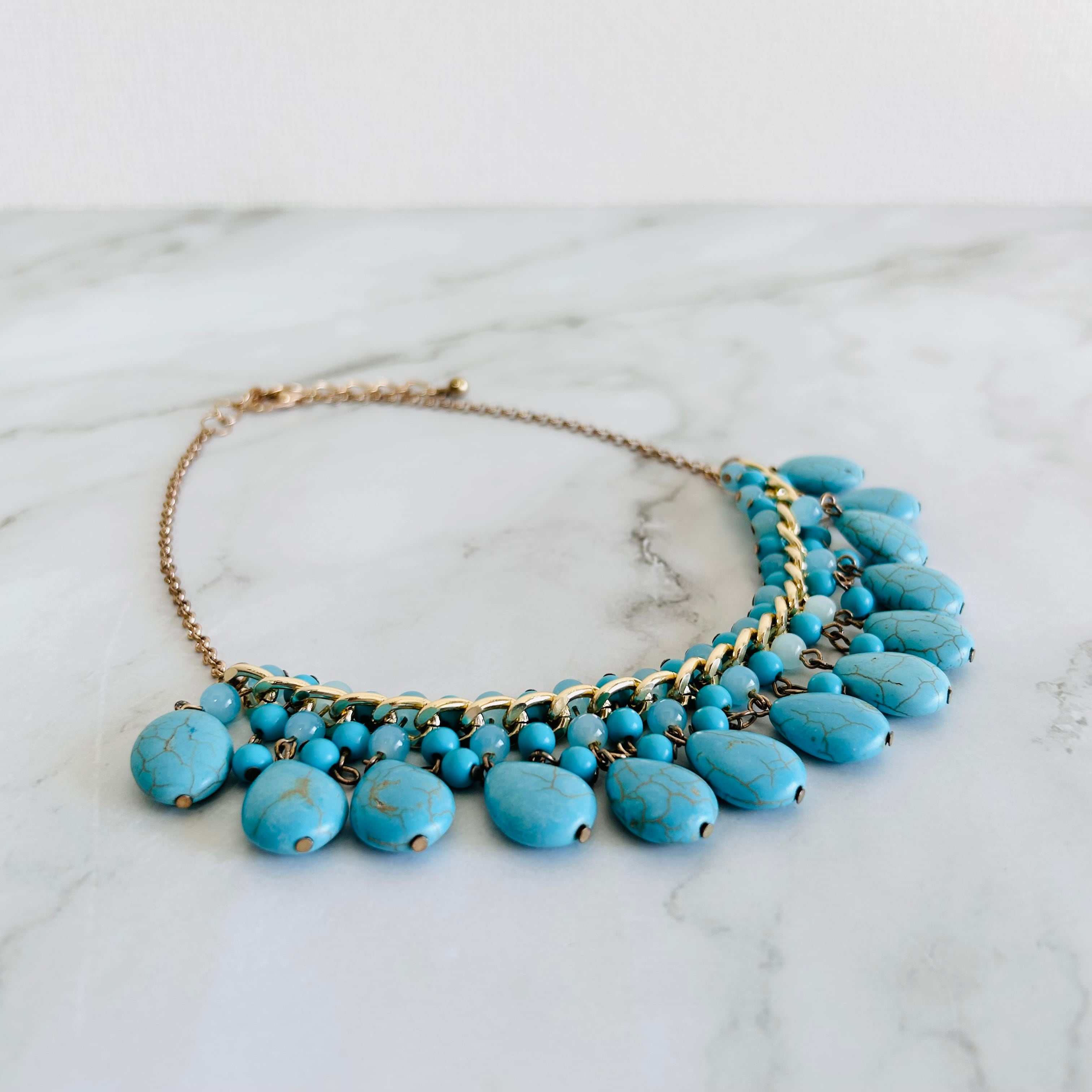 ターコイズカラーで統一したドロップ型のストーンとビーズパーツを贅沢にあしらったネックレス。