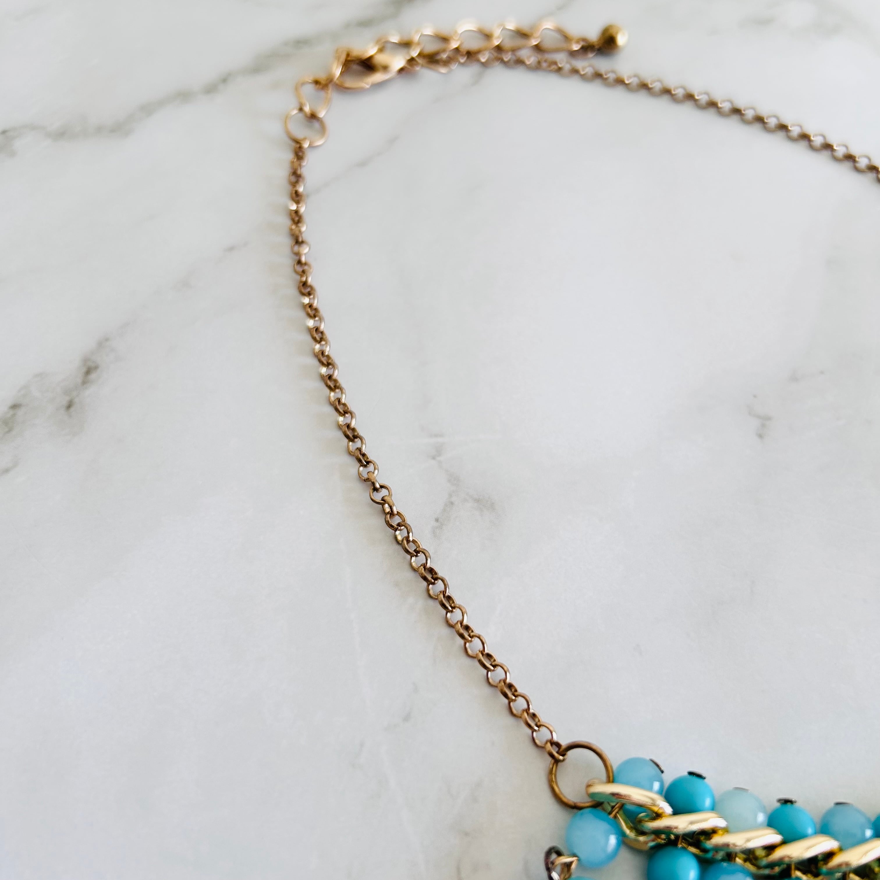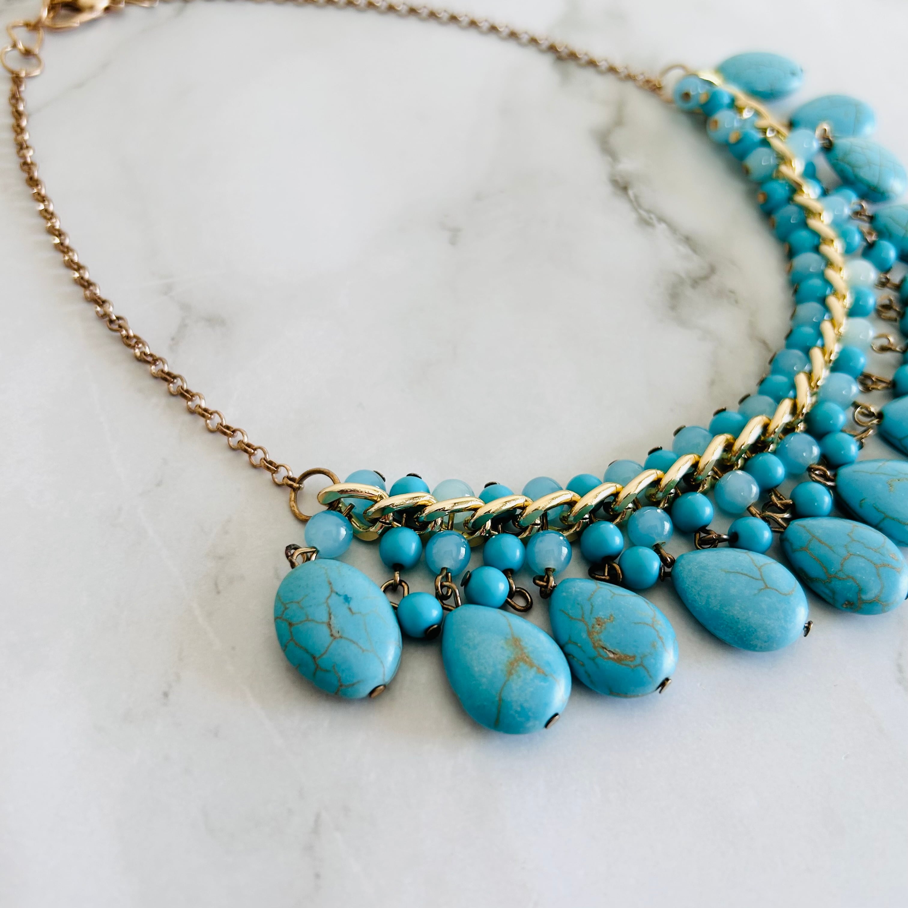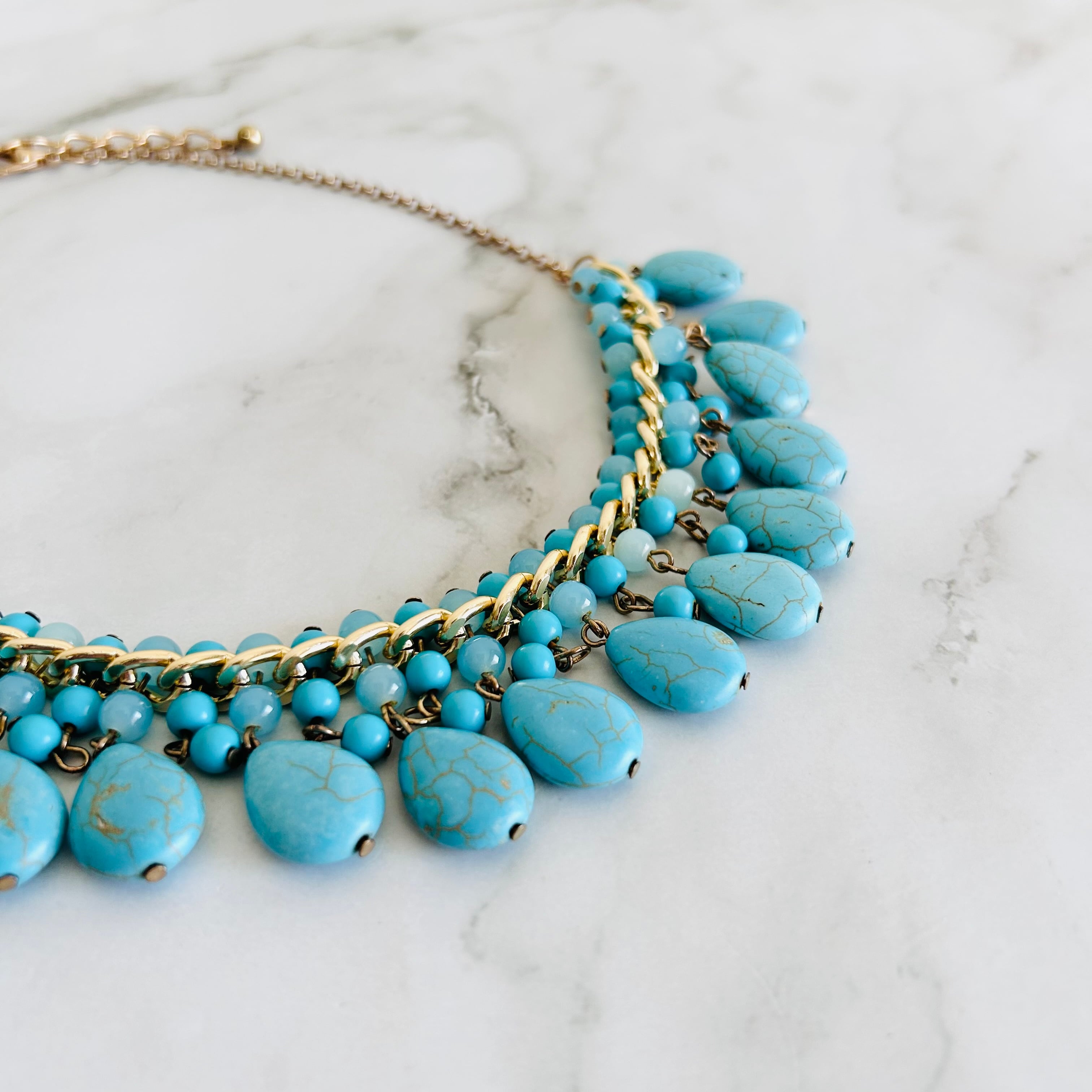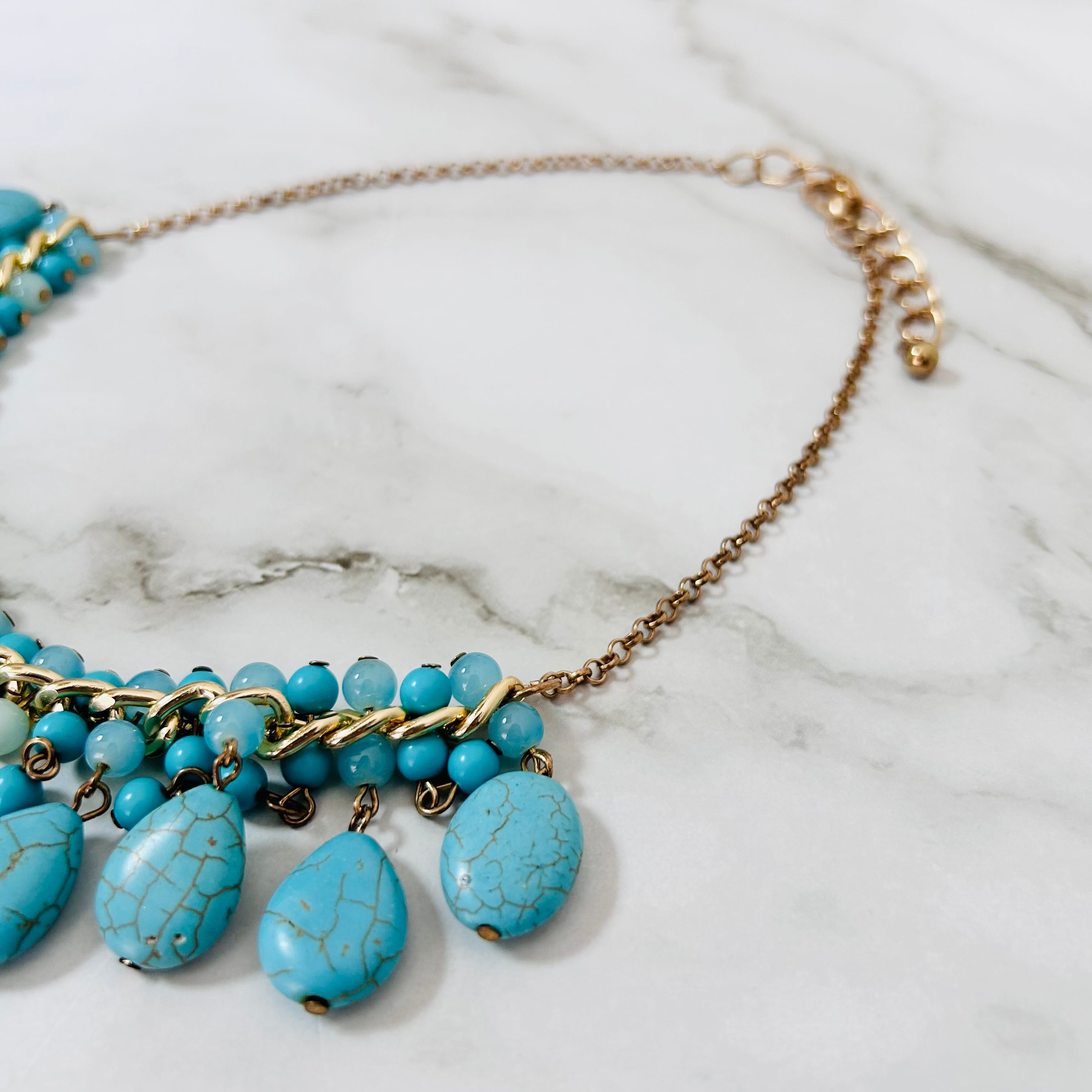 ターコイズカラーで統一したドロップ型のストーンとビーズパーツを贅沢にあしらったネックレス。