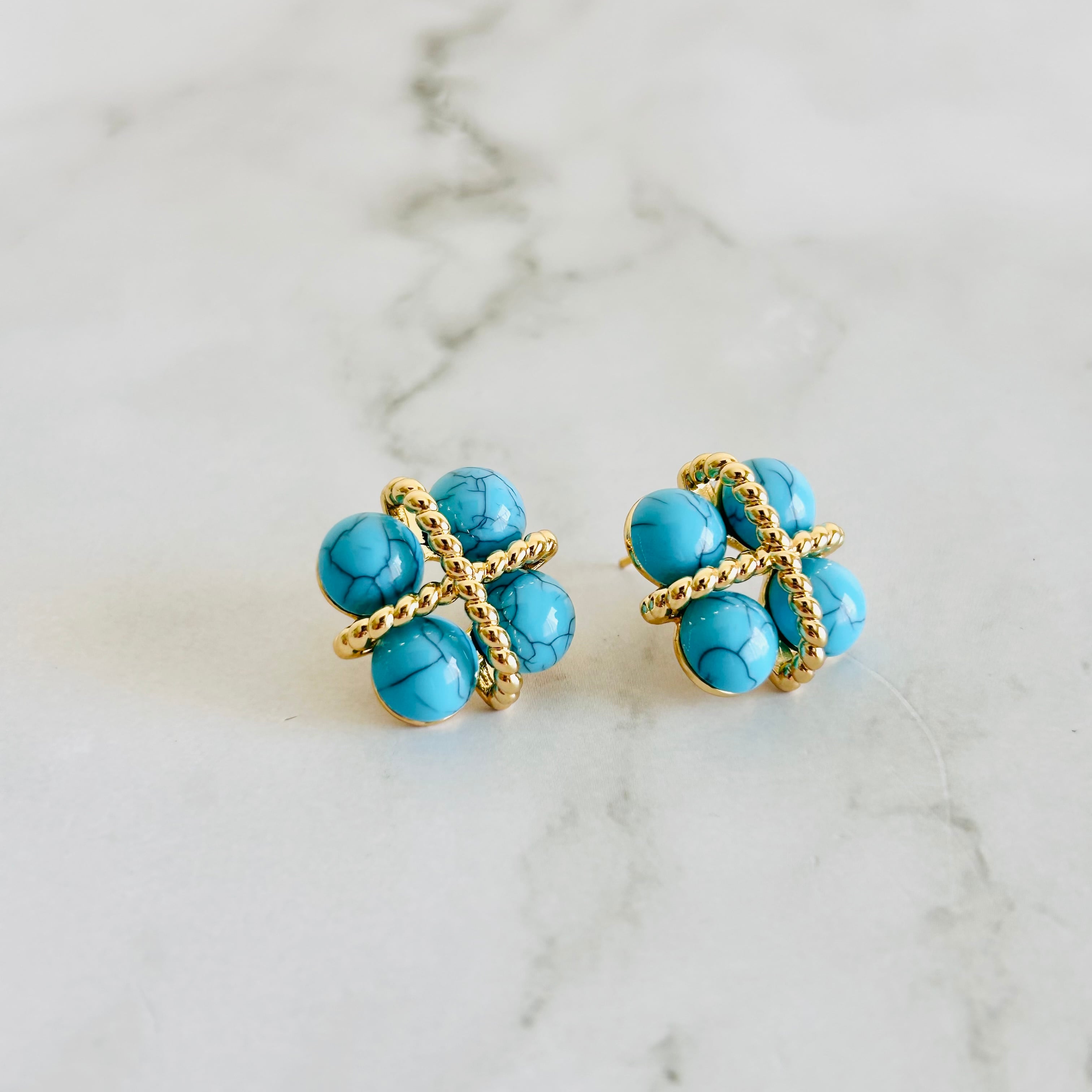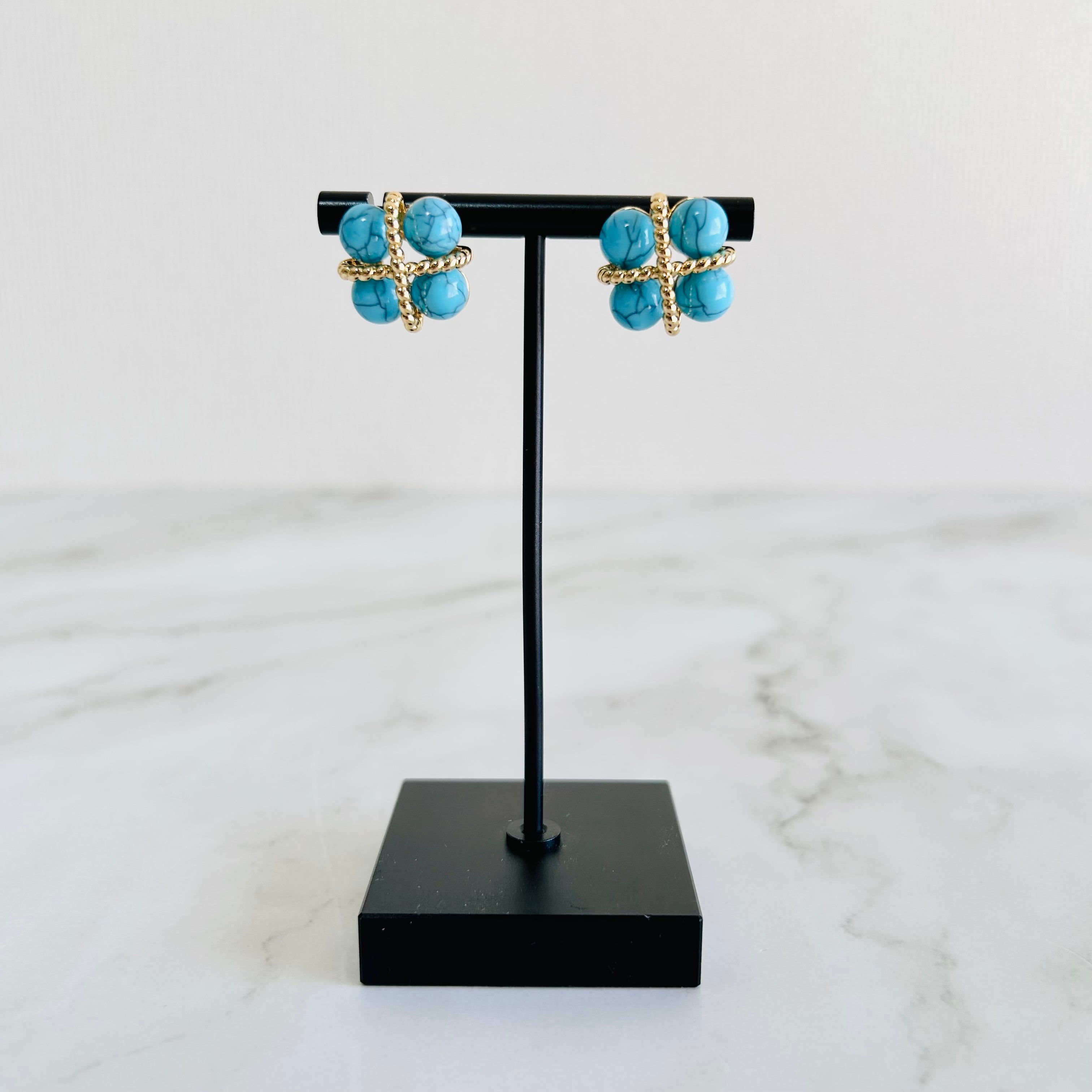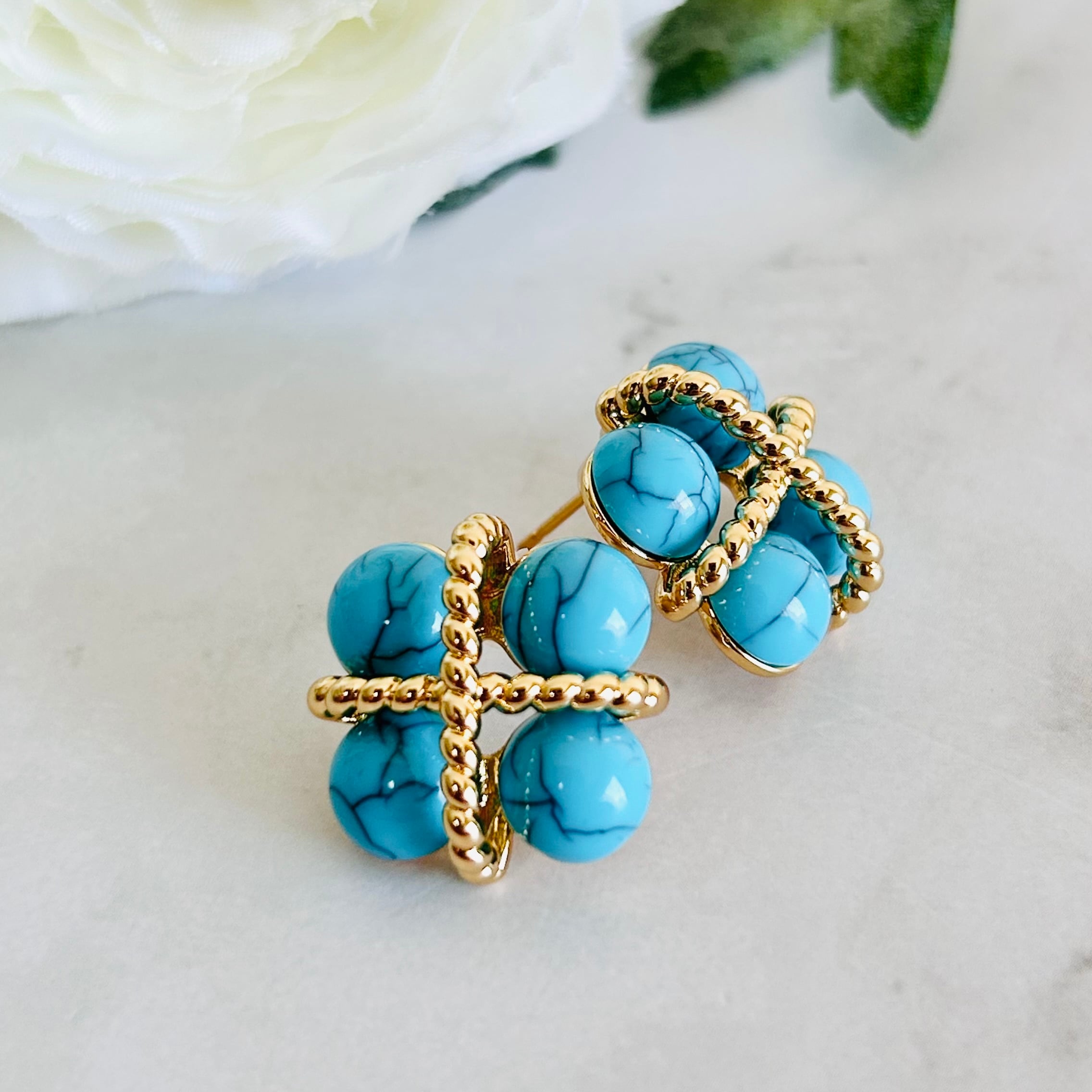 ターコイズカラーのビーズをあしらった、立体感のあるデザインのピアス/イヤリング。