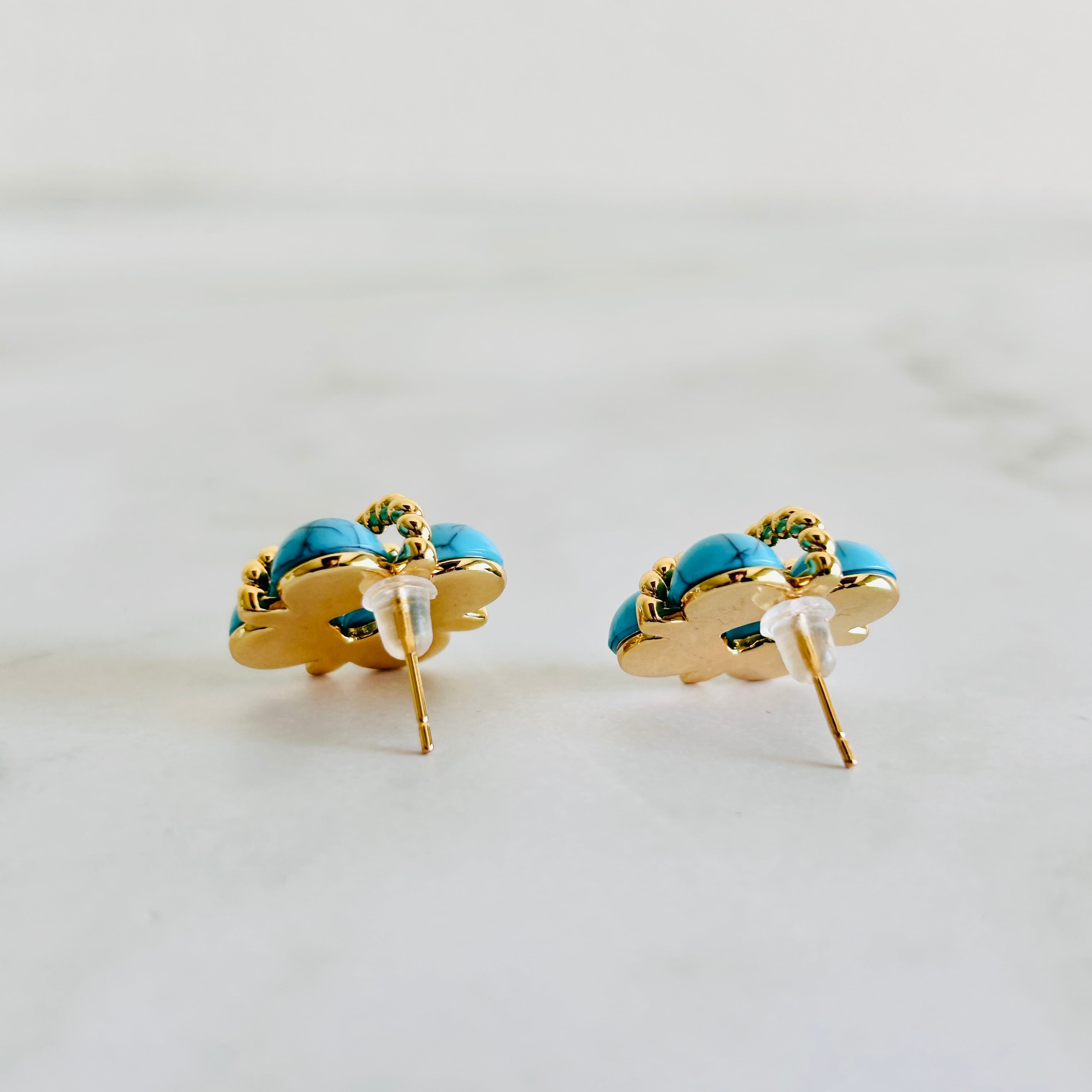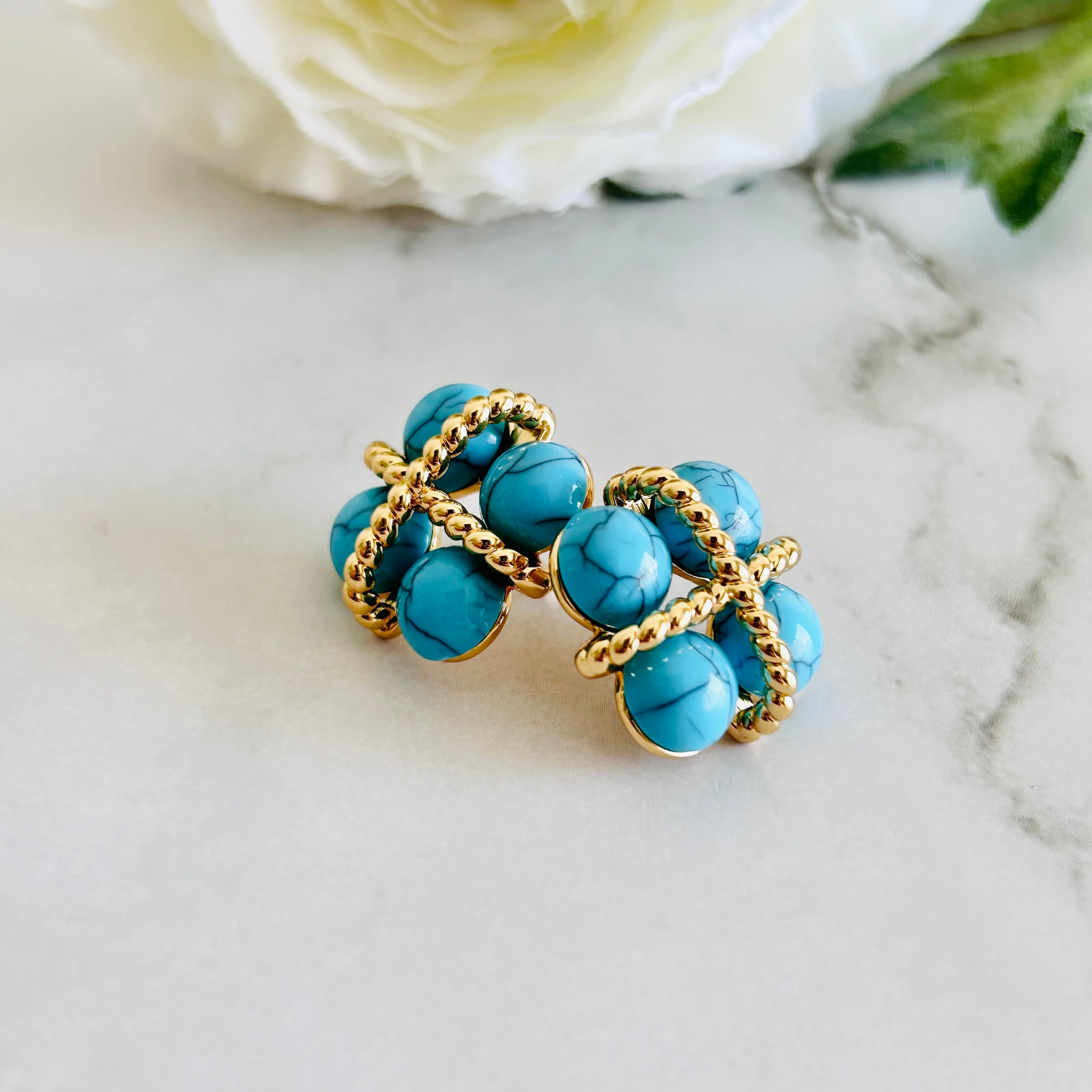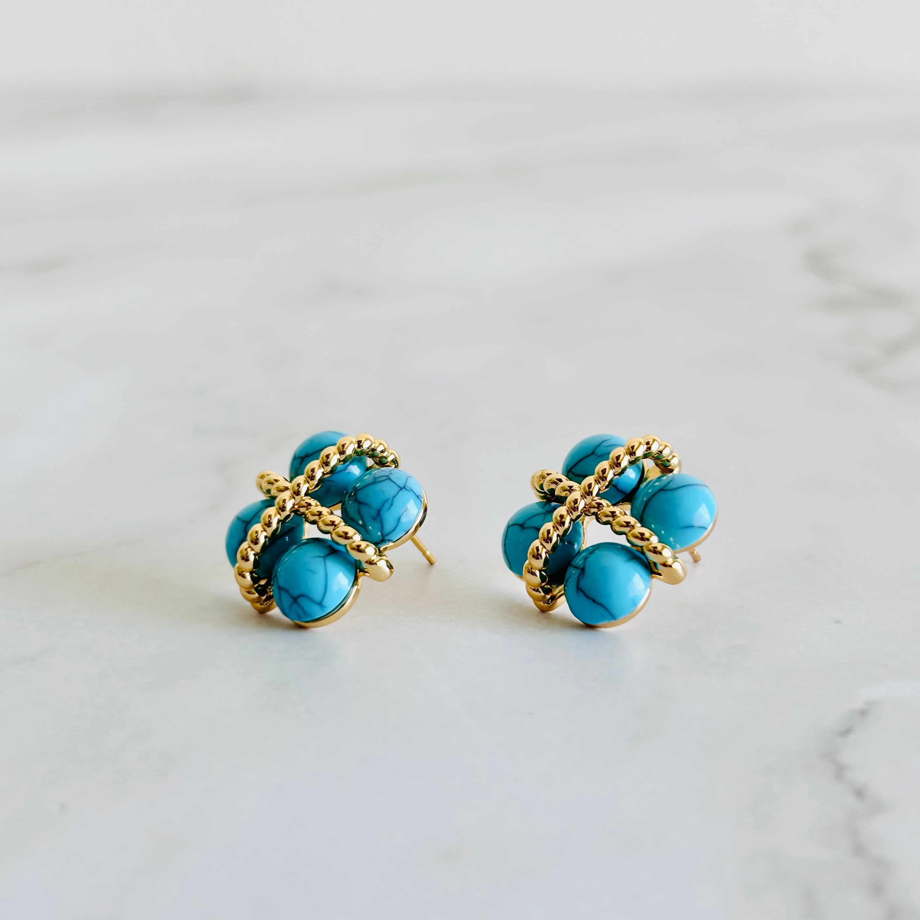 ターコイズカラーのビーズをあしらった、立体感のあるデザインのピアス/イヤリング。